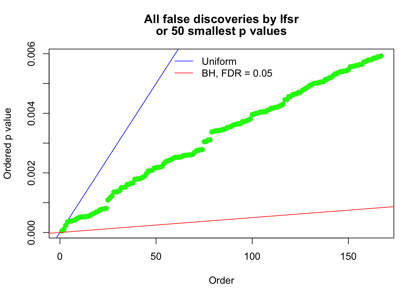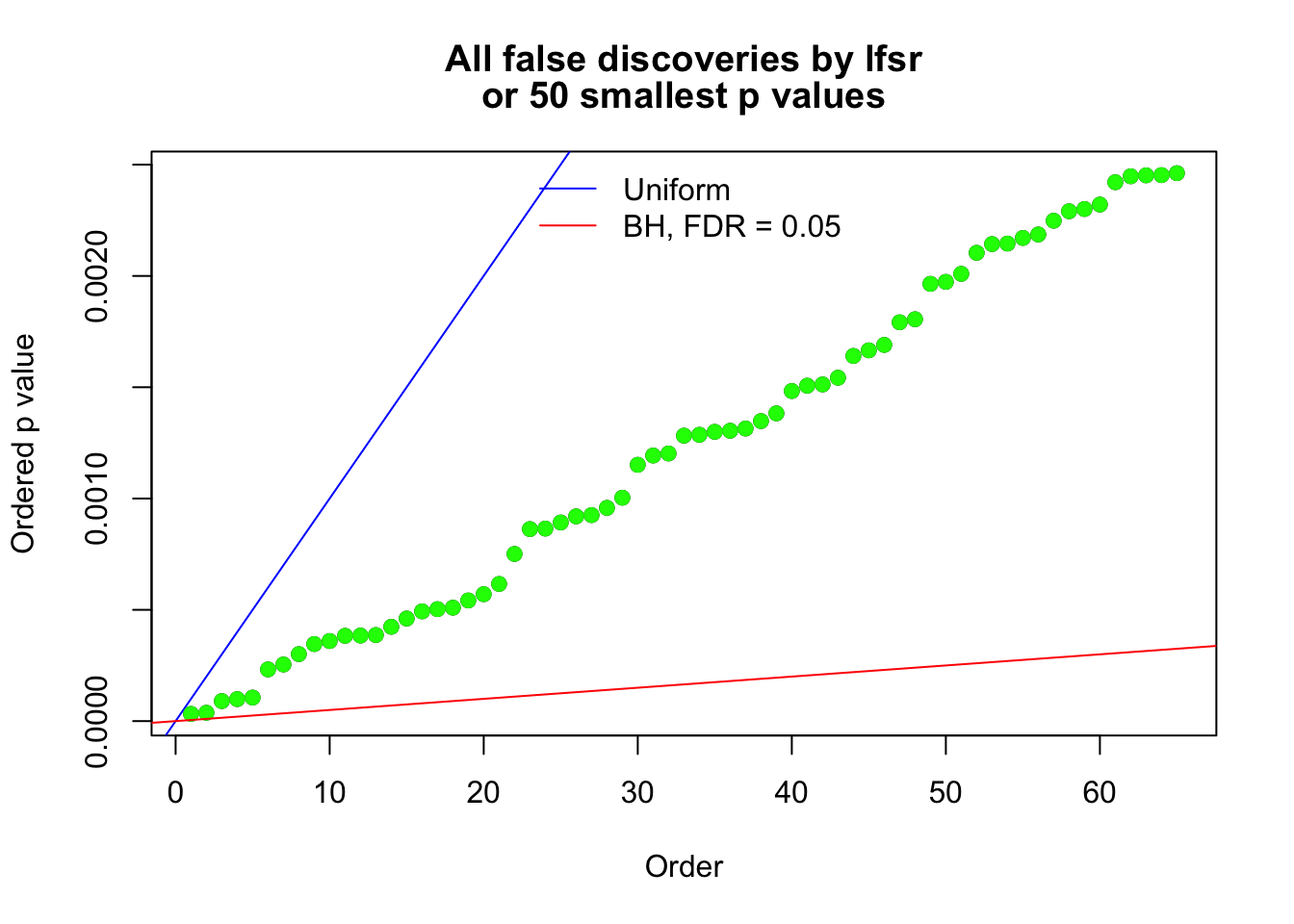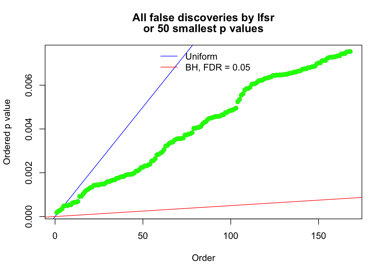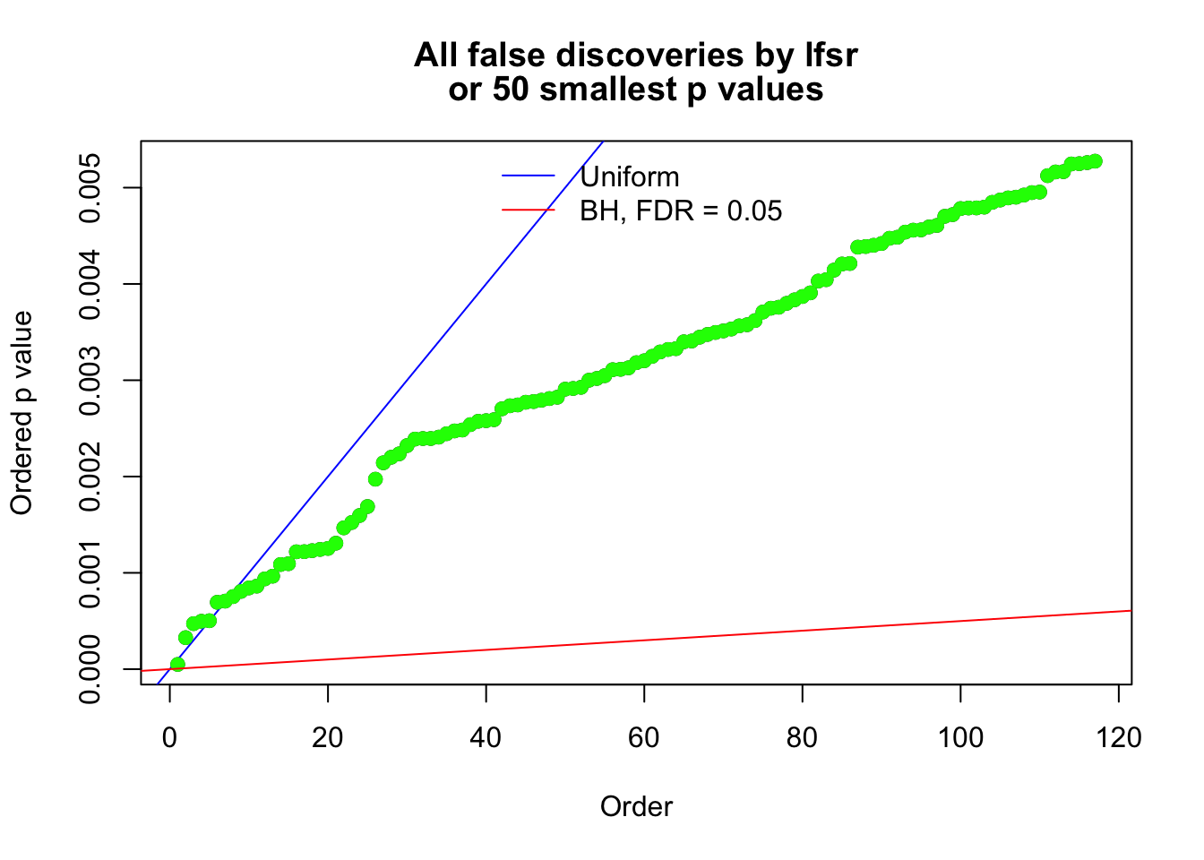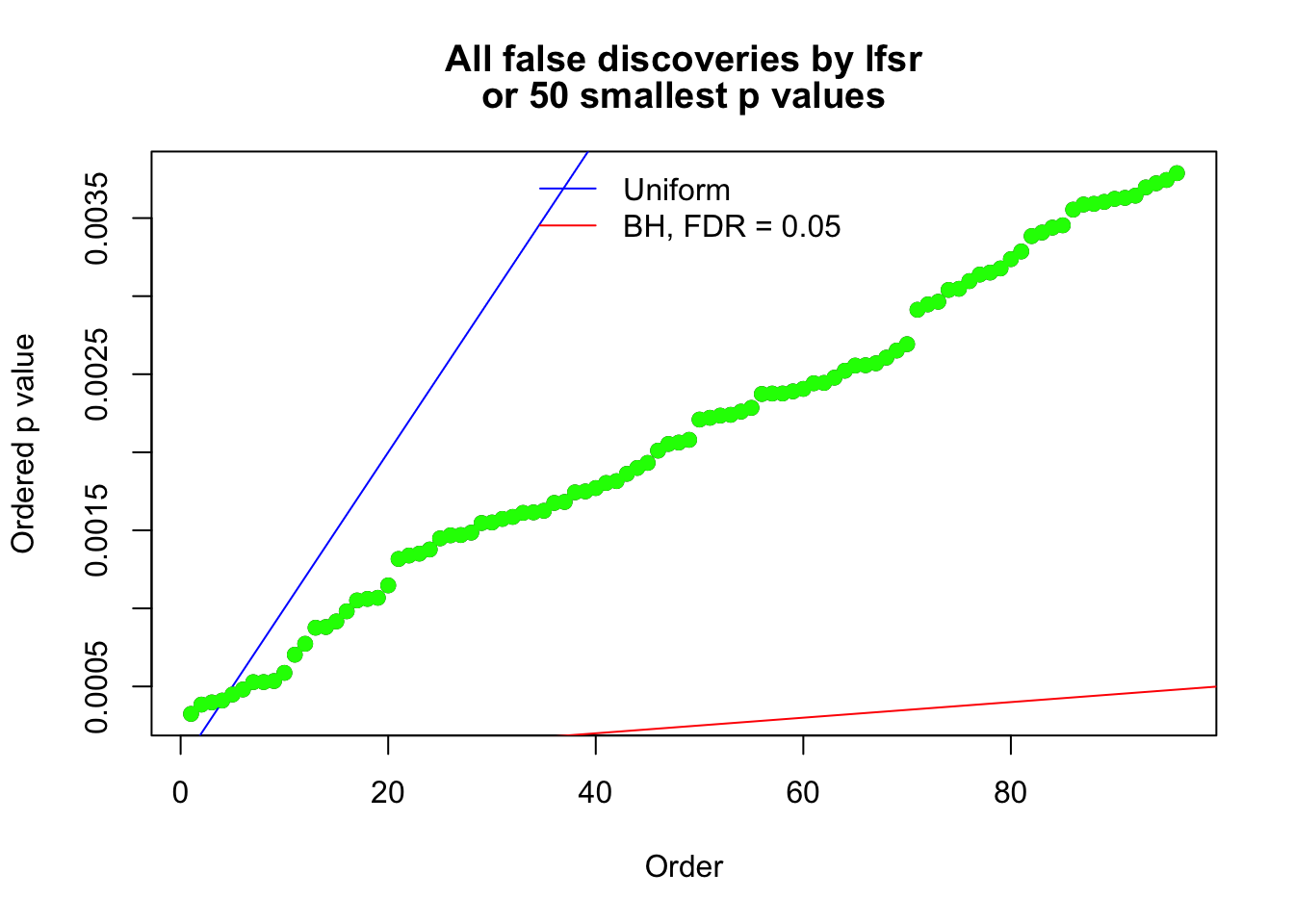 N0. 97 : Data Set 487 ; Number of False Discoveries by BH: 0 ; Number of False Discoveries by ASH's lfsr: 3 ; pihat0 = 0.3311973