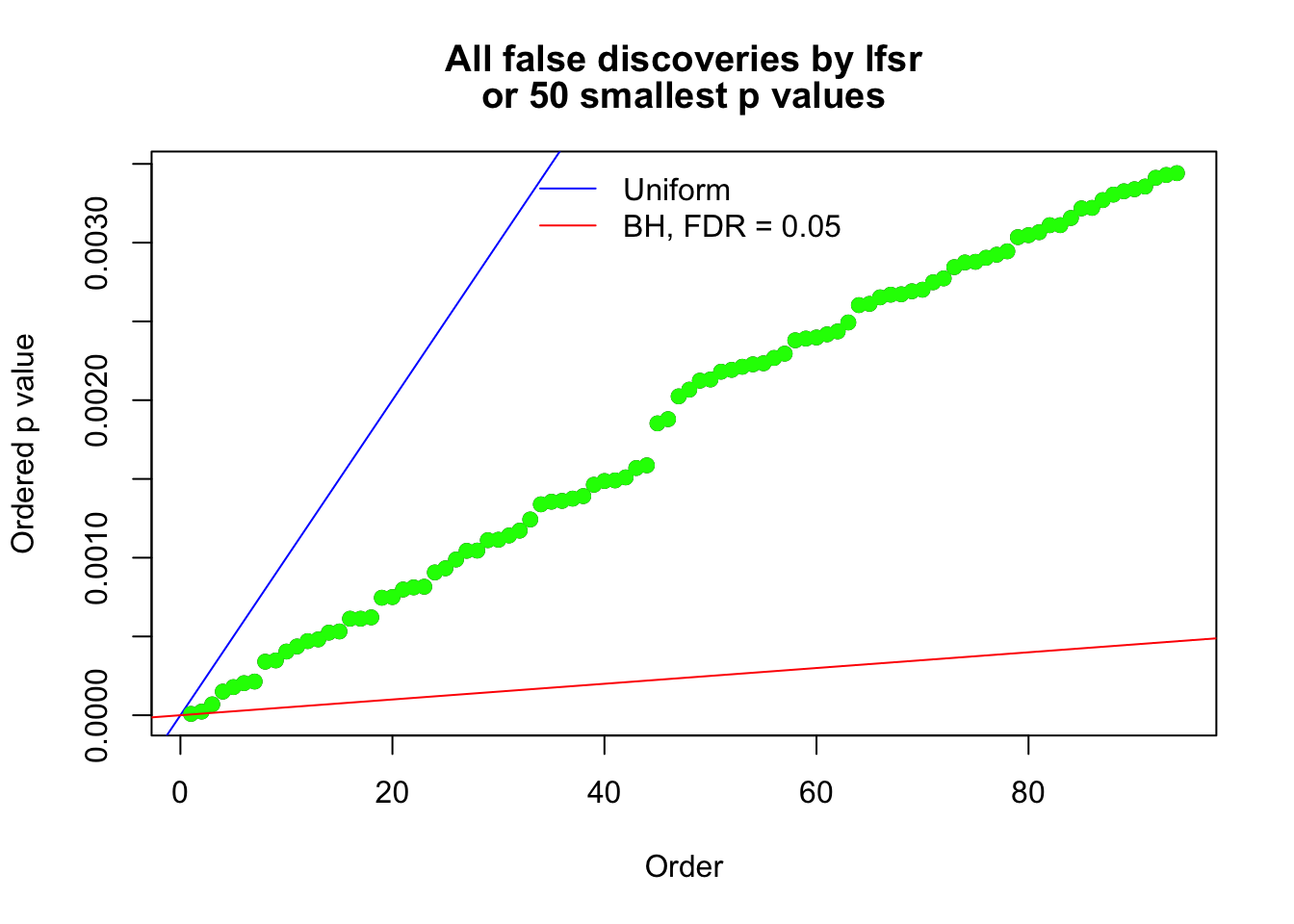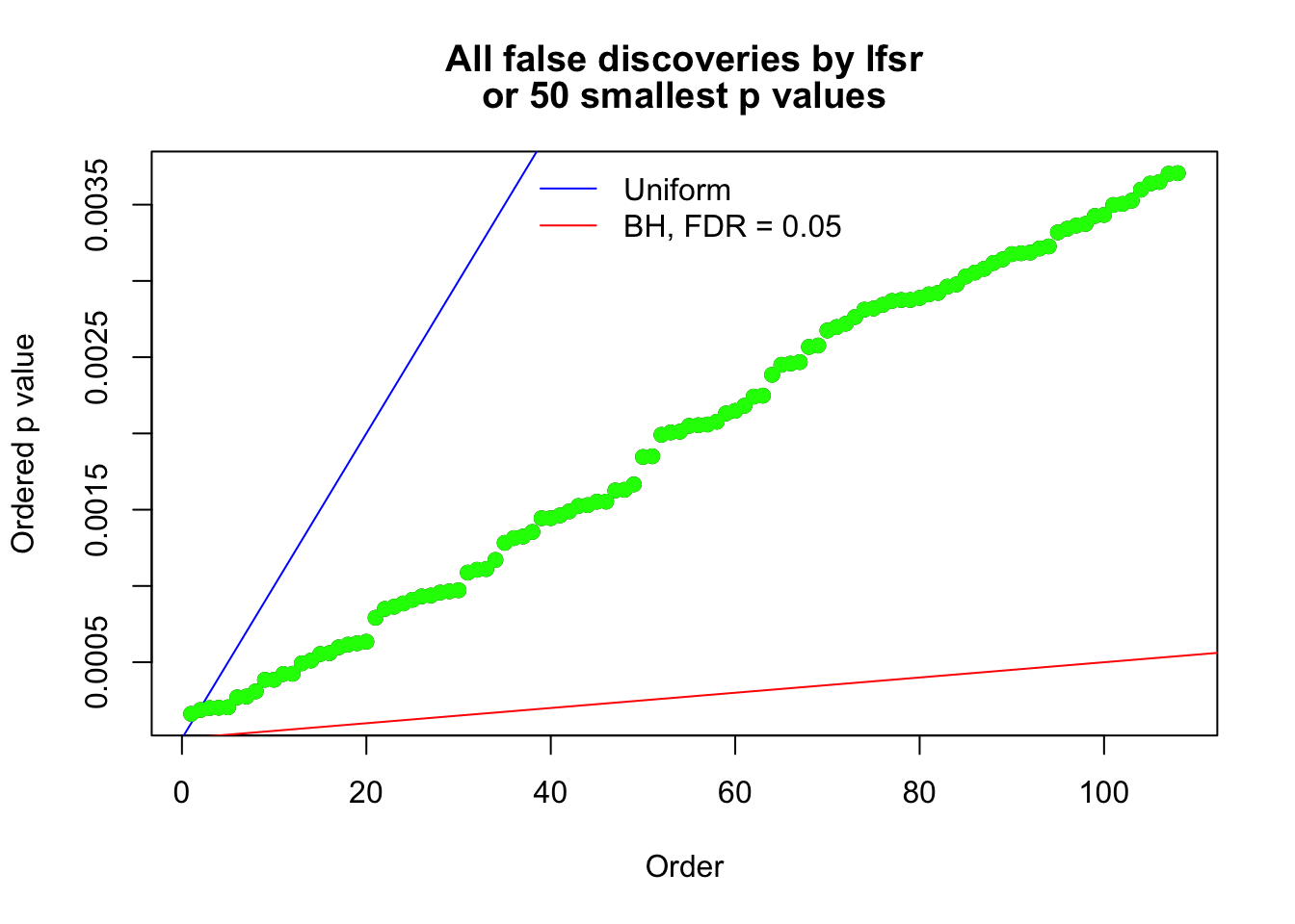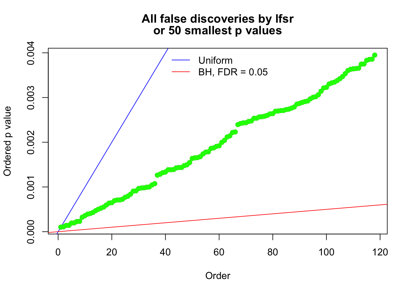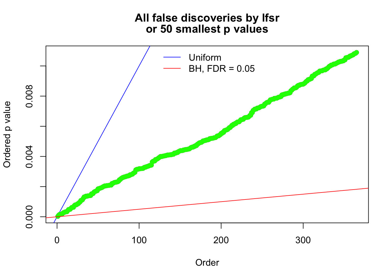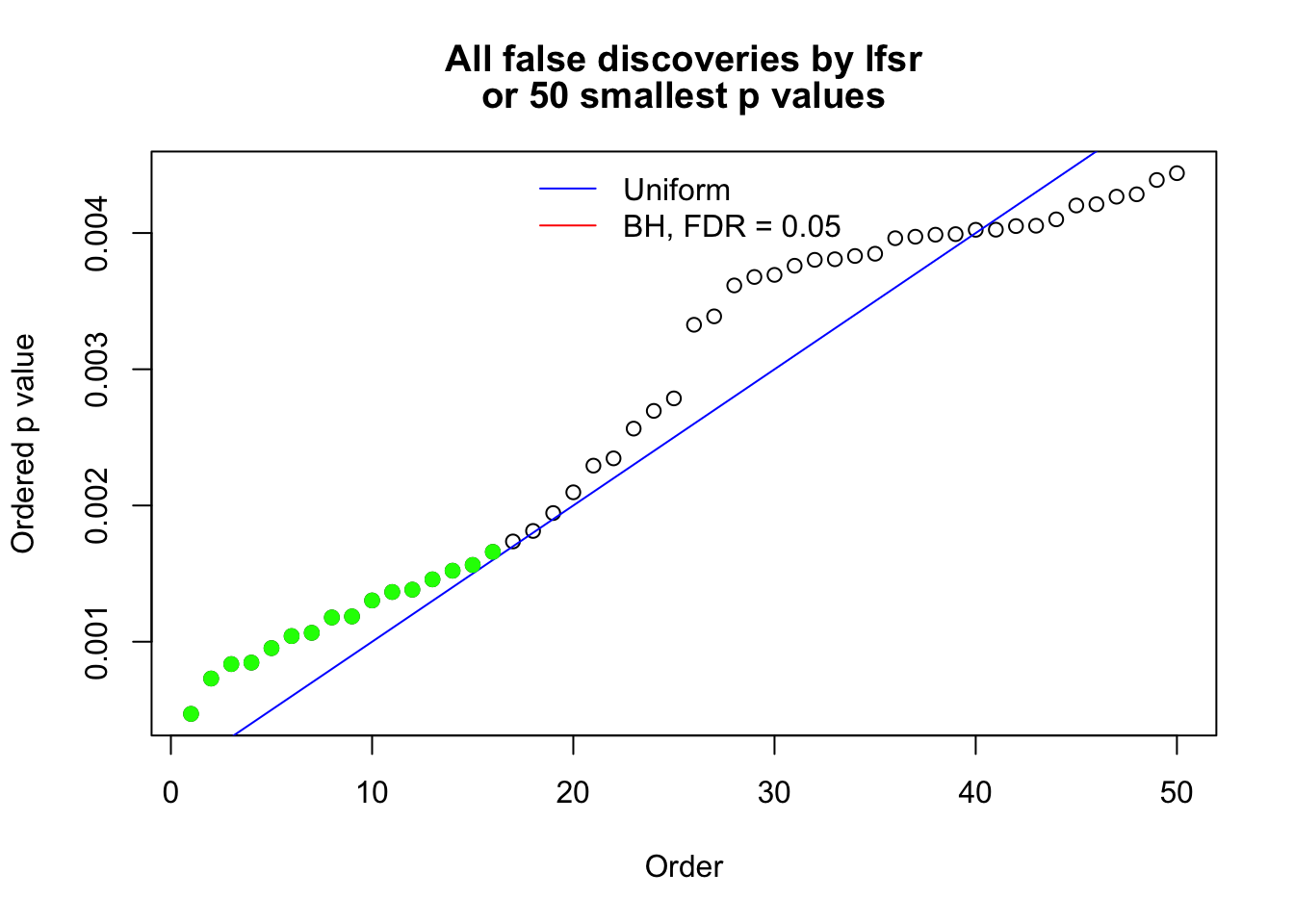 N0. 97 : Data Set 487 ; Number of False Discoveries by BH: 0 ; Number of False Discoveries by ASH's lfsr: 3 ; pihat0 = 0.3311973
