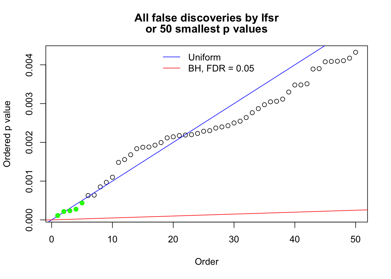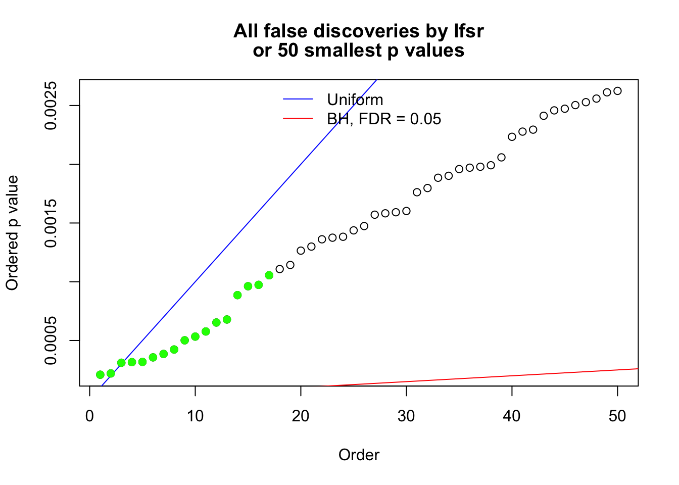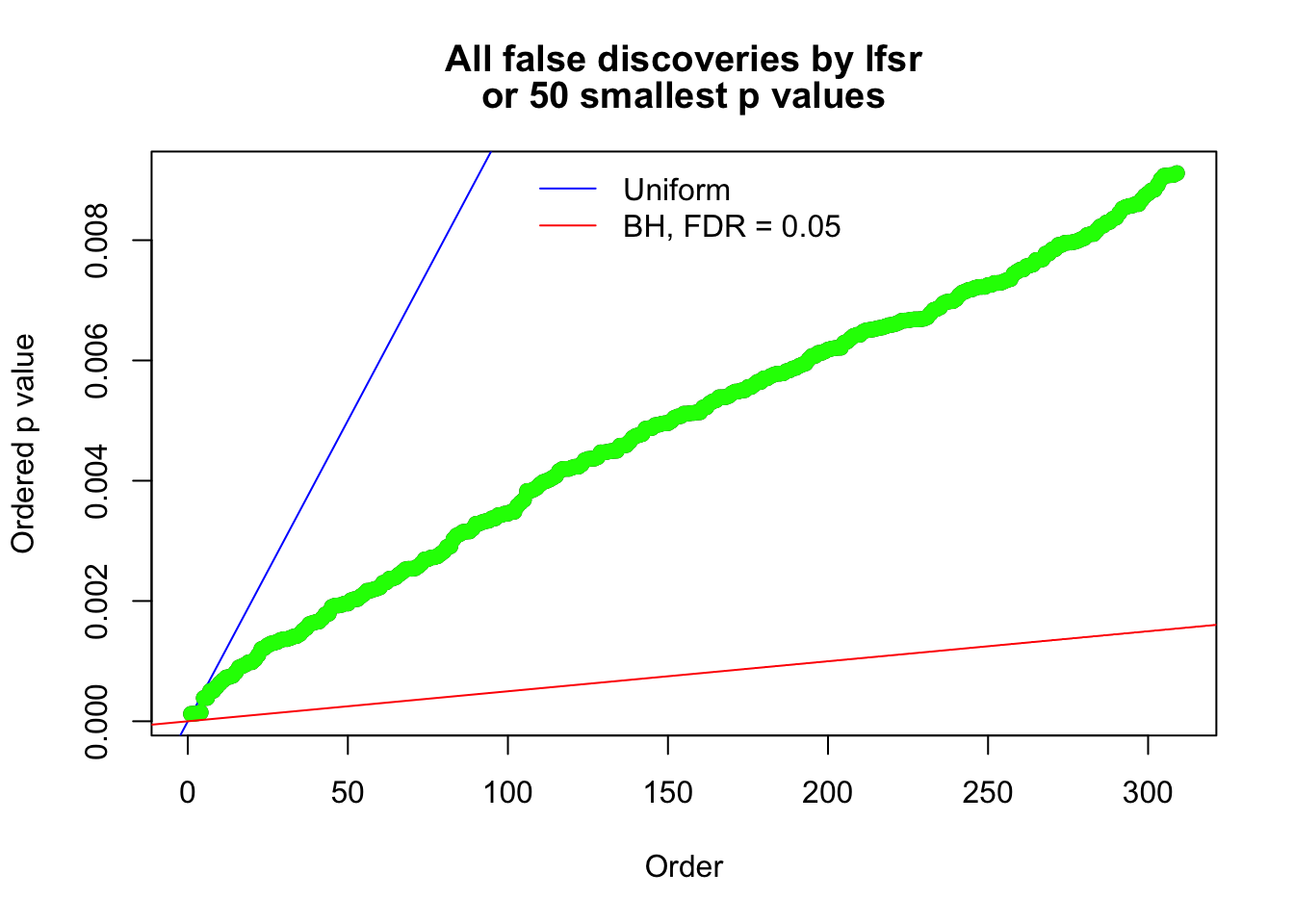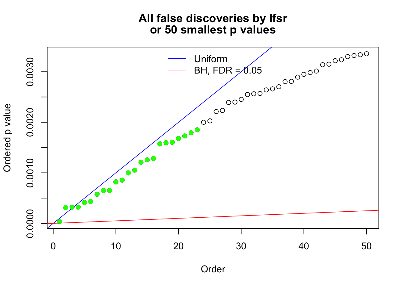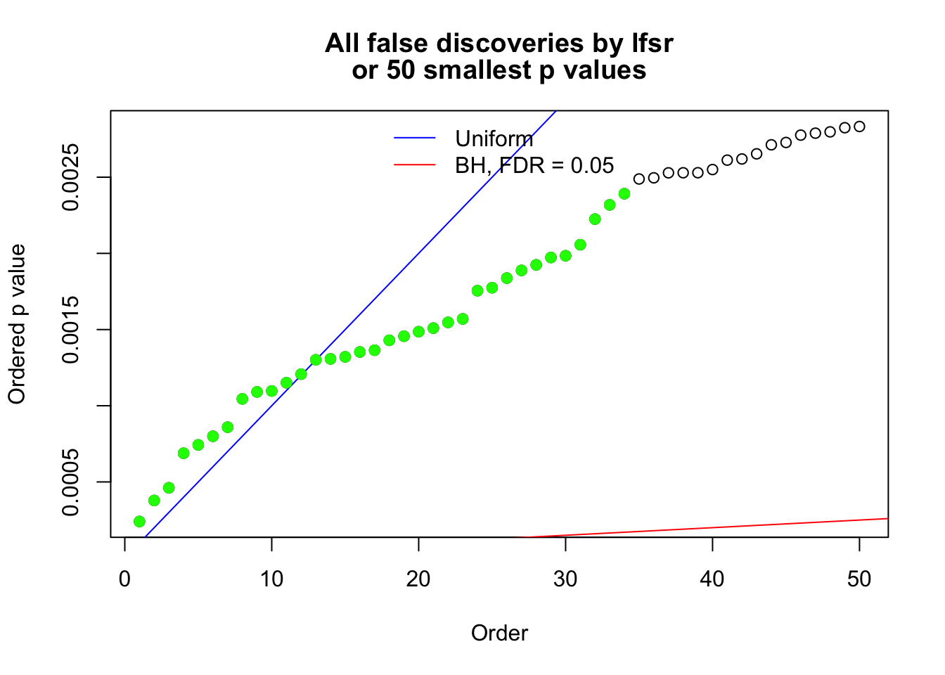 N0. 97 : Data Set 487 ; Number of False Discoveries by BH: 0 ; Number of False Discoveries by ASH's lfsr: 3 ; pihat0 = 0.3311973