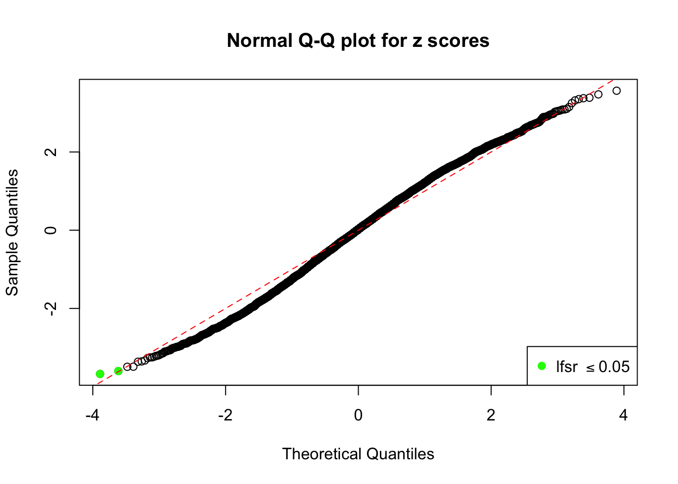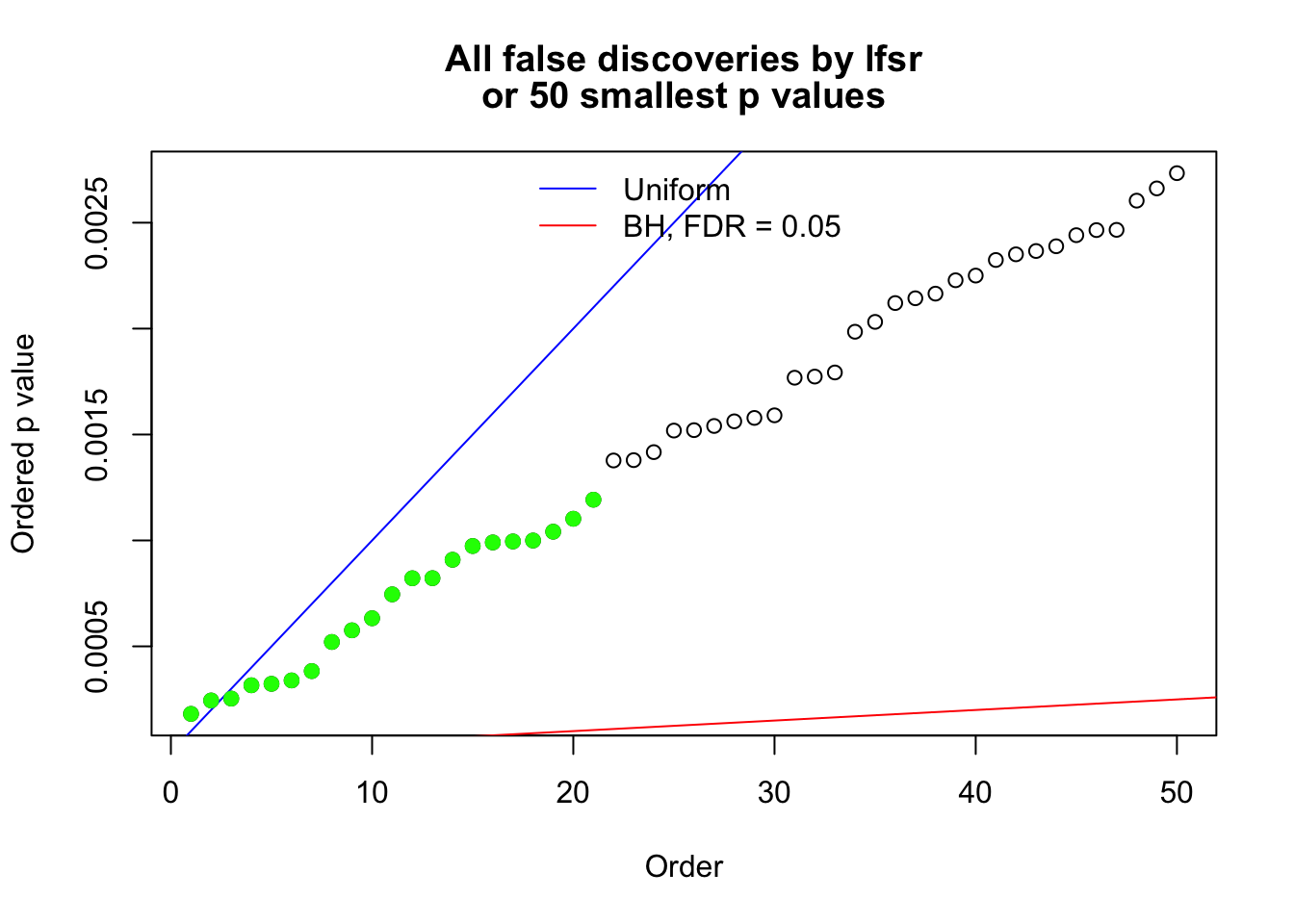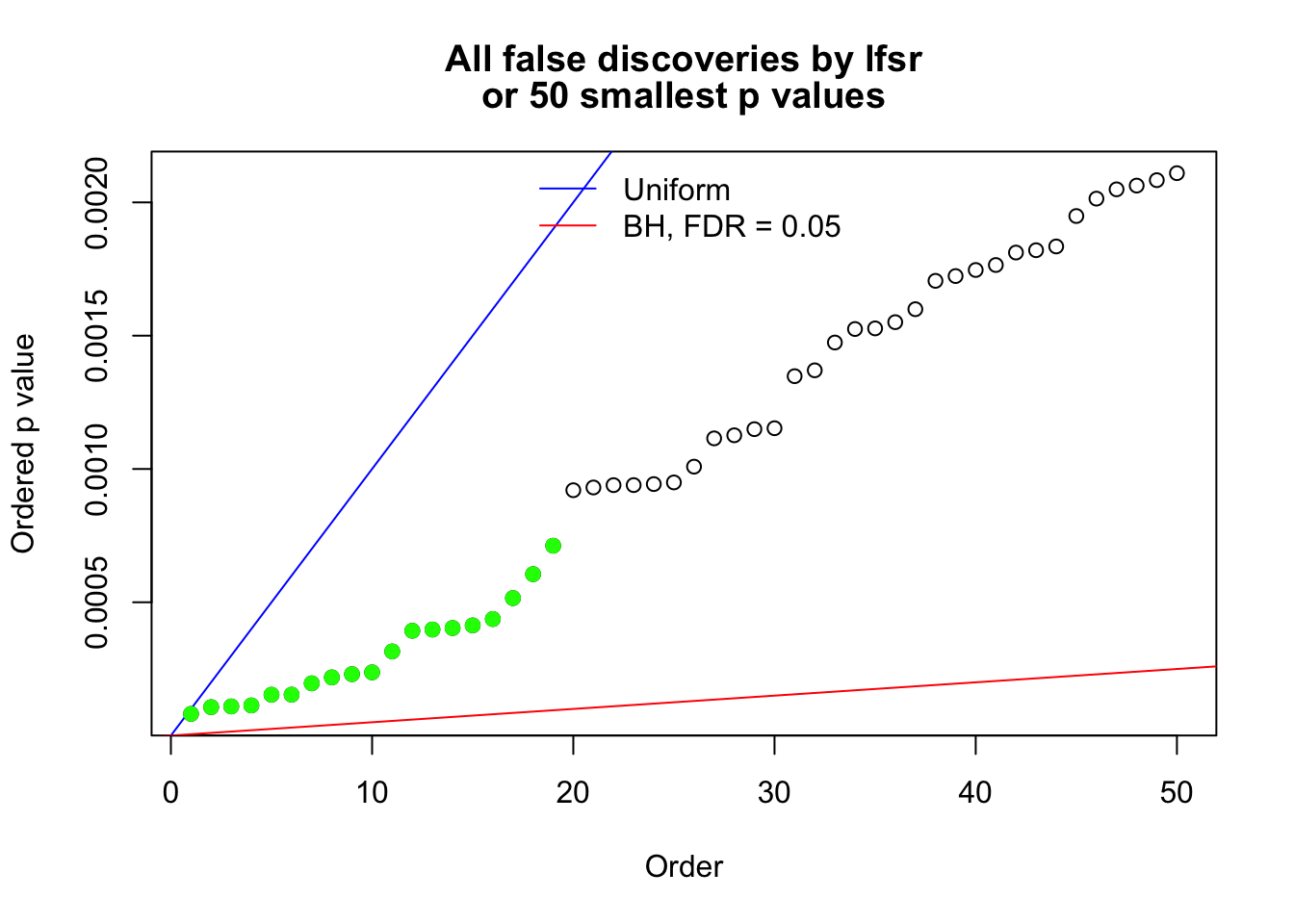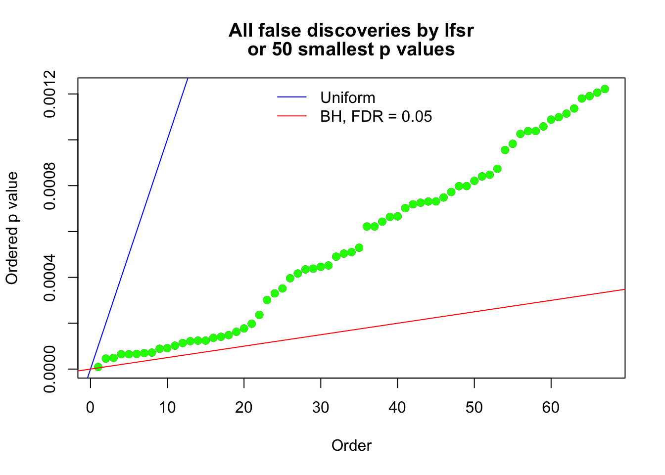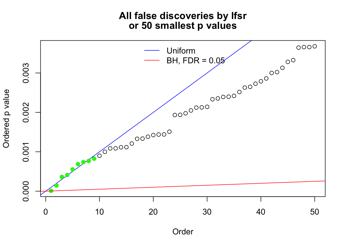 N0. 97 : Data Set 487 ; Number of False Discoveries by BH: 0 ; Number of False Discoveries by ASH's lfsr: 3 ; pihat0 = 0.3311973