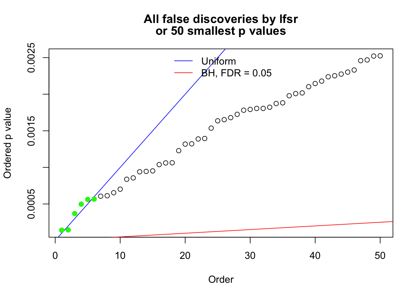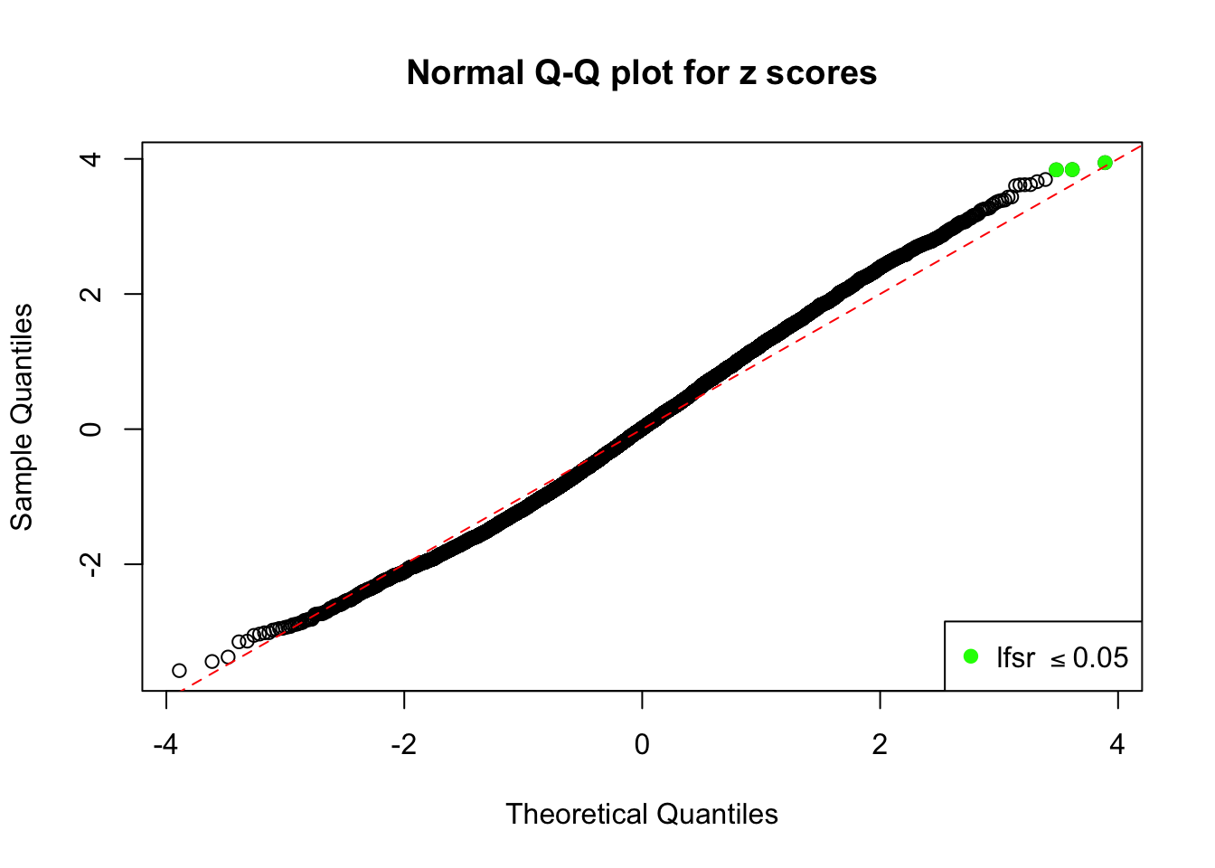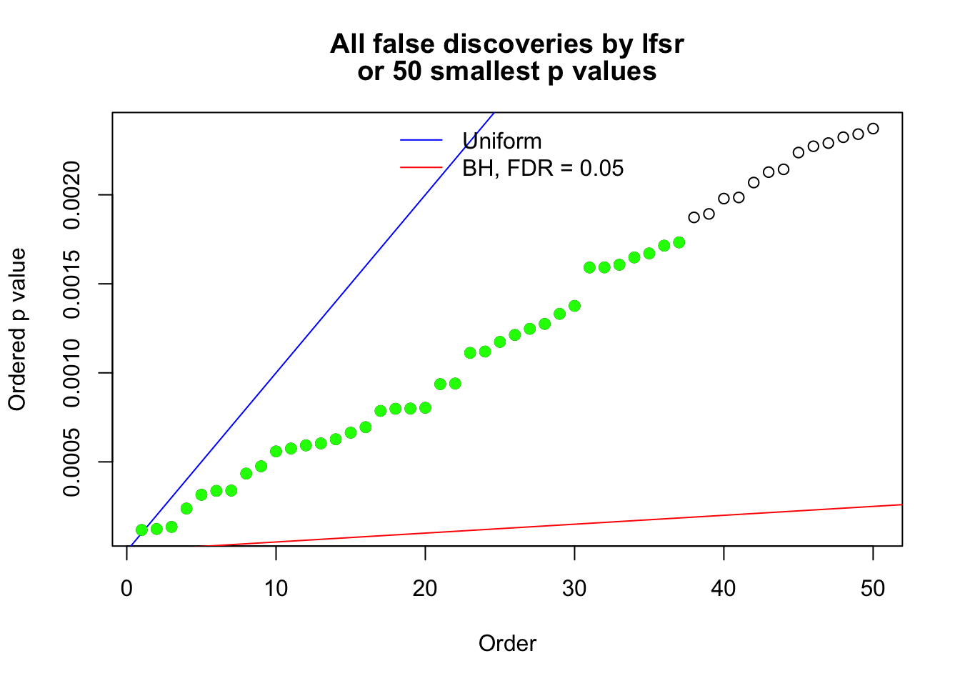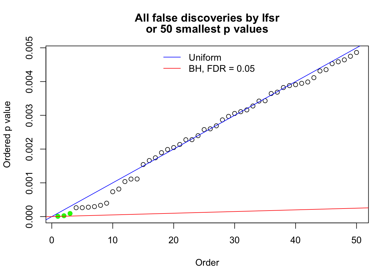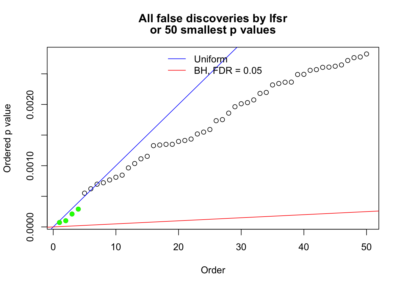 N0. 97 : Data Set 487 ; Number of False Discoveries by BH: 0 ; Number of False Discoveries by ASH's lfsr: 3 ; pihat0 = 0.3311973