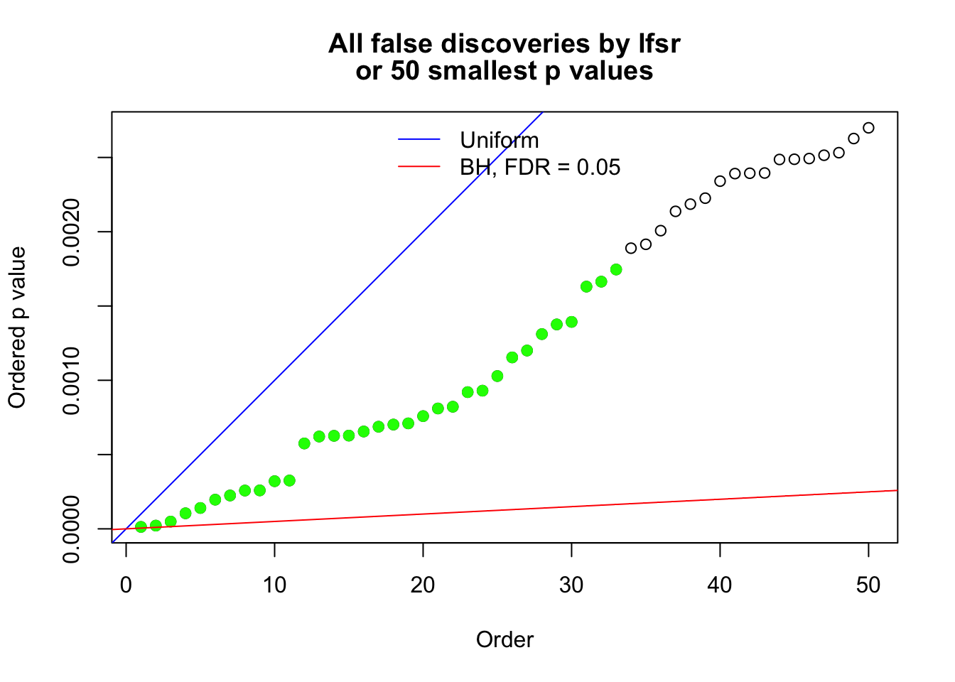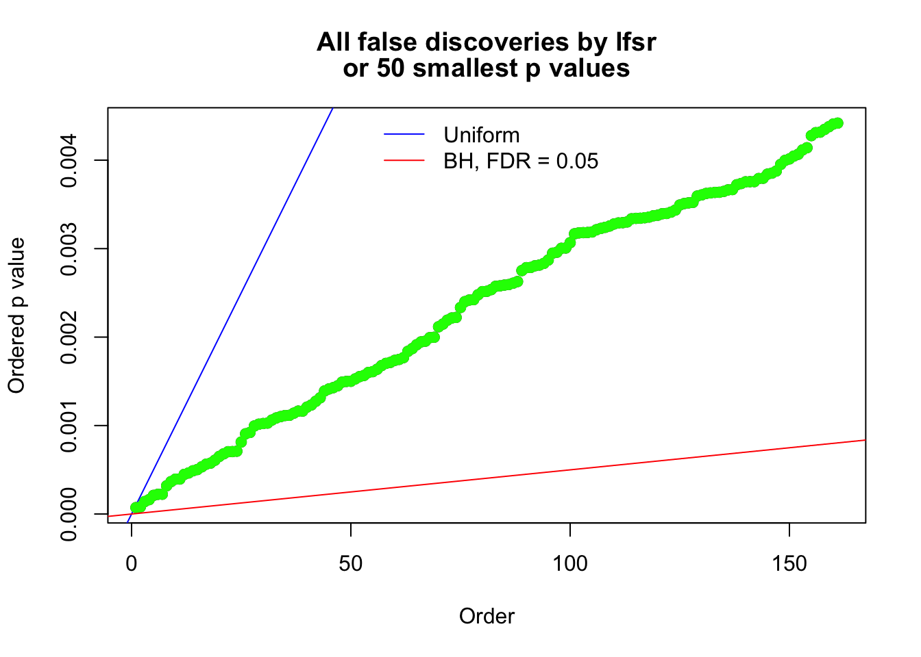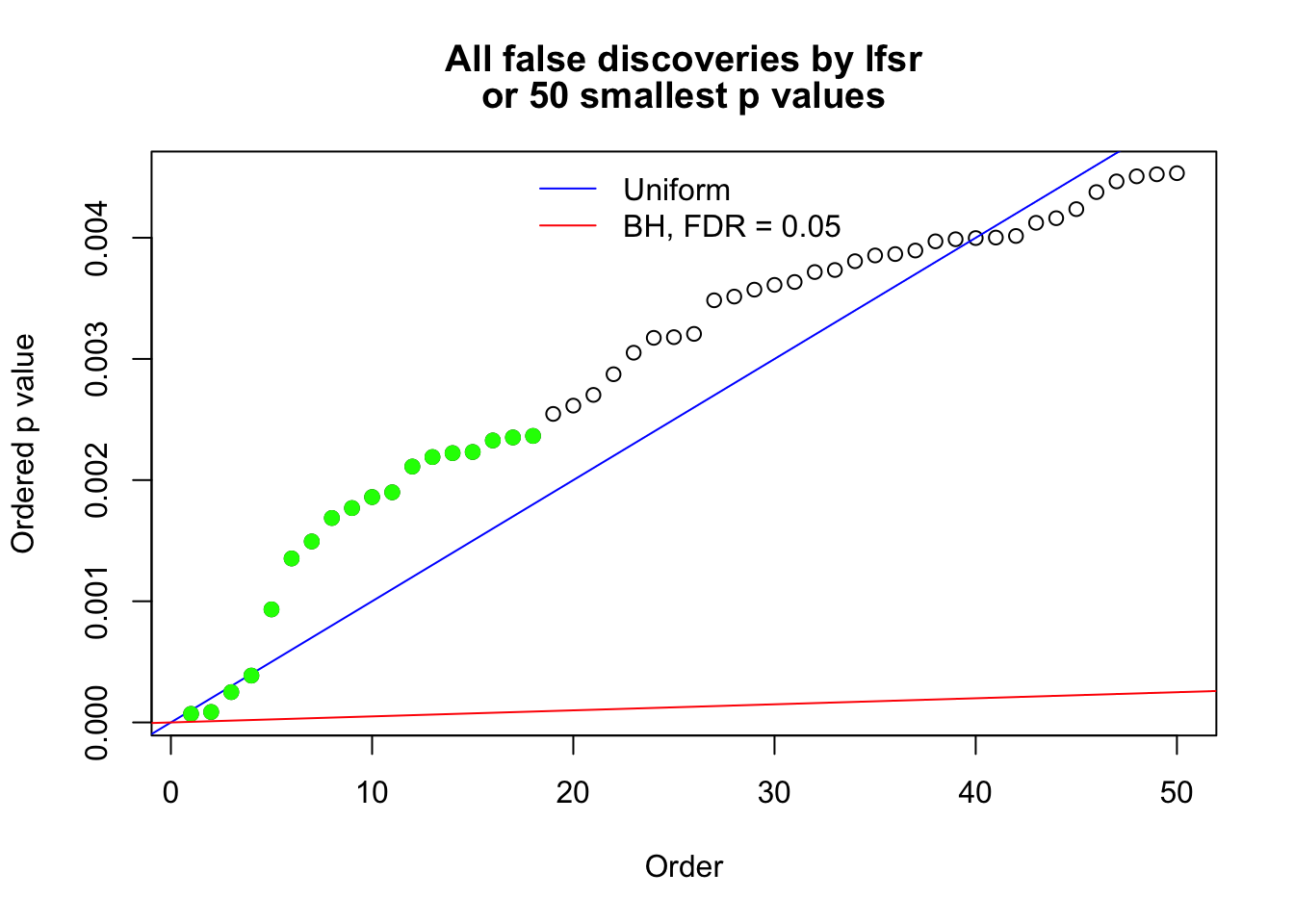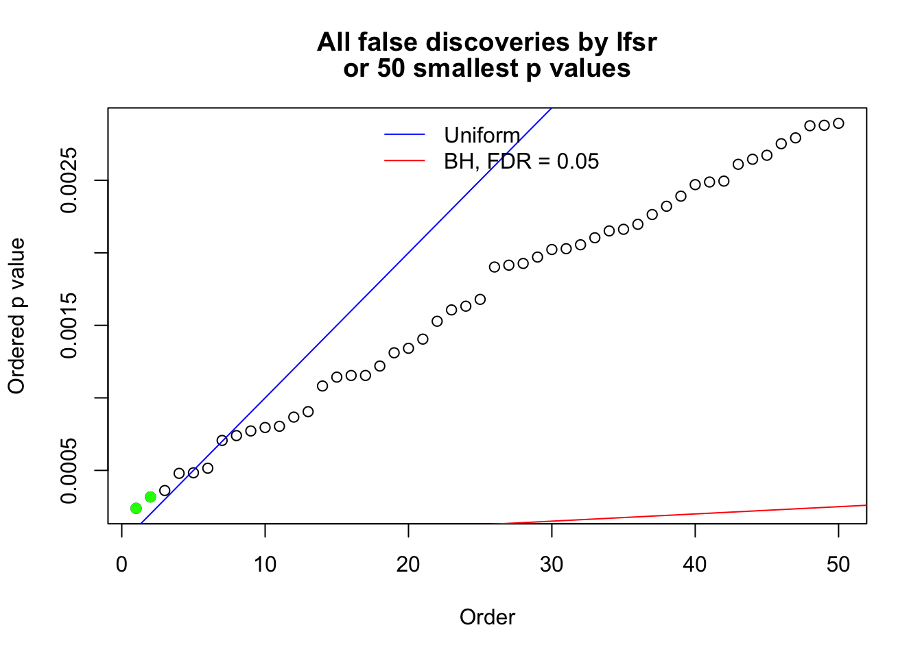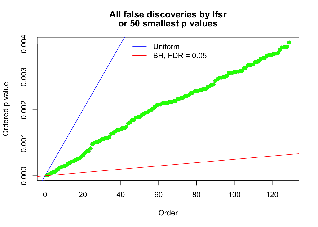 N0. 97 : Data Set 487 ; Number of False Discoveries by BH: 0 ; Number of False Discoveries by ASH's lfsr: 3 ; pihat0 = 0.3311973