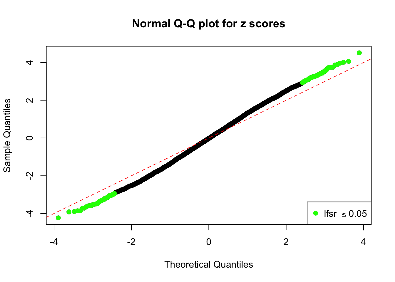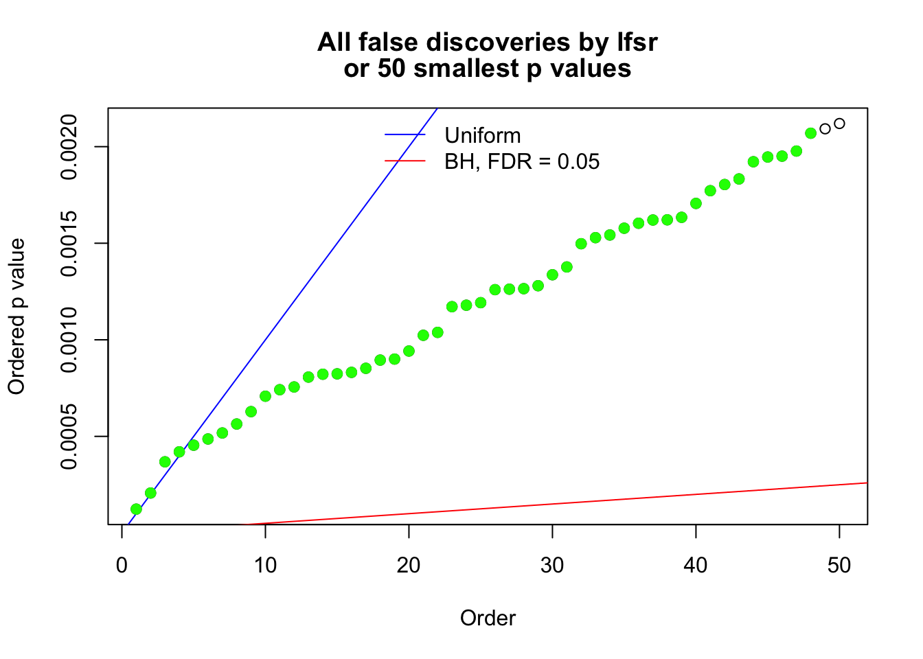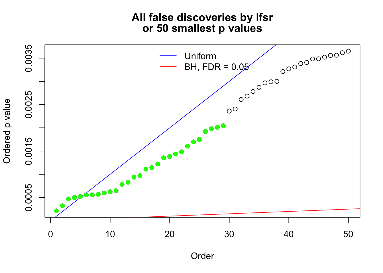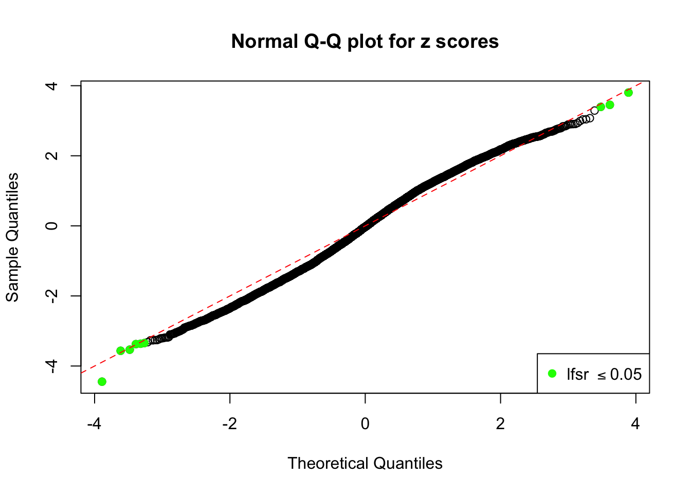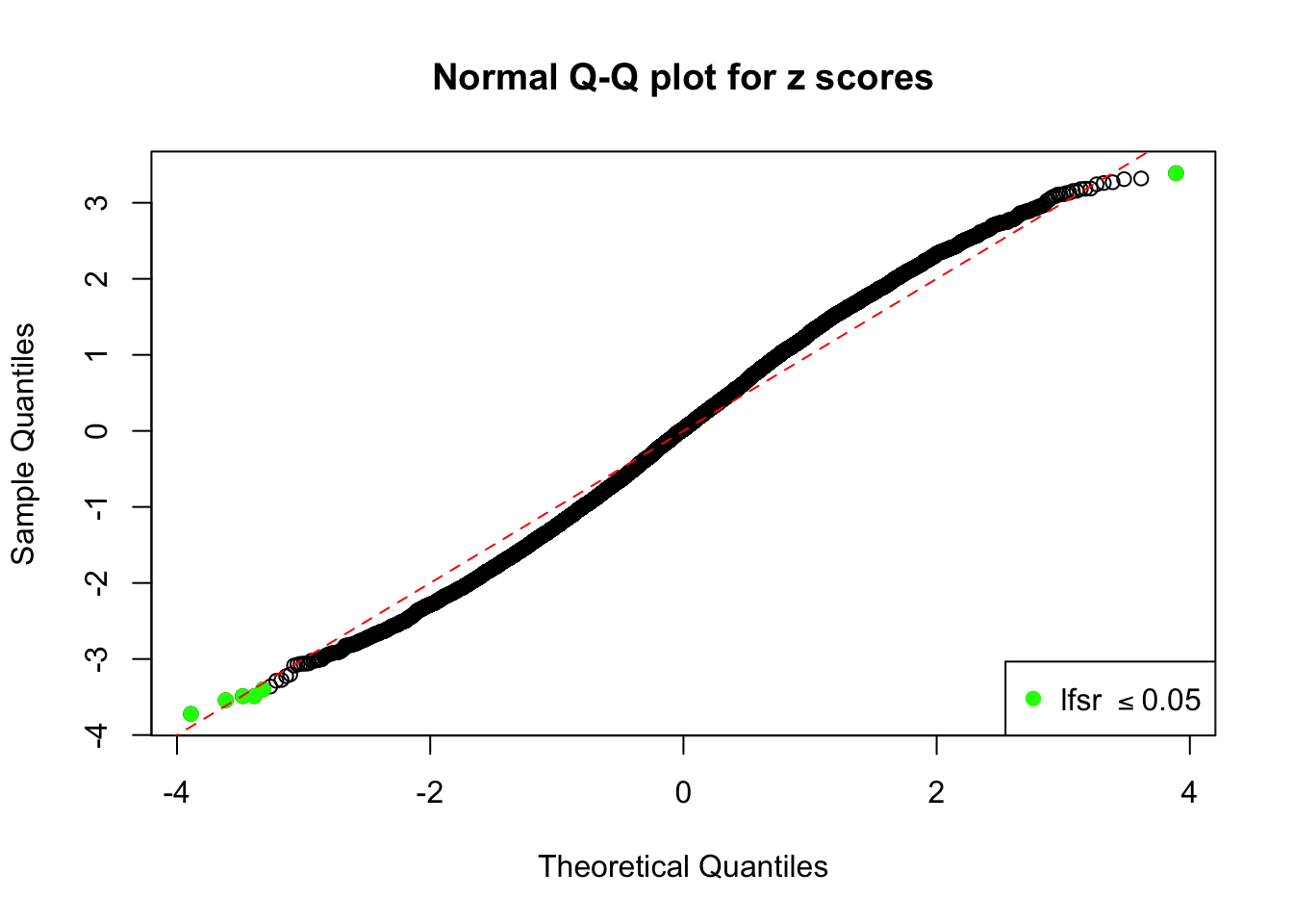 N0. 97 : Data Set 487 ; Number of False Discoveries by BH: 0 ; Number of False Discoveries by ASH's lfsr: 3 ; pihat0 = 0.3311973