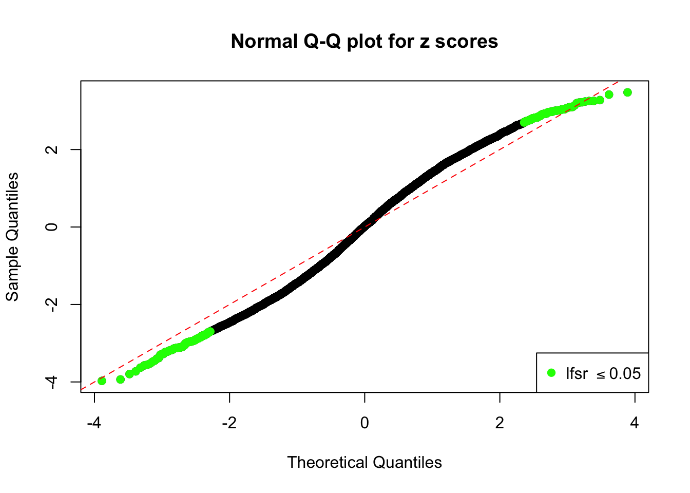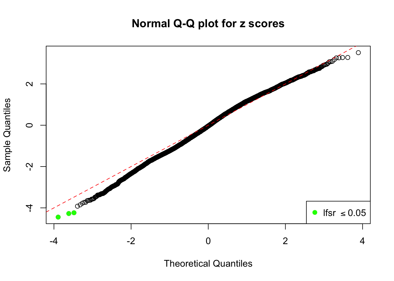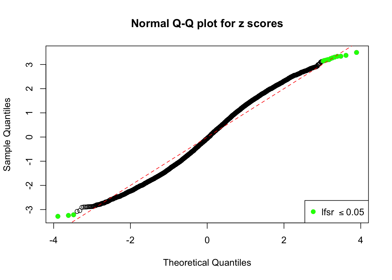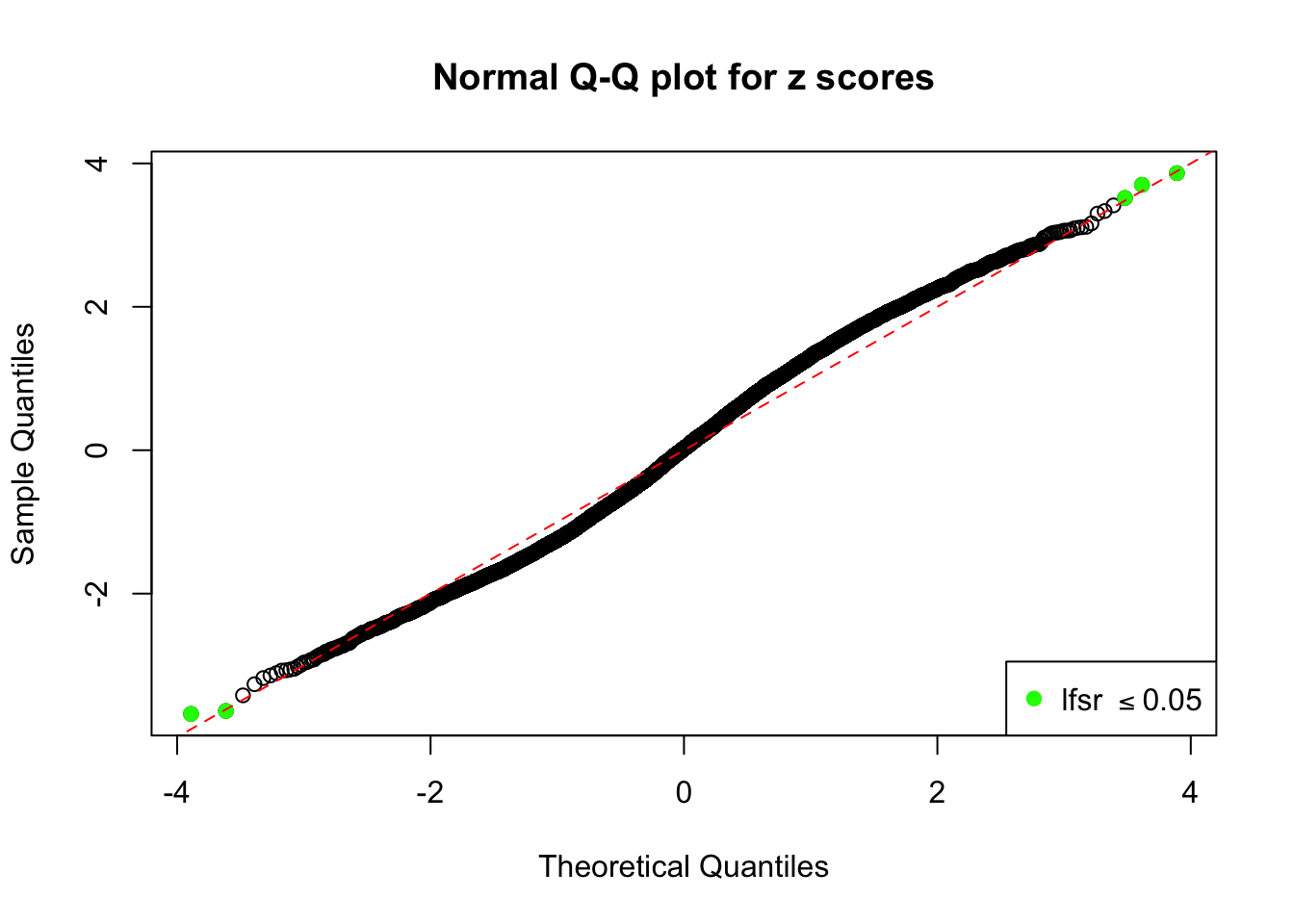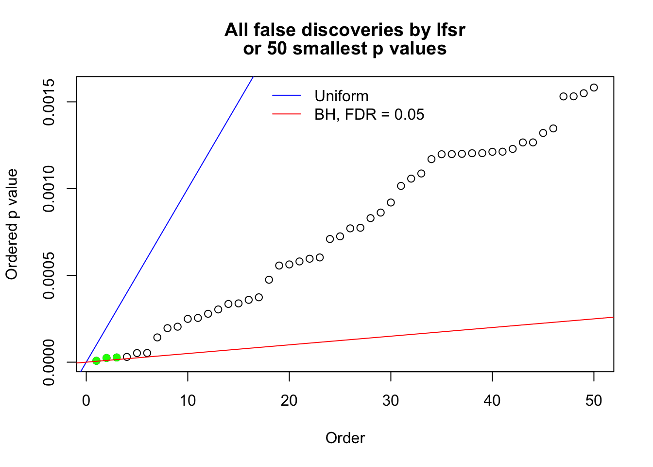 N0. 97 : Data Set 487 ; Number of False Discoveries by BH: 0 ; Number of False Discoveries by ASH's lfsr: 3 ; pihat0 = 0.3311973