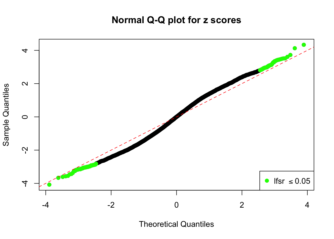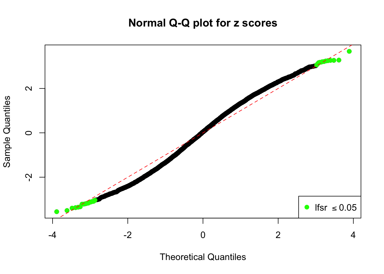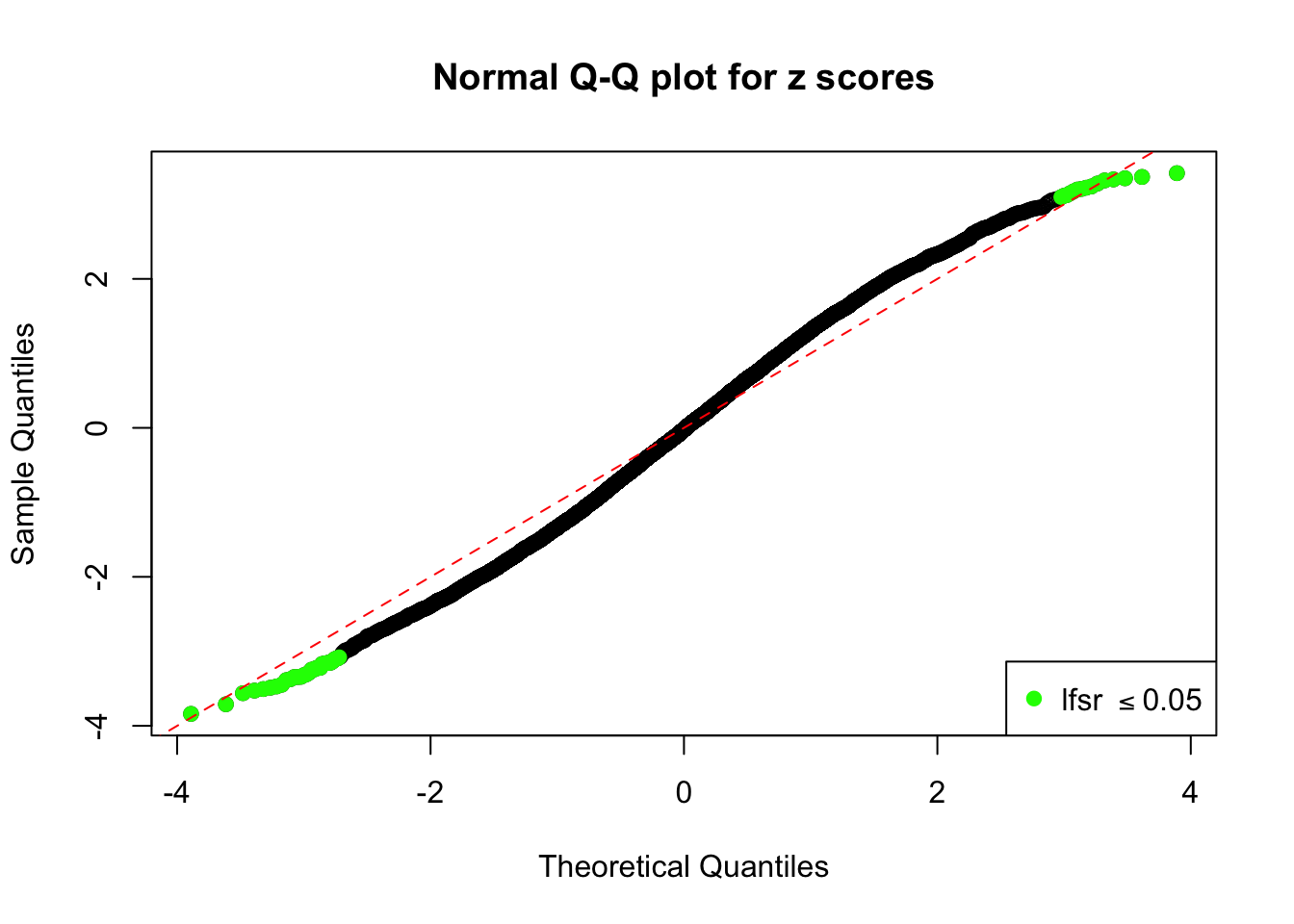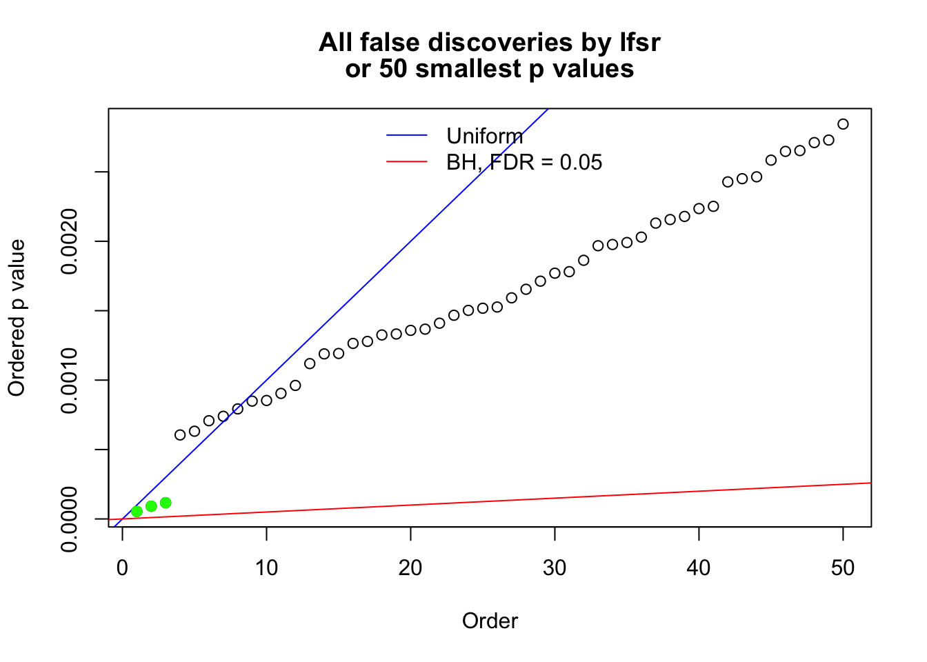 N0. 97 : Data Set 487 ; Number of False Discoveries by BH: 0 ; Number of False Discoveries by ASH's lfsr: 3 ; pihat0 = 0.3311973