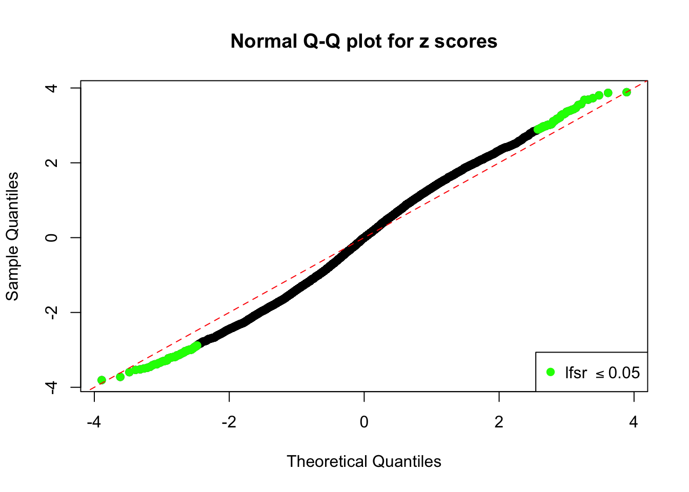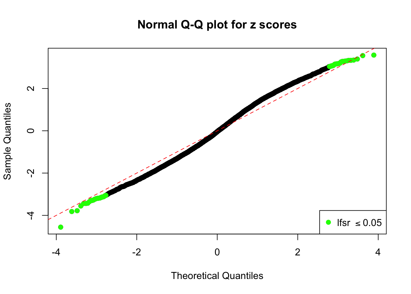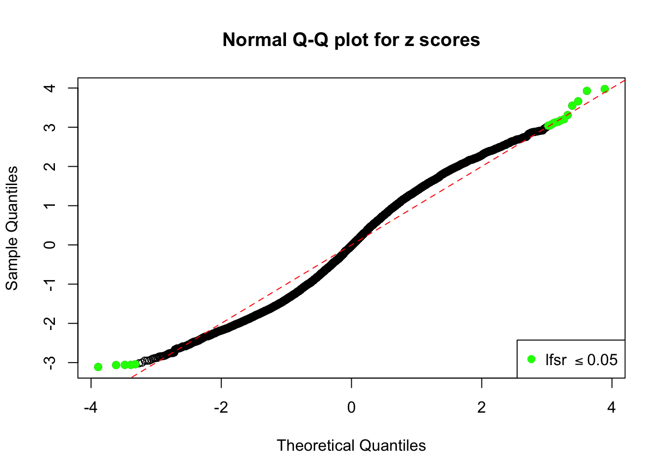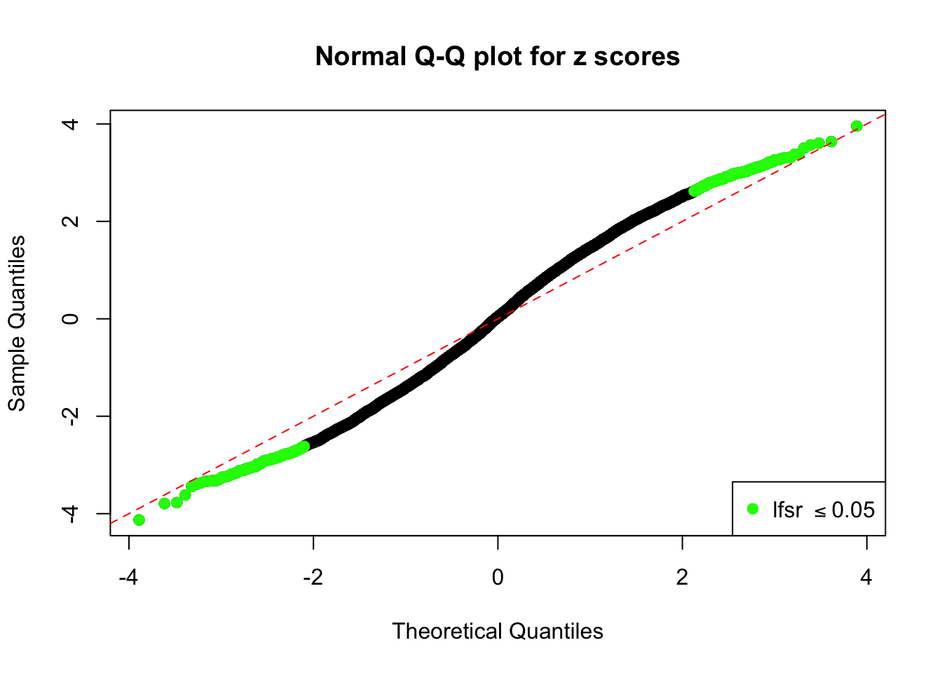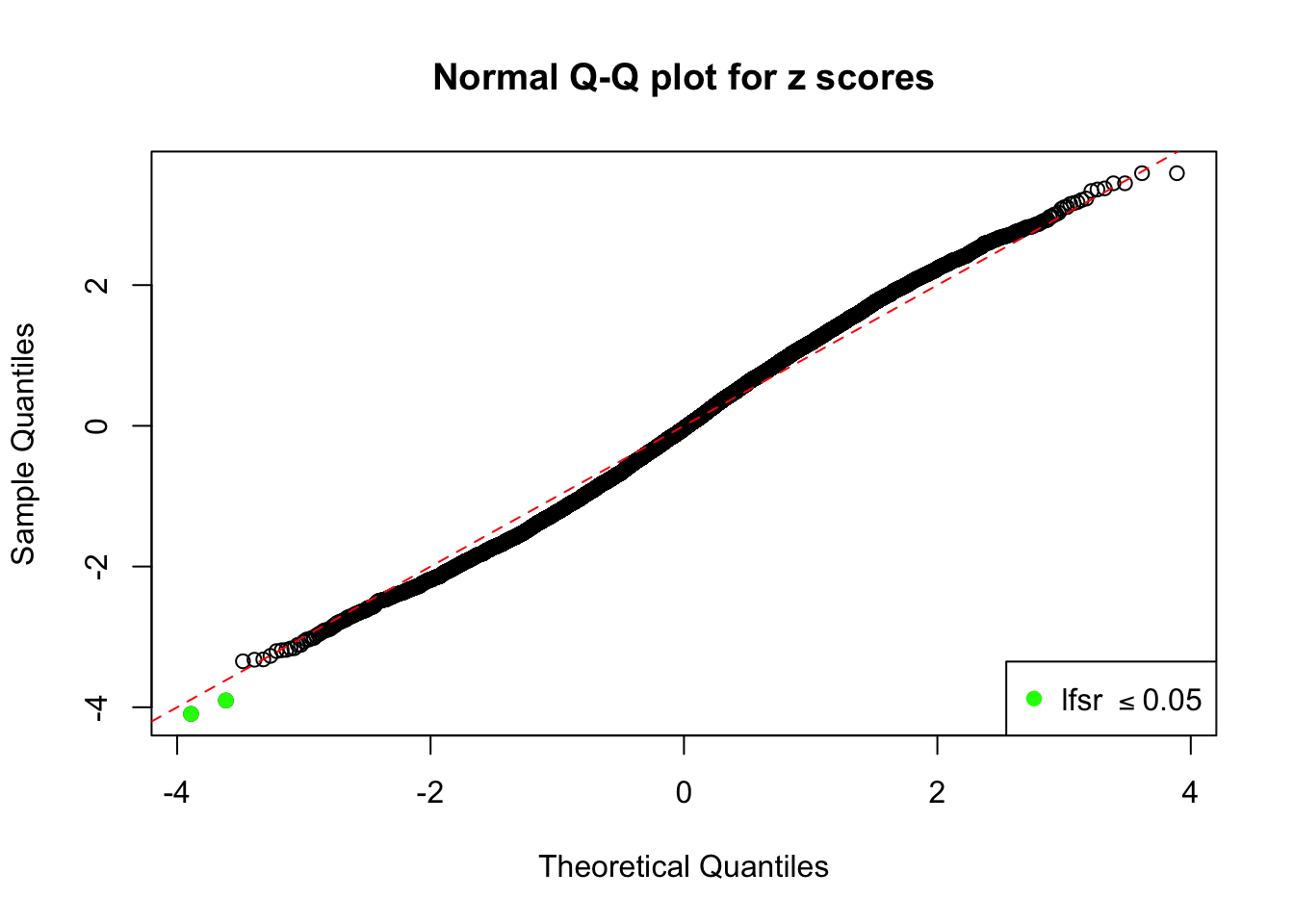 N0. 97 : Data Set 487 ; Number of False Discoveries by BH: 0 ; Number of False Discoveries by ASH's lfsr: 3 ; pihat0 = 0.3311973