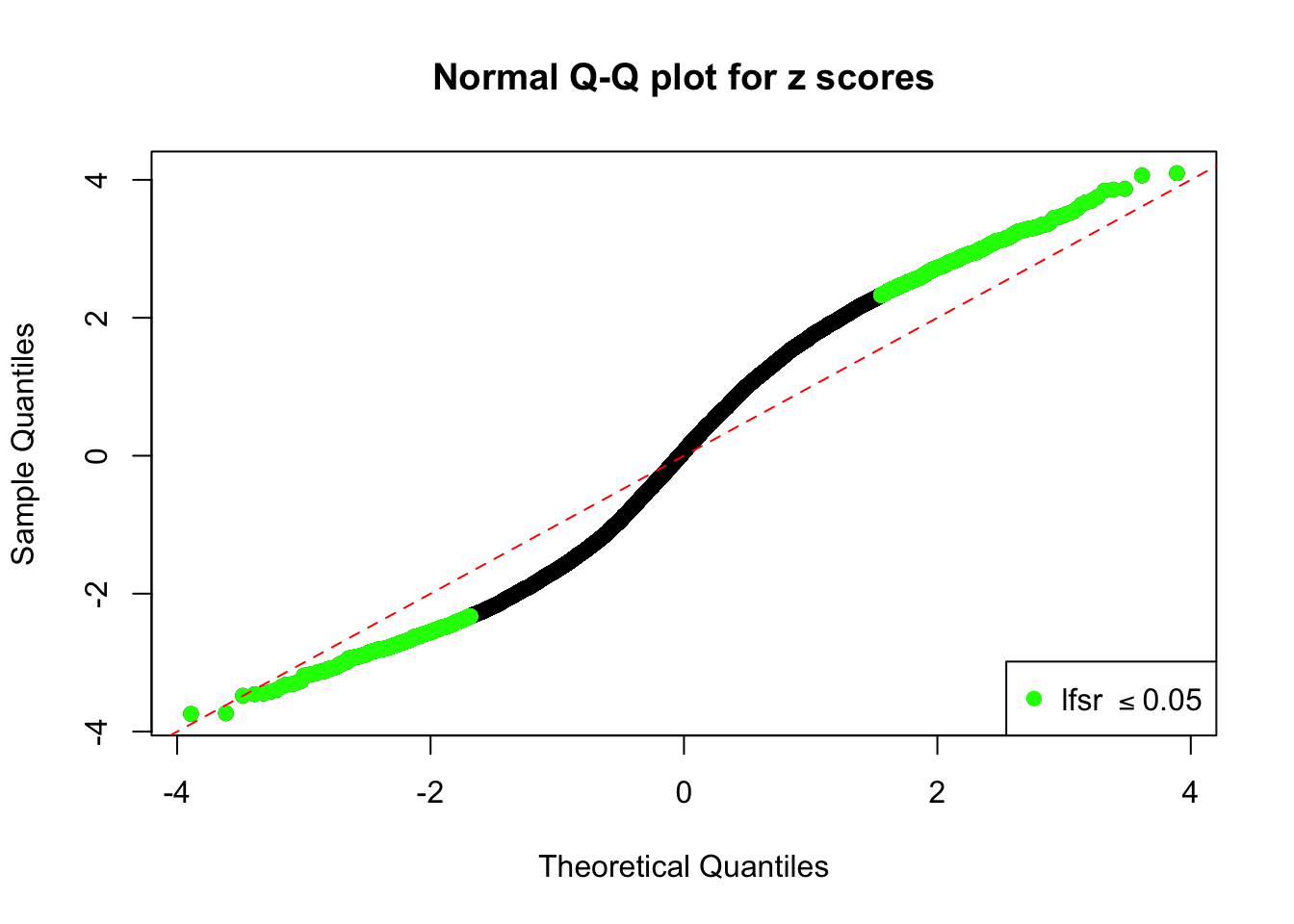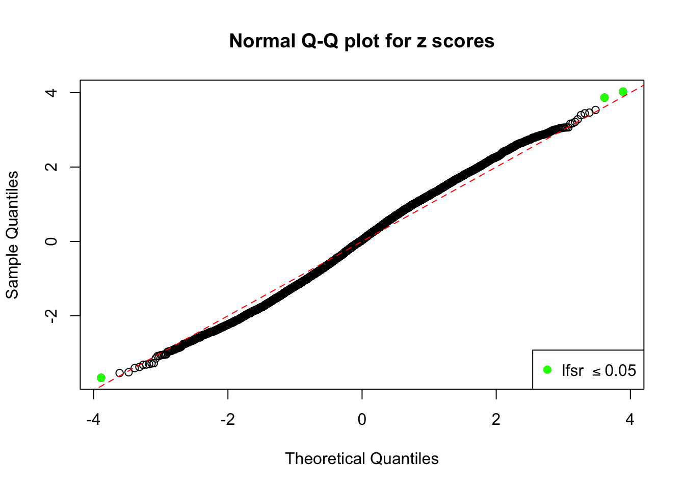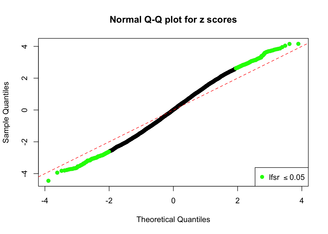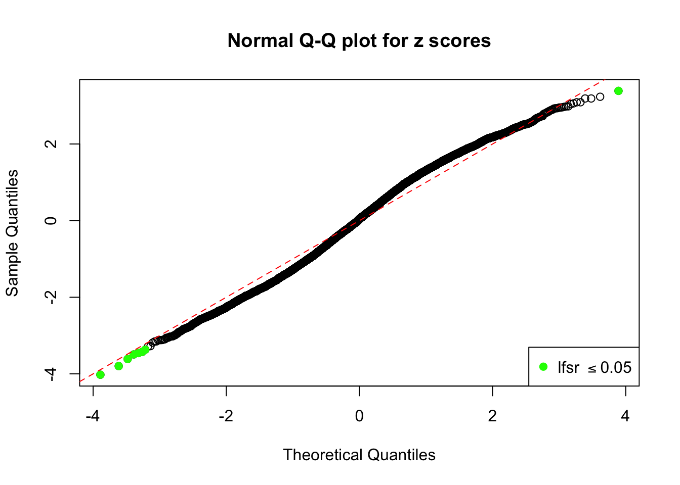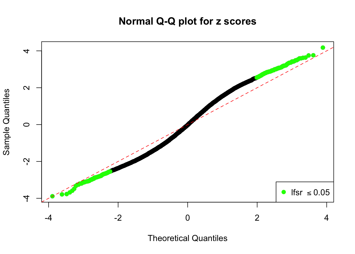 N0. 97 : Data Set 487 ; Number of False Discoveries by BH: 0 ; Number of False Discoveries by ASH's lfsr: 3 ; pihat0 = 0.3311973