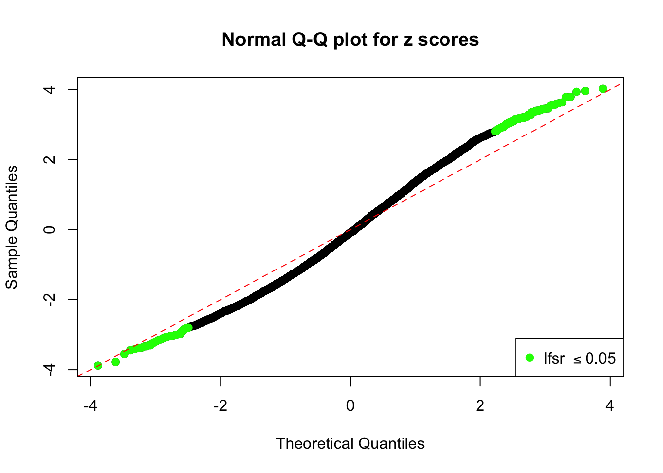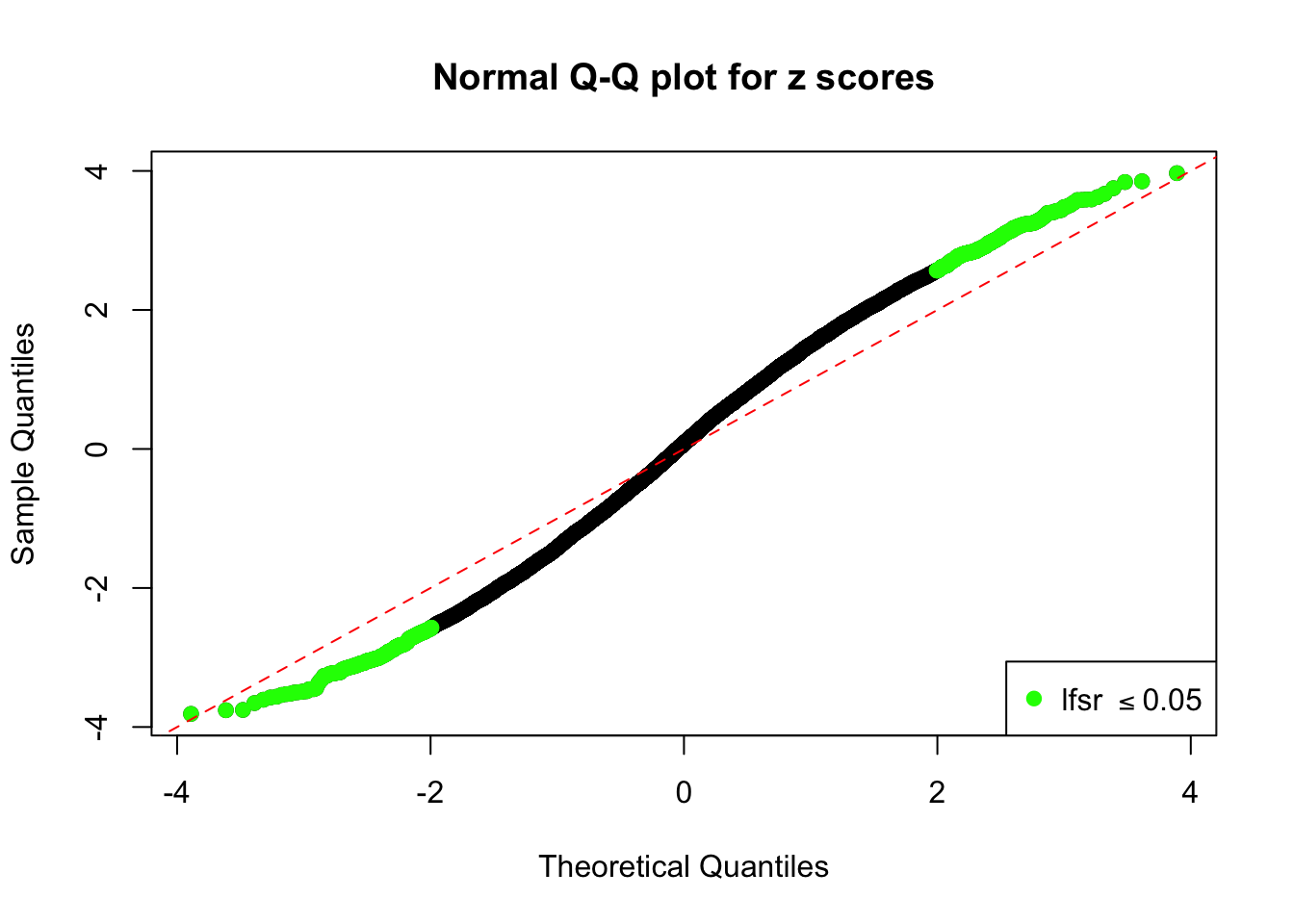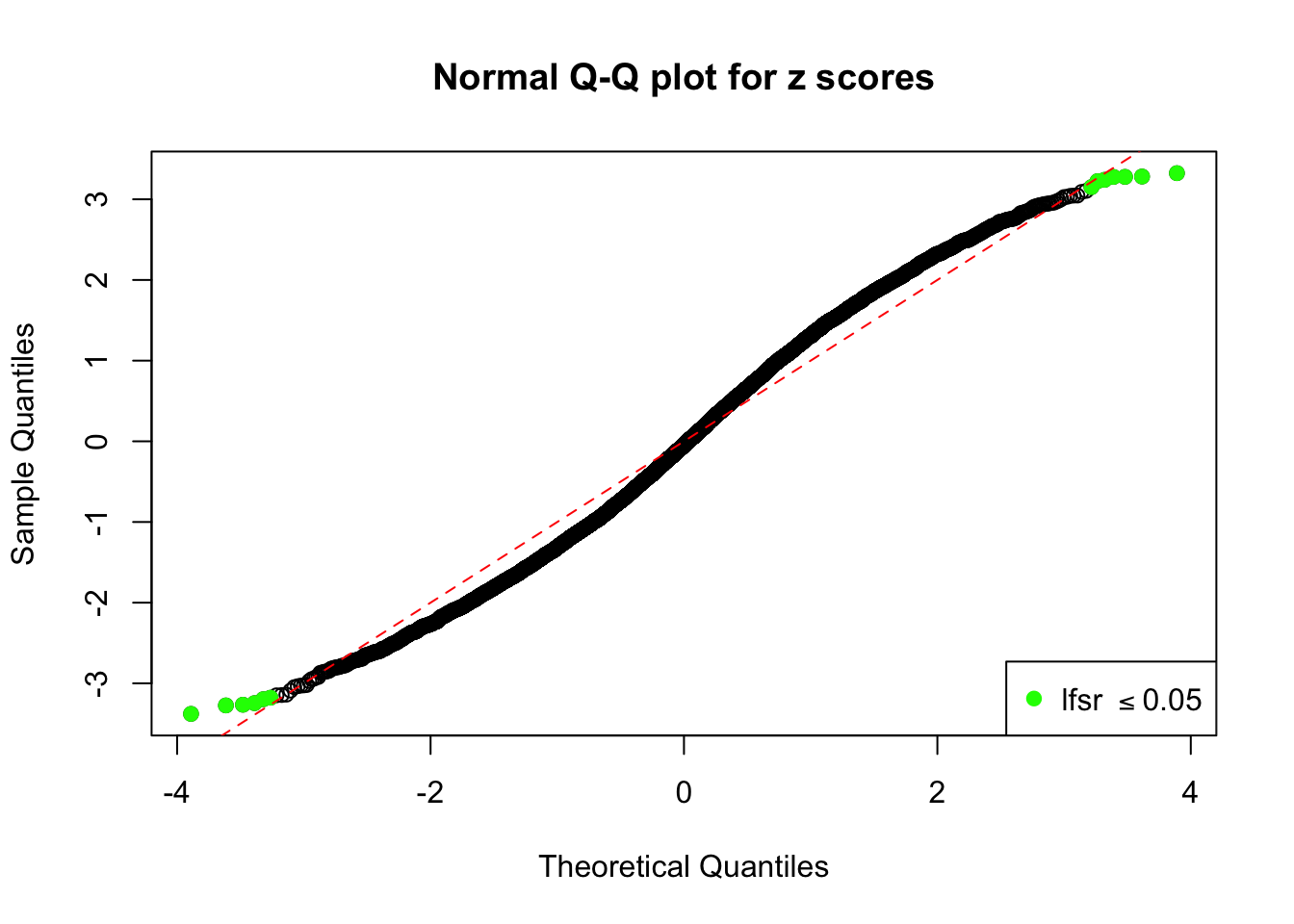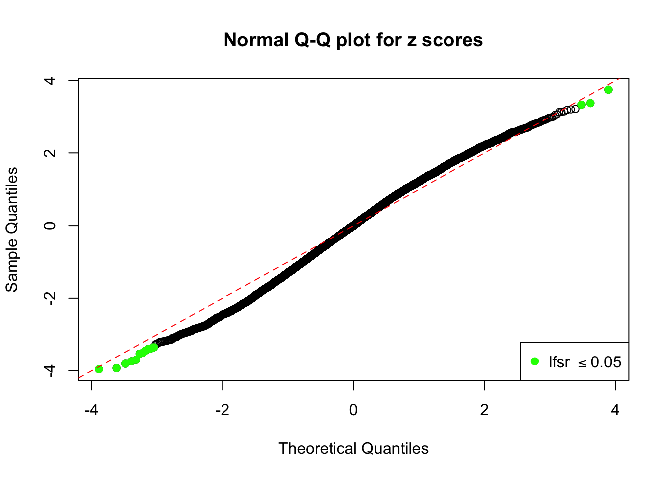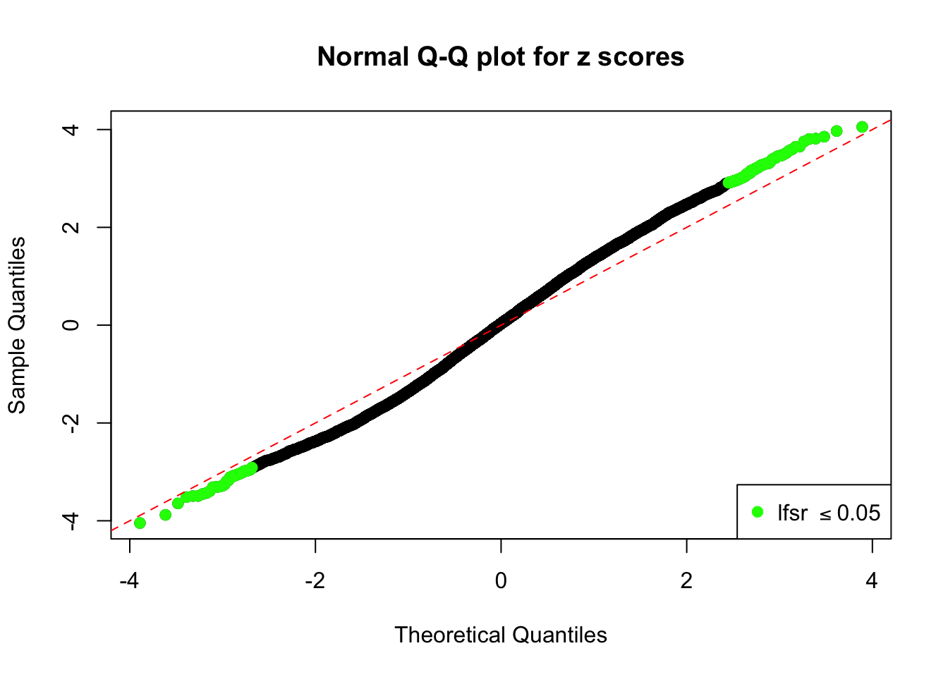 N0. 97 : Data Set 487 ; Number of False Discoveries by BH: 0 ; Number of False Discoveries by ASH's lfsr: 3 ; pihat0 = 0.3311973