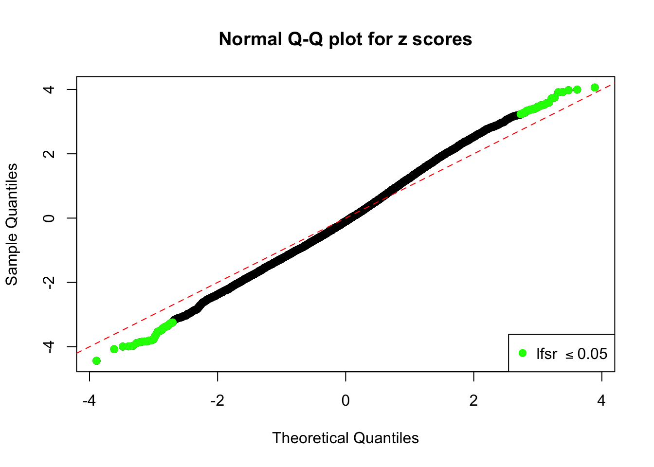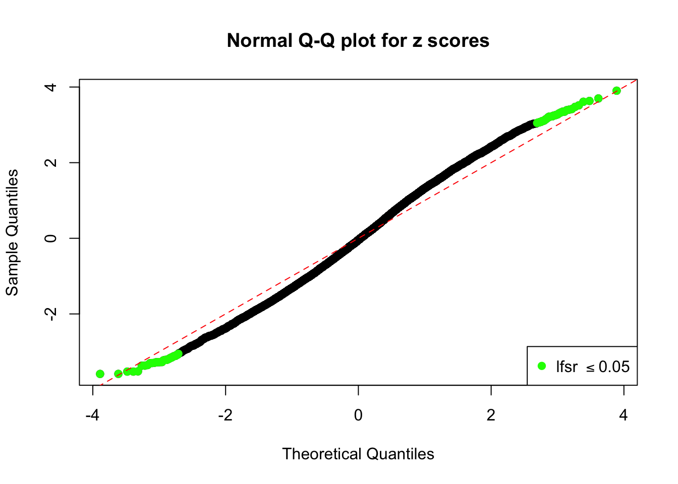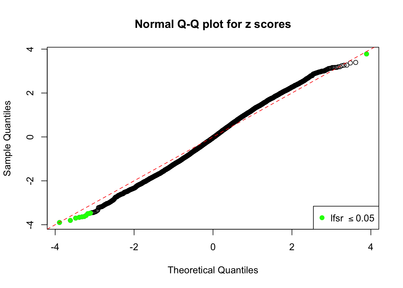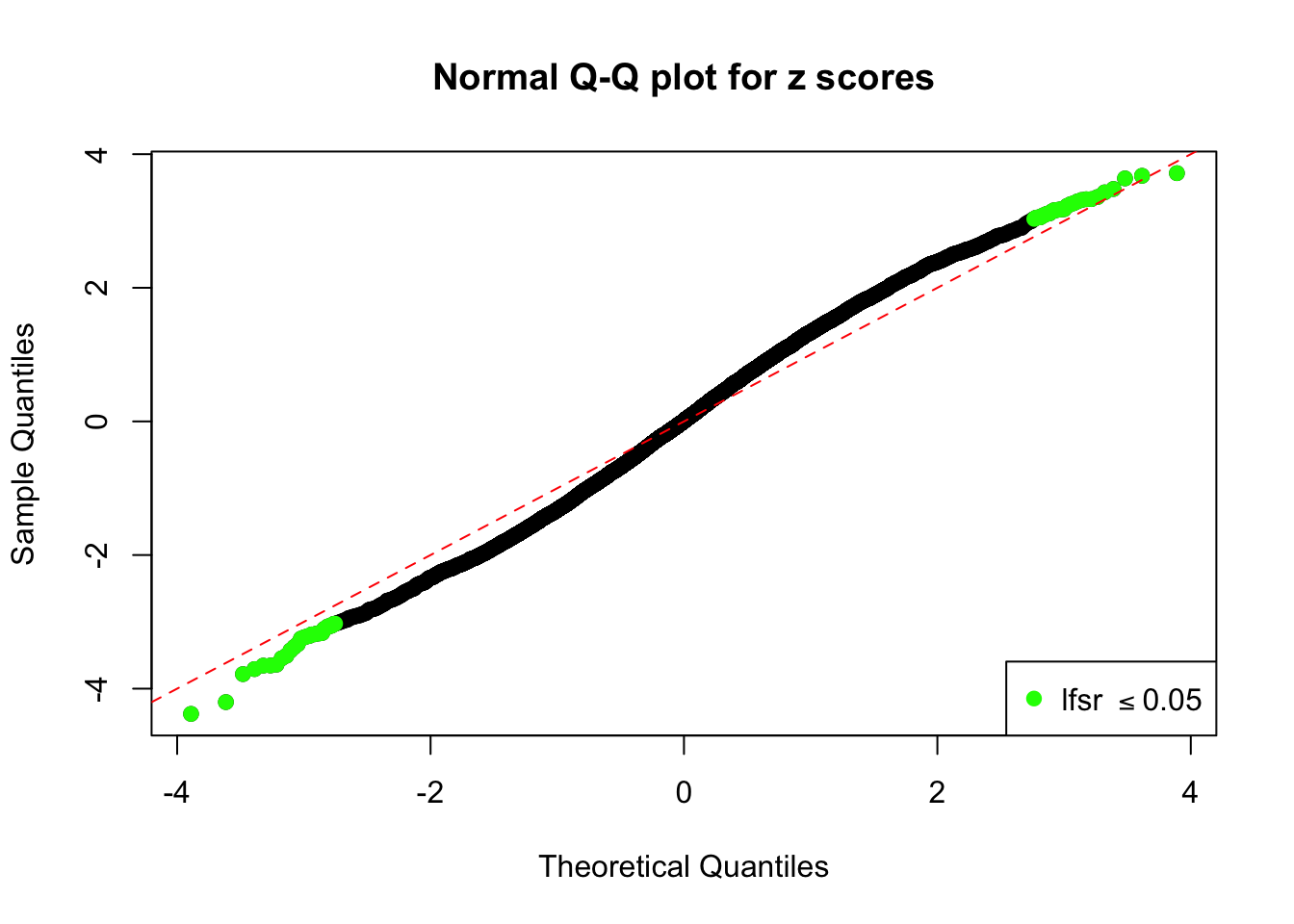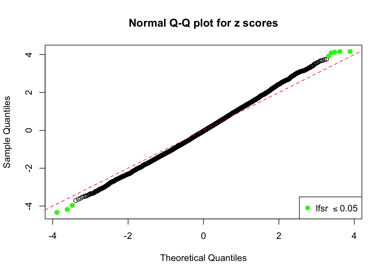 N0. 97 : Data Set 487 ; Number of False Discoveries by BH: 0 ; Number of False Discoveries by ASH's lfsr: 3 ; pihat0 = 0.3311973