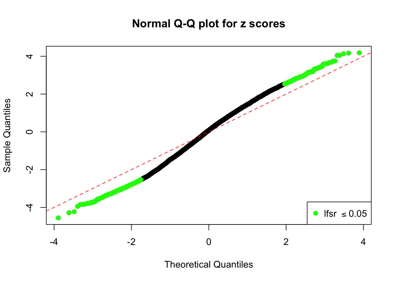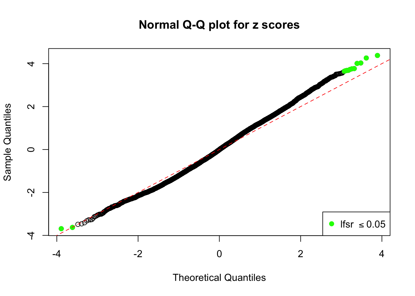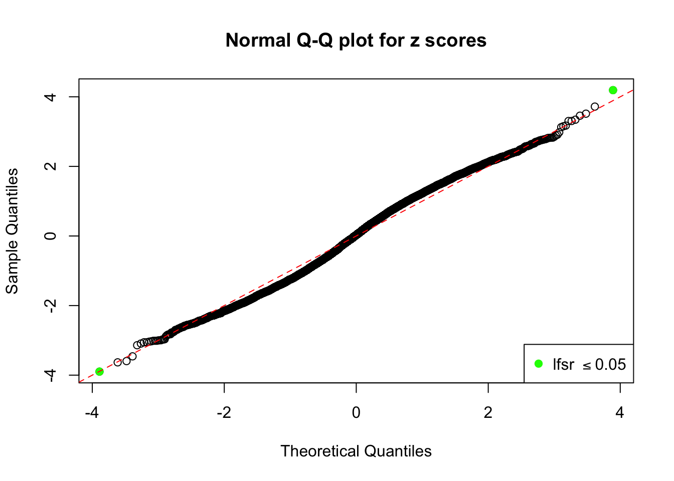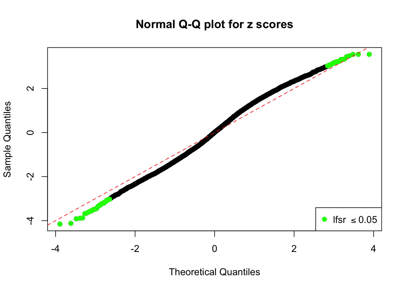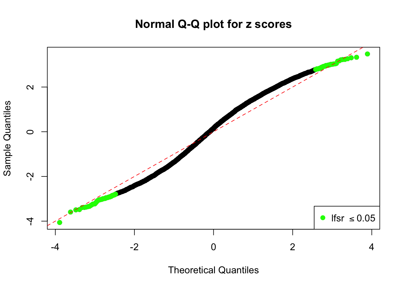 N0. 97 : Data Set 487 ; Number of False Discoveries by BH: 0 ; Number of False Discoveries by ASH's lfsr: 3 ; pihat0 = 0.3311973