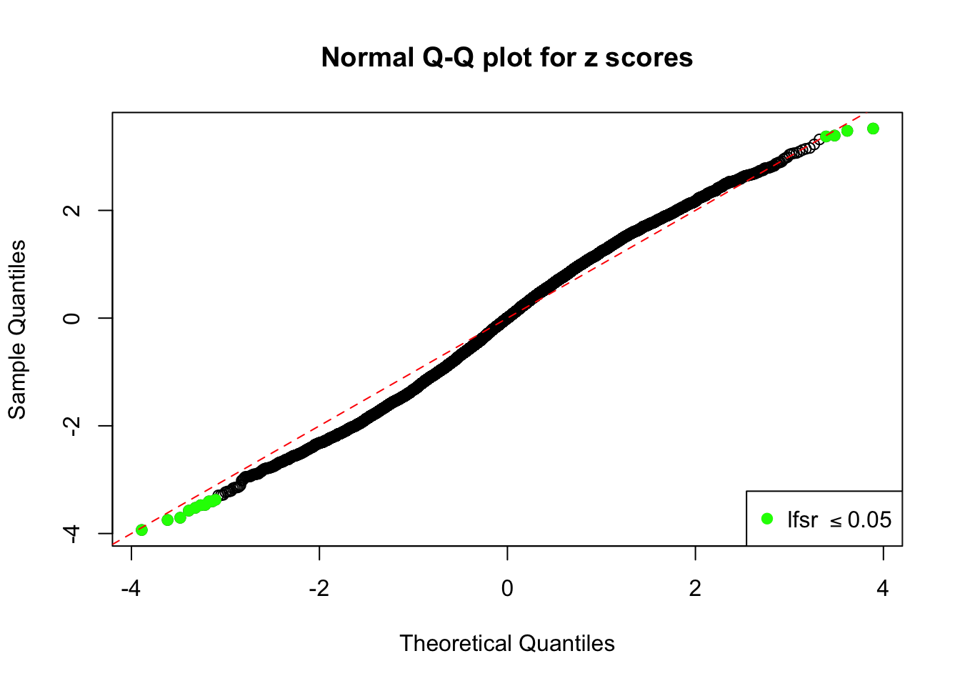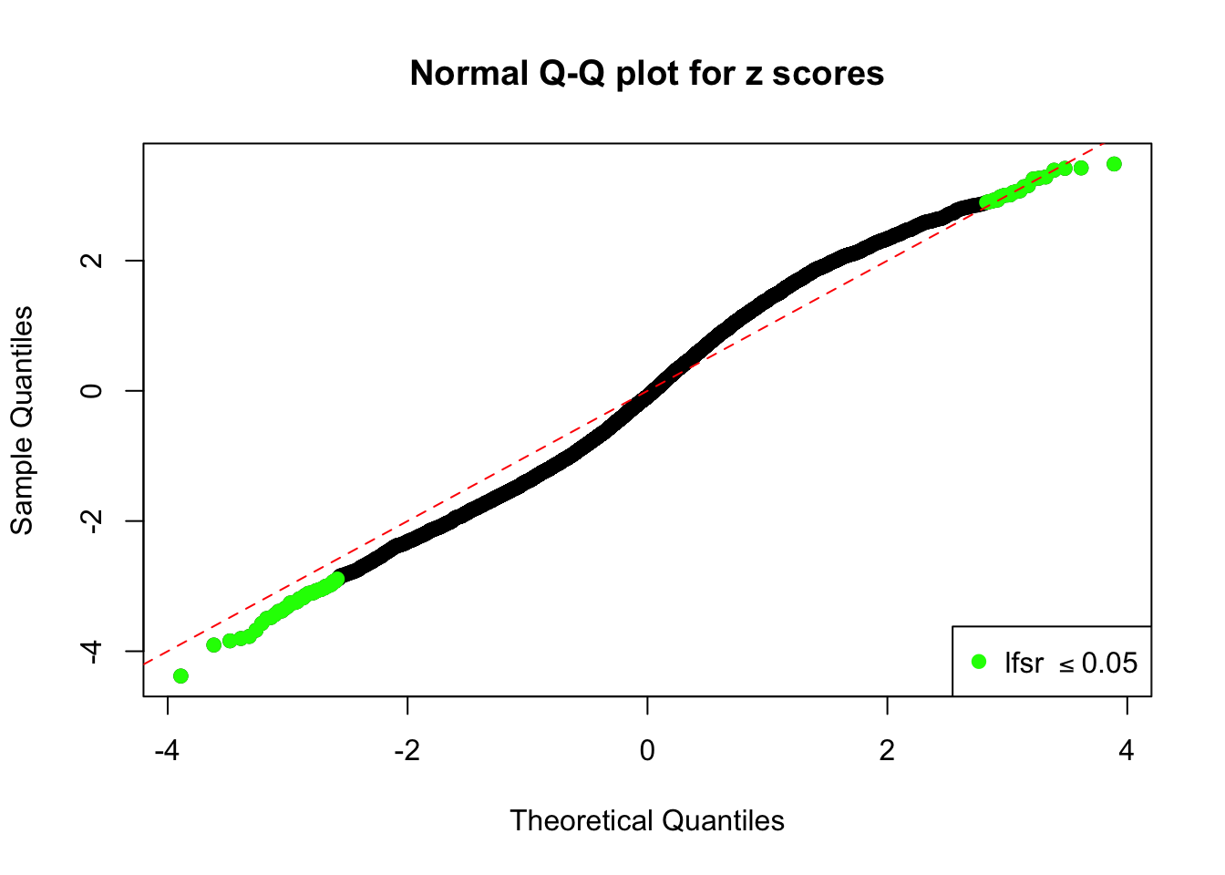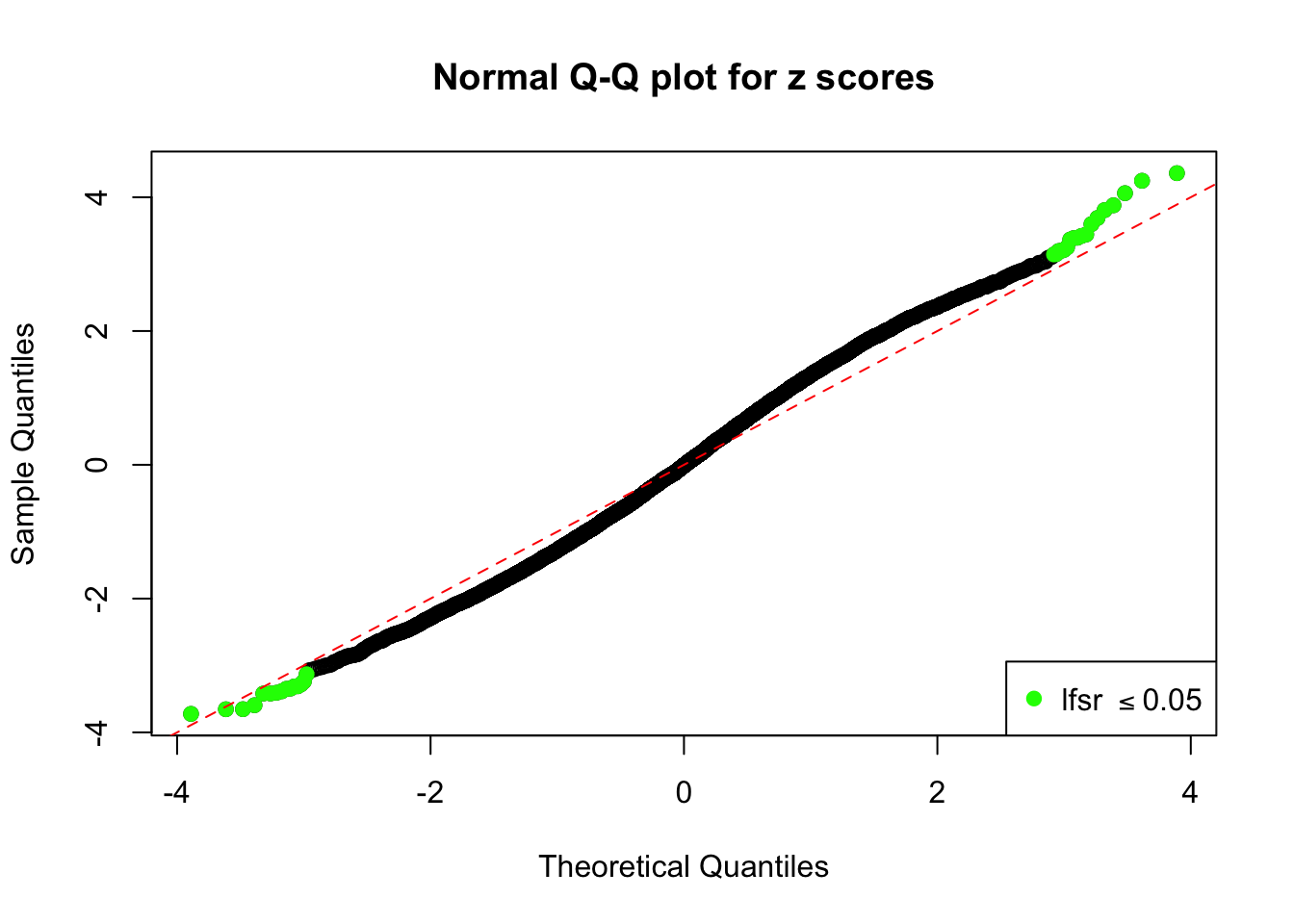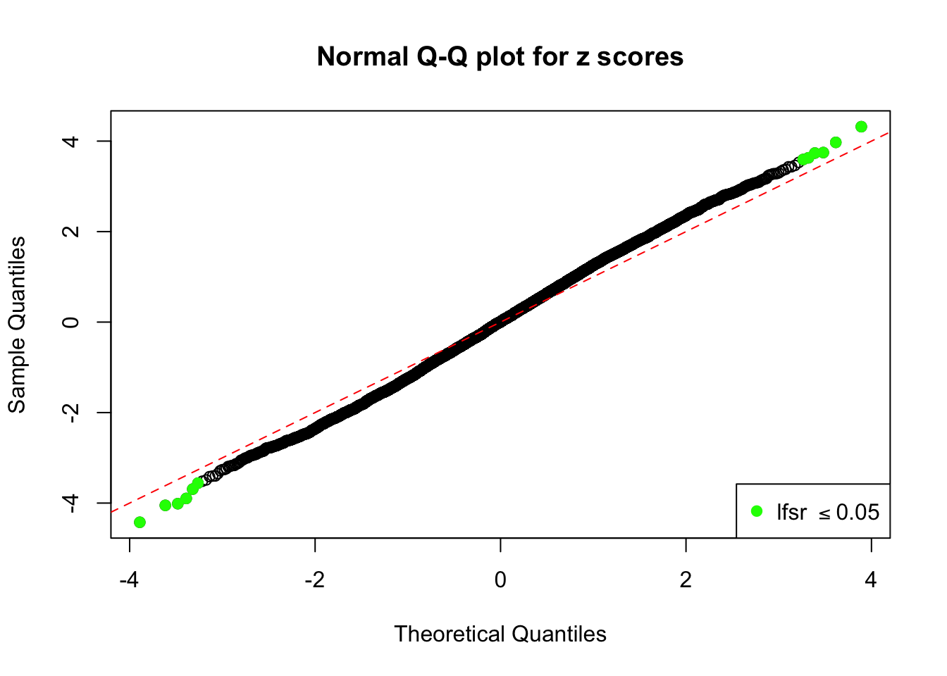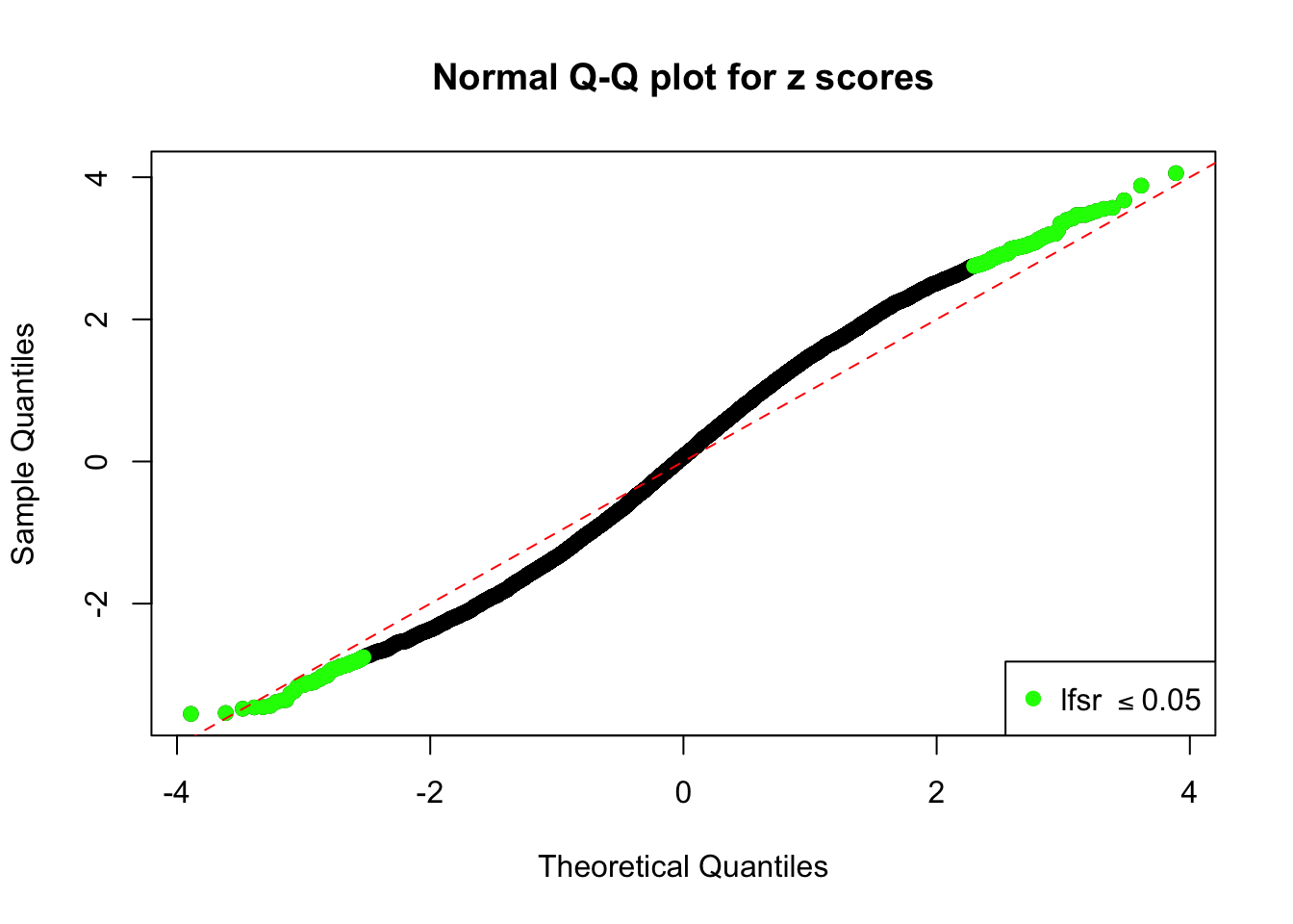 N0. 97 : Data Set 487 ; Number of False Discoveries by BH: 0 ; Number of False Discoveries by ASH's lfsr: 3 ; pihat0 = 0.3311973