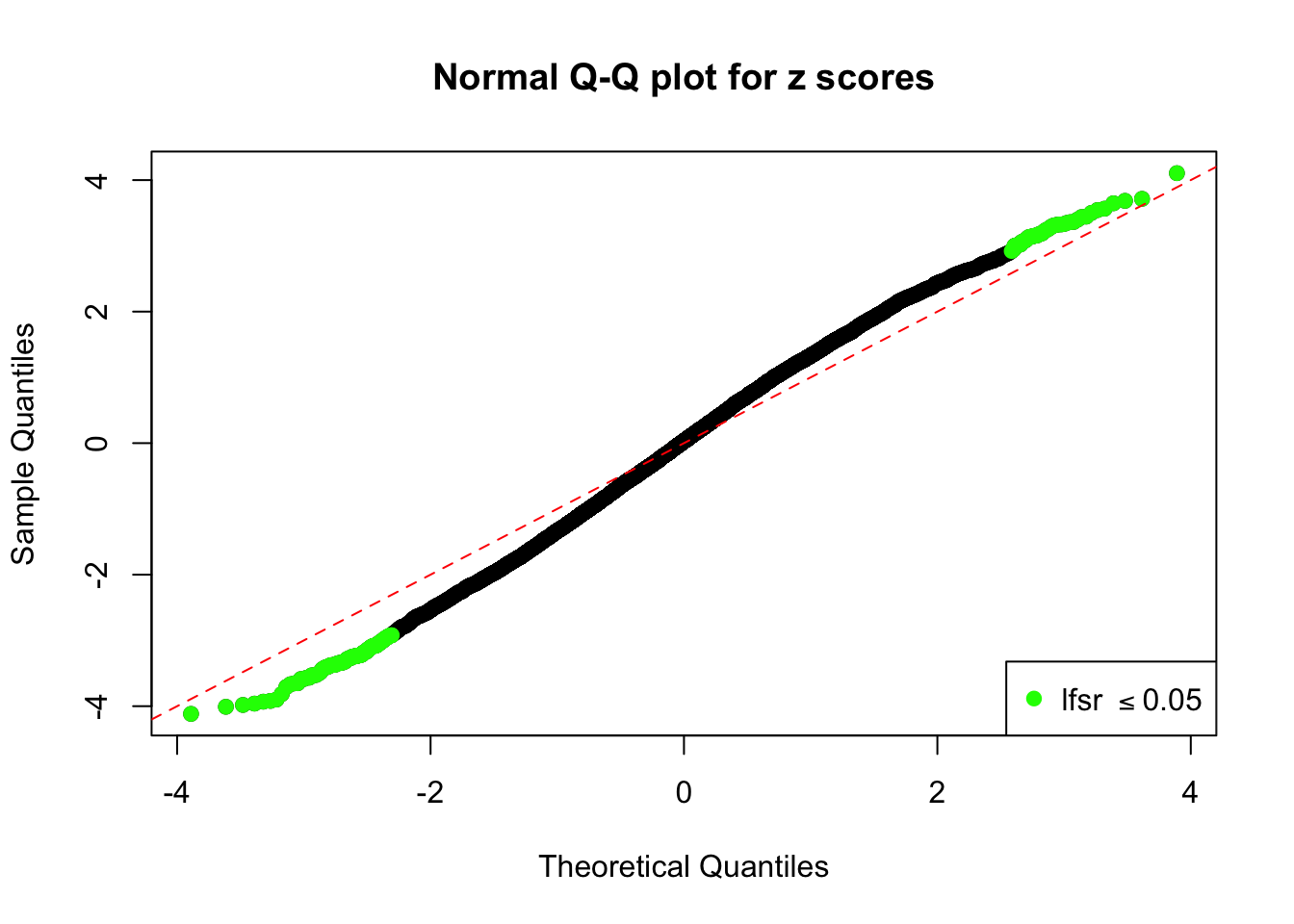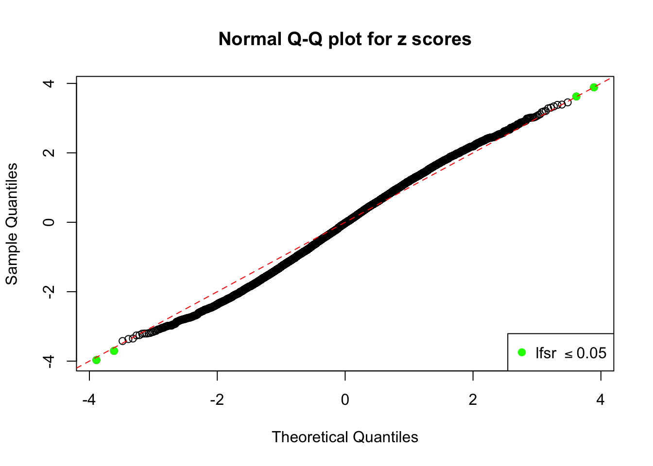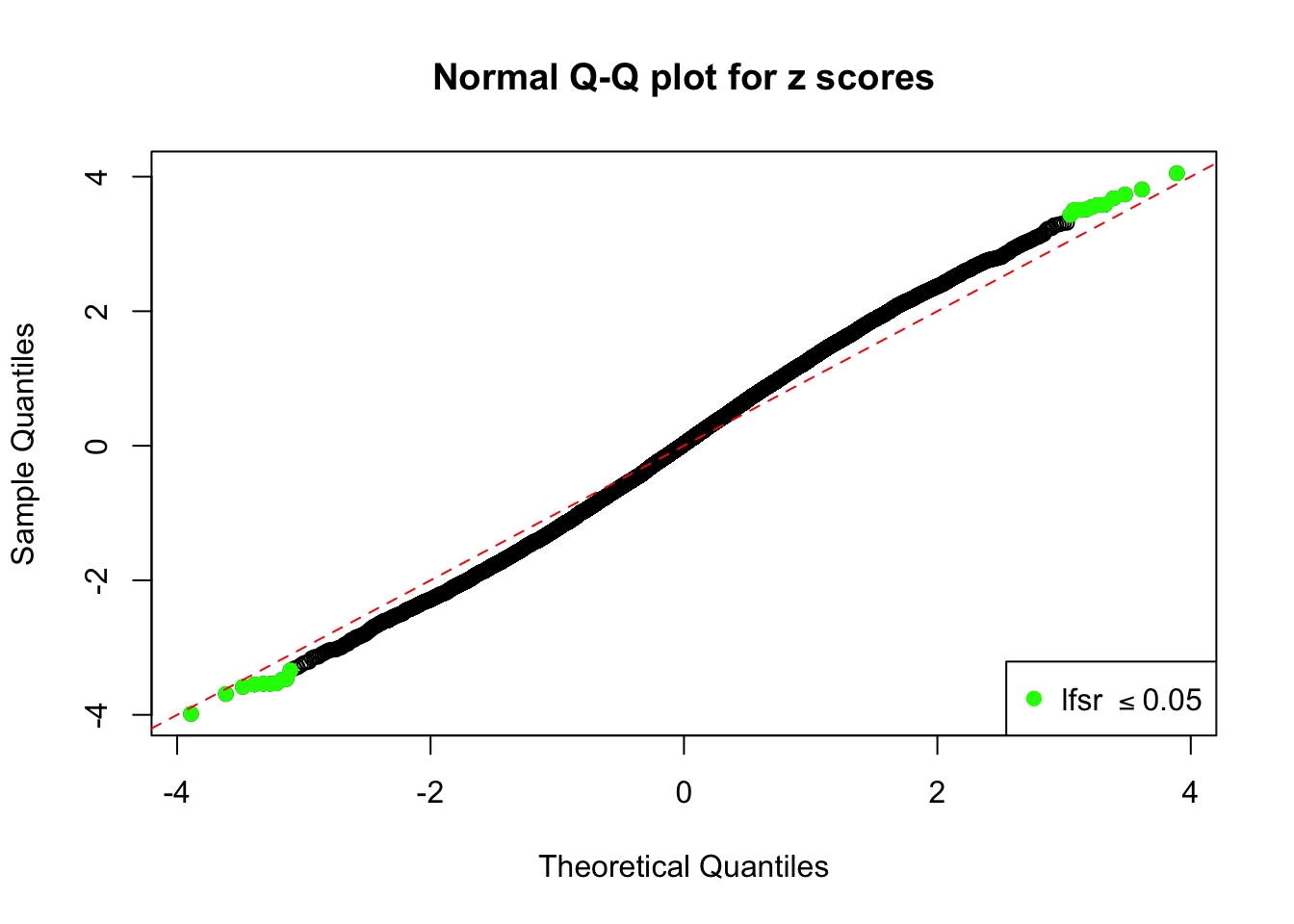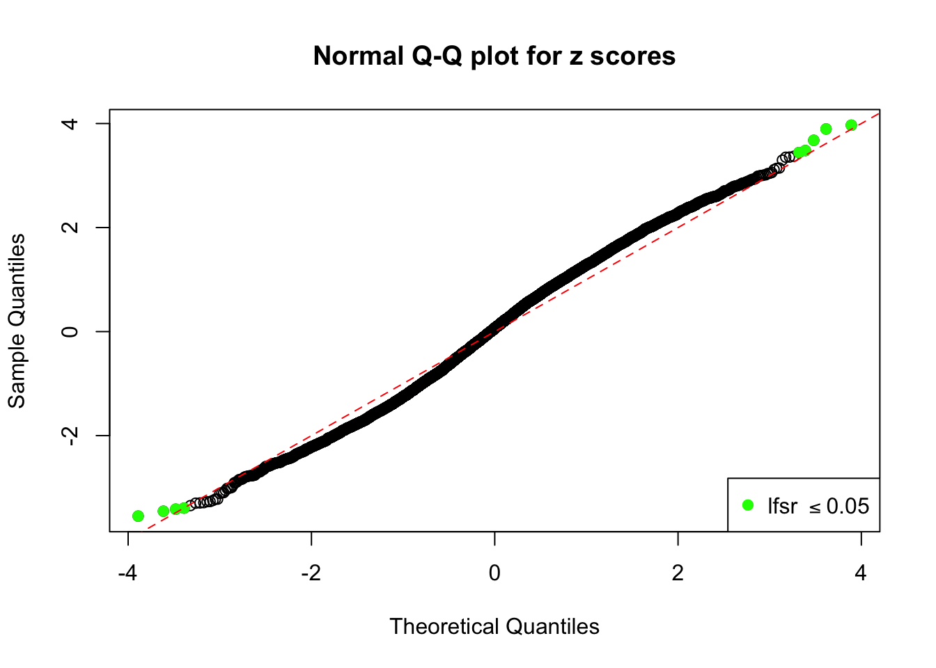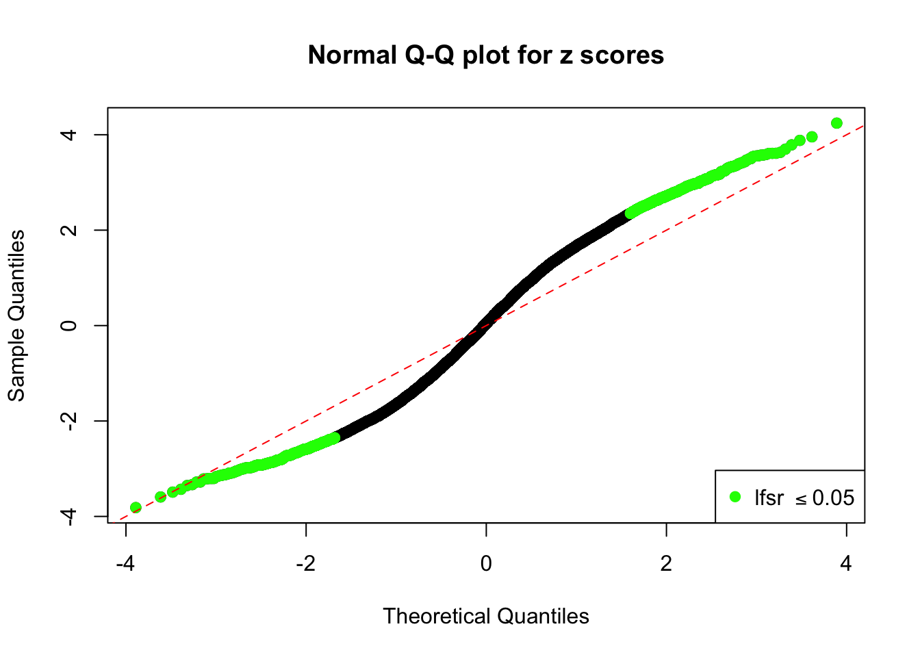 N0. 97 : Data Set 487 ; Number of False Discoveries by BH: 0 ; Number of False Discoveries by ASH's lfsr: 3 ; pihat0 = 0.3311973
