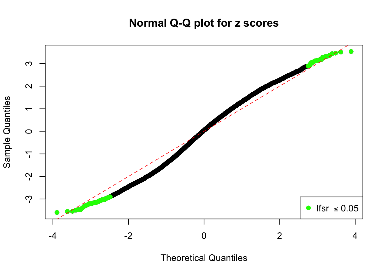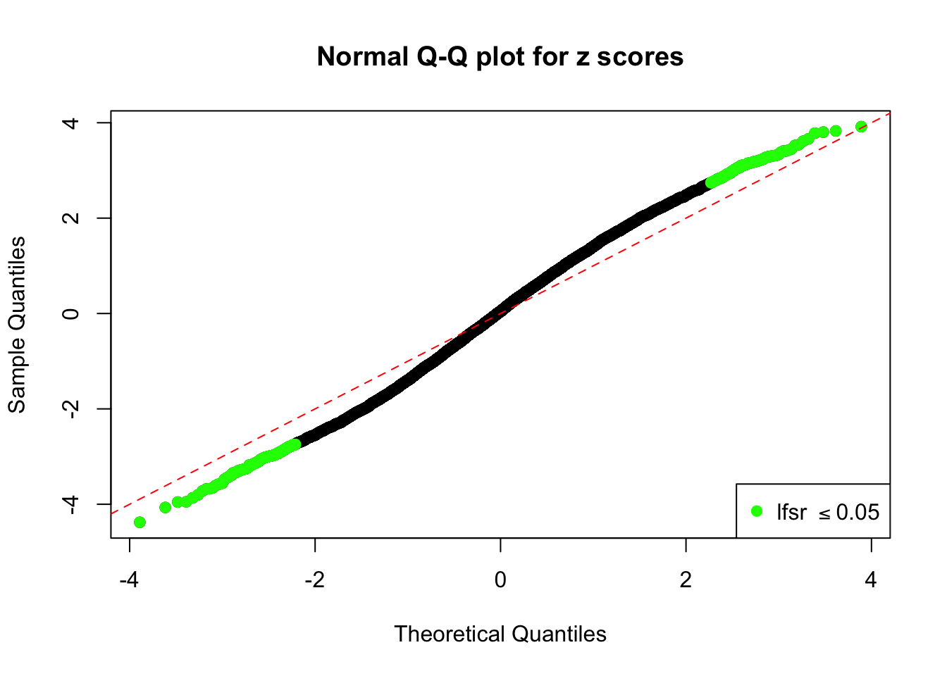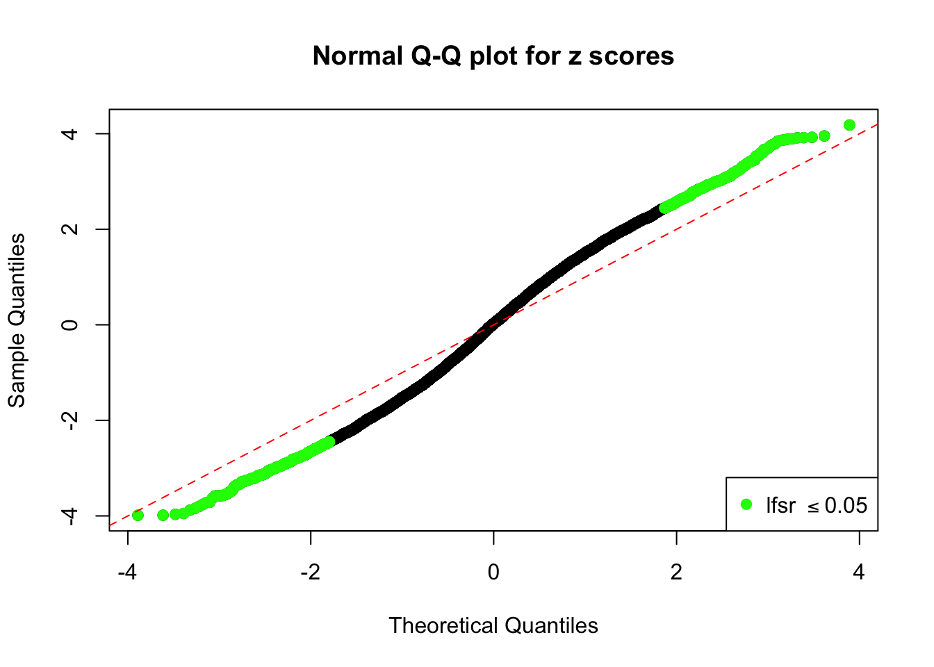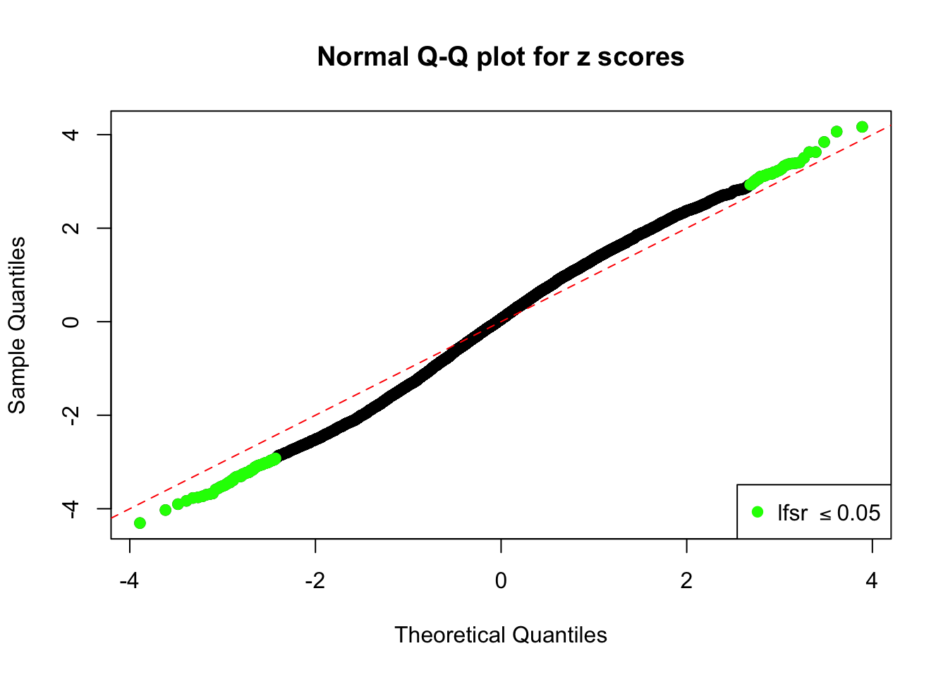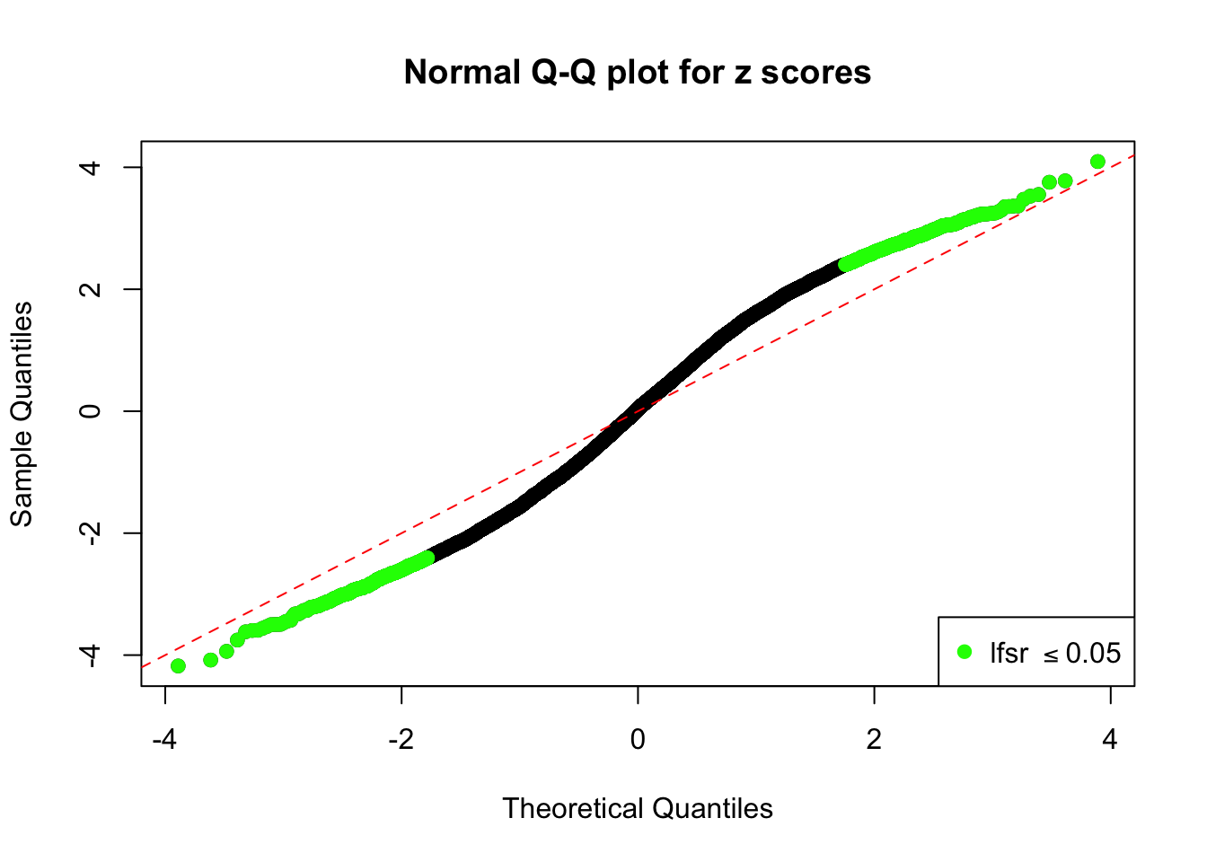 N0. 97 : Data Set 487 ; Number of False Discoveries by BH: 0 ; Number of False Discoveries by ASH's lfsr: 3 ; pihat0 = 0.3311973