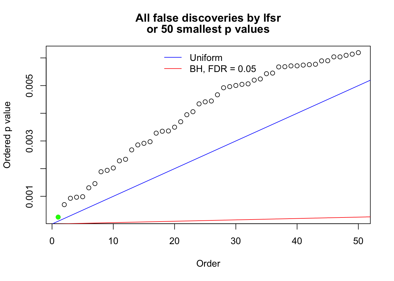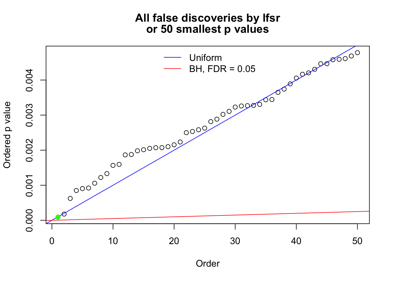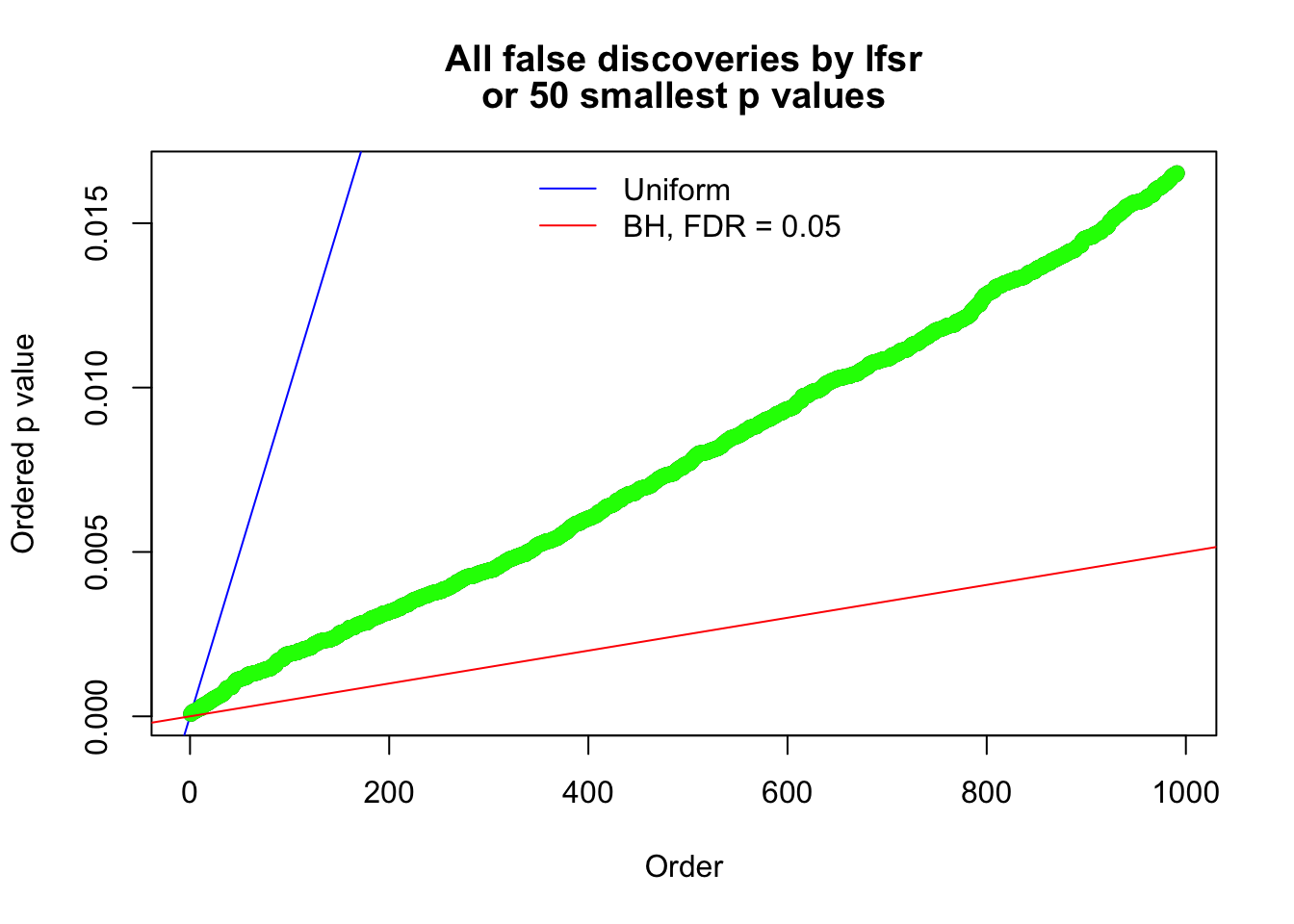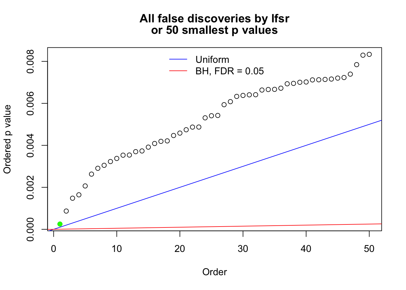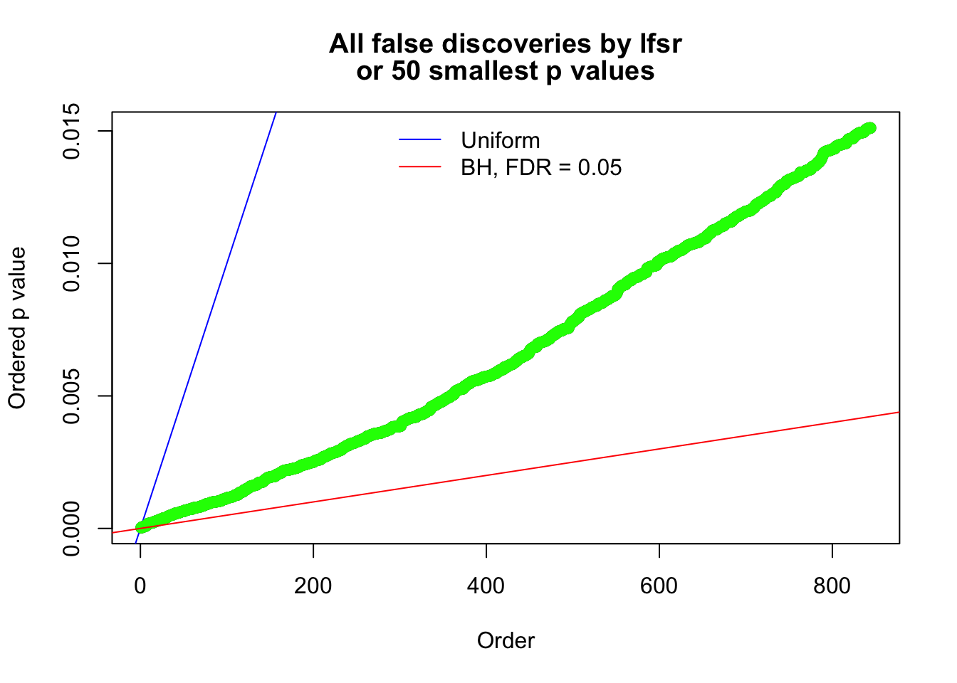N0. 7 : Data Set 955 ; Number of False Discoveries by BH: 1 ; Number of False Discoveries by ASH's lfsr: 0 ; pihat0 = 0.9998902