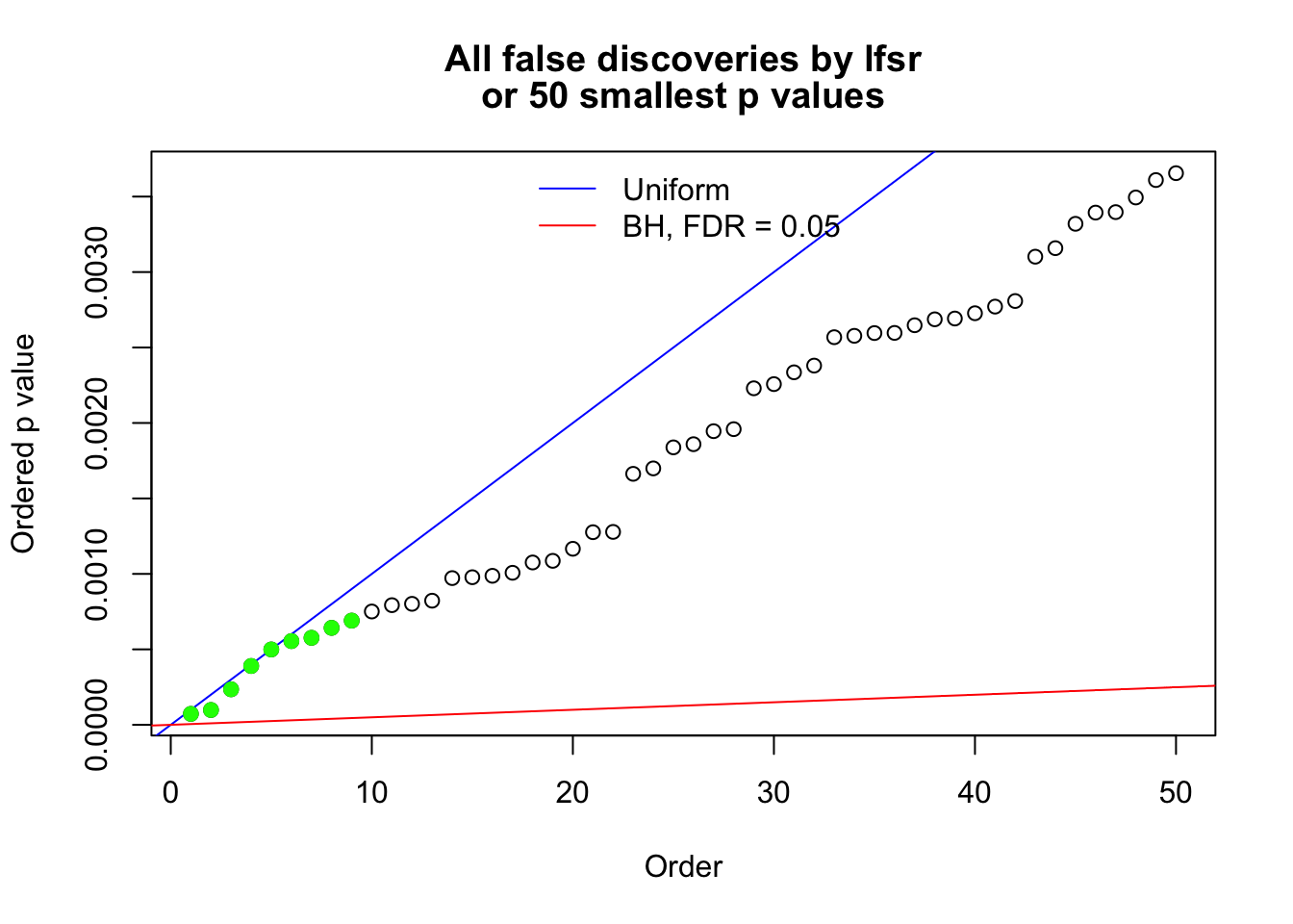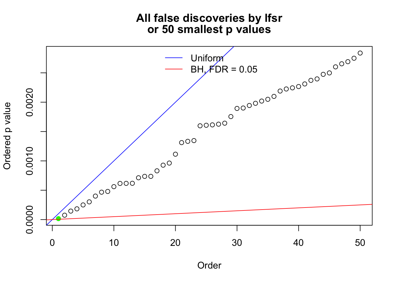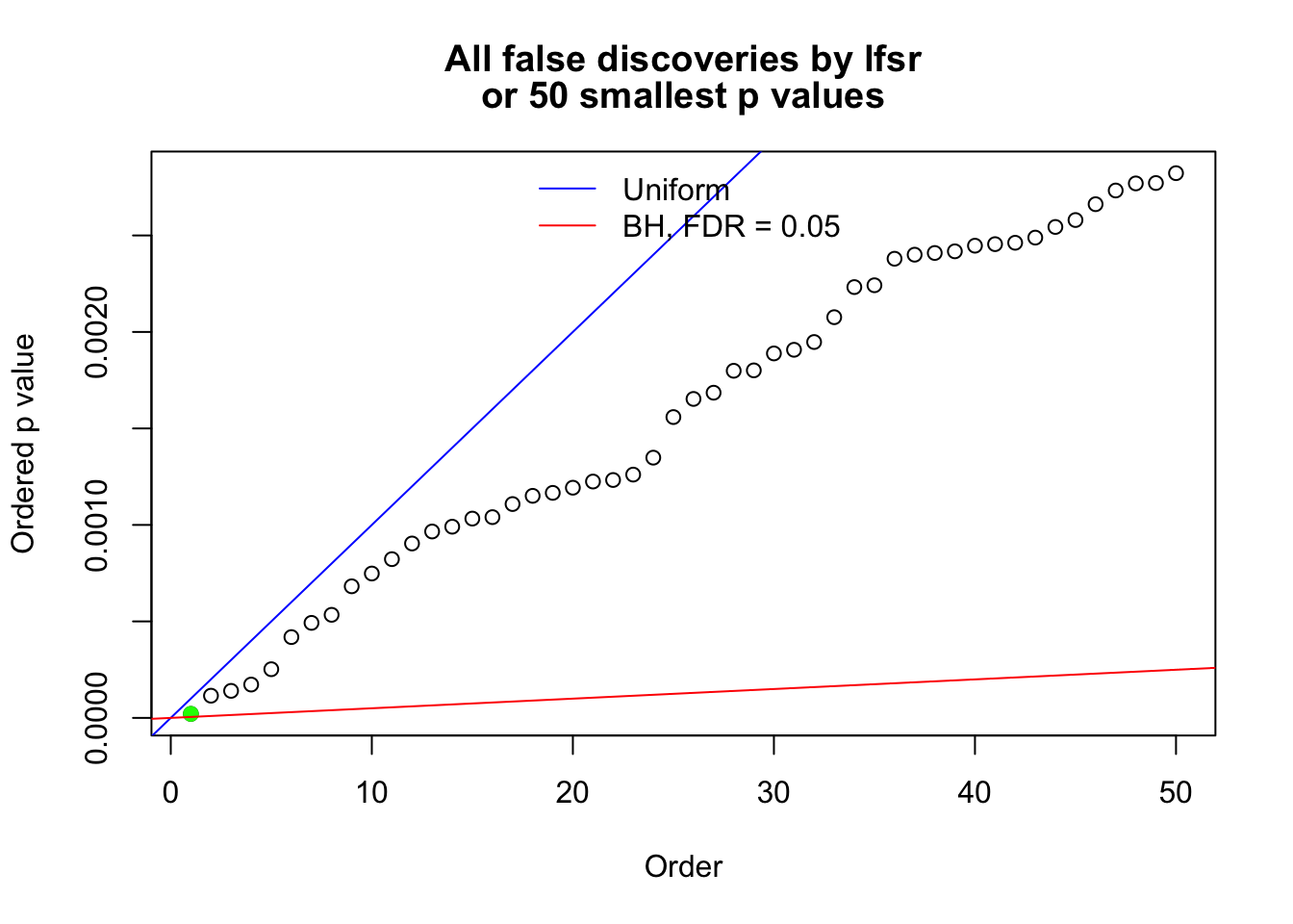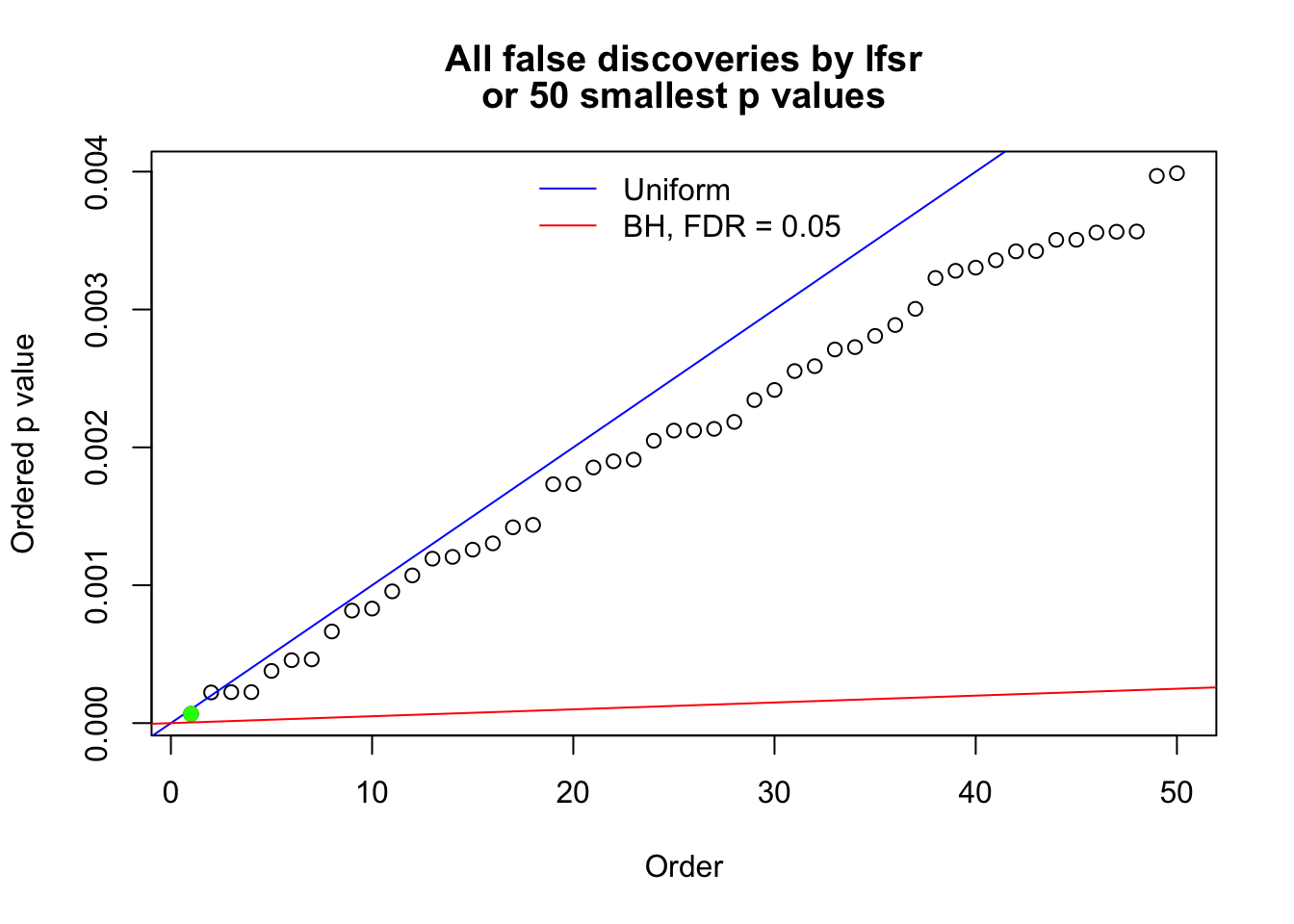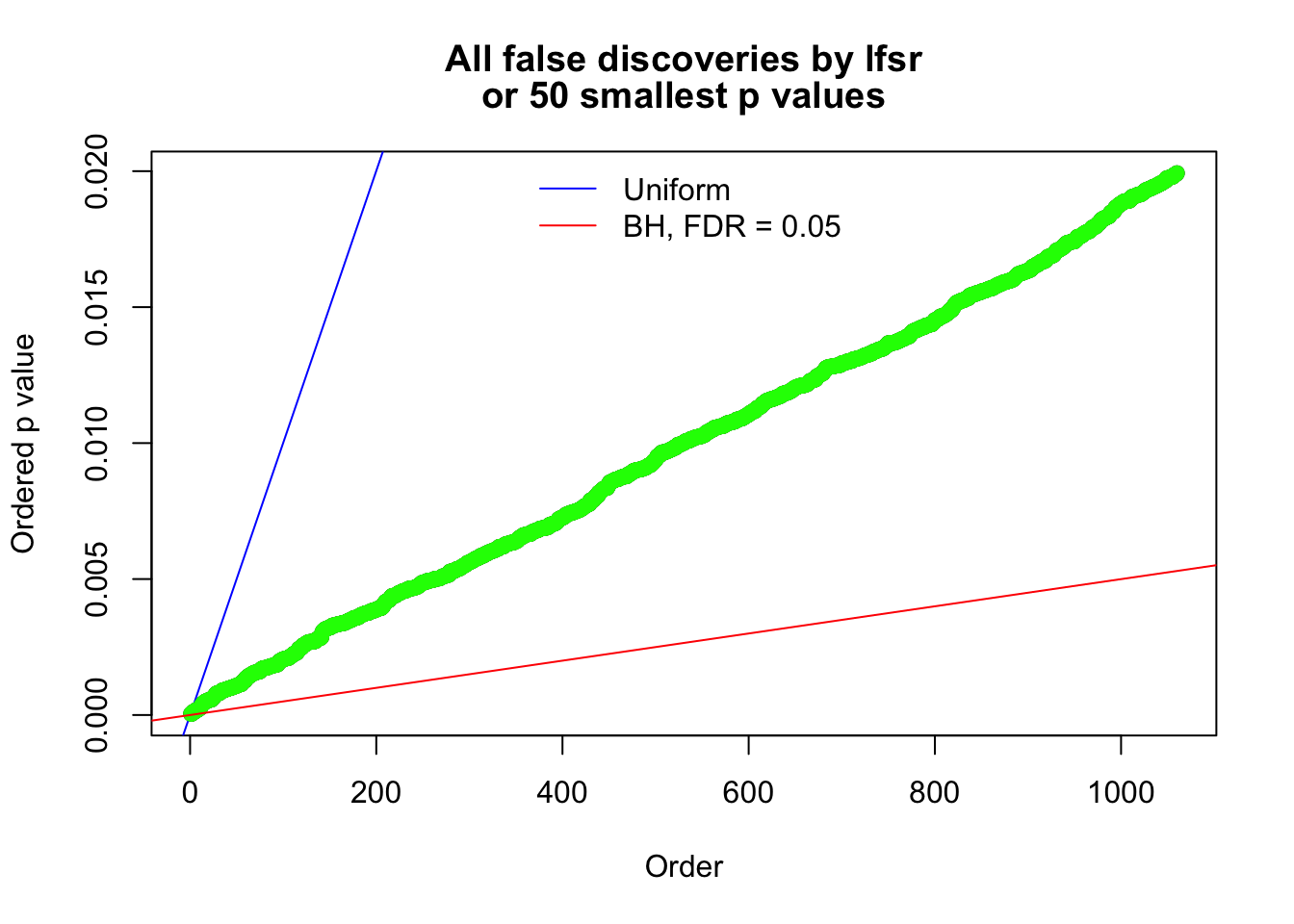 N0. 7 : Data Set 955 ; Number of False Discoveries by BH: 1 ; Number of False Discoveries by ASH's lfsr: 0 ; pihat0 = 0.9998902