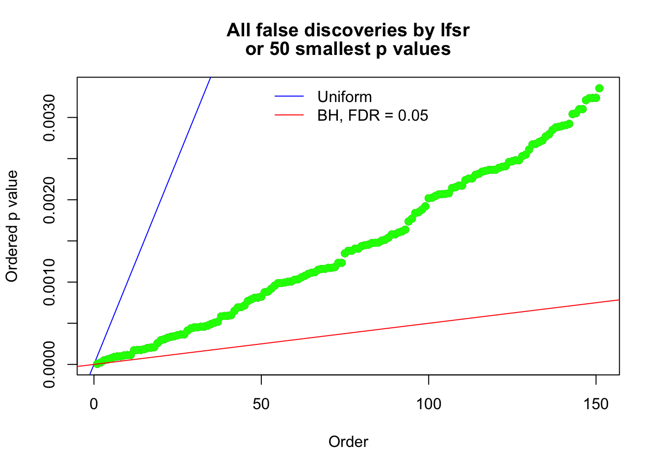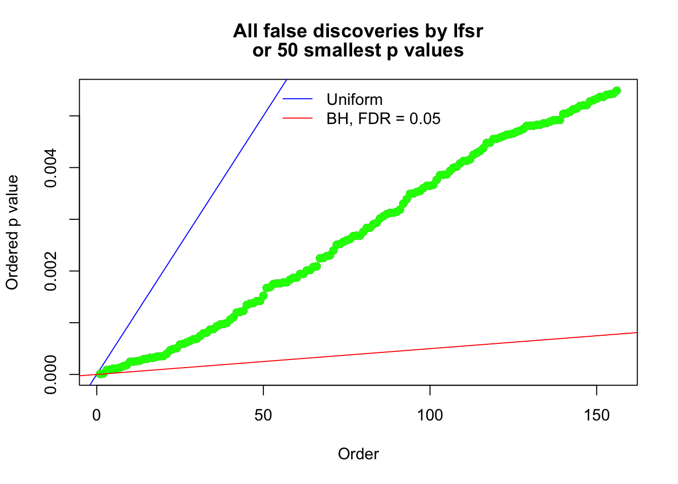 N0. 90 : Data Set 153 ; Number of False Discoveries by BH: 0 ; Number of False Discoveries by ASH's lfsr: 5 ; pihat0 = 0.05761454