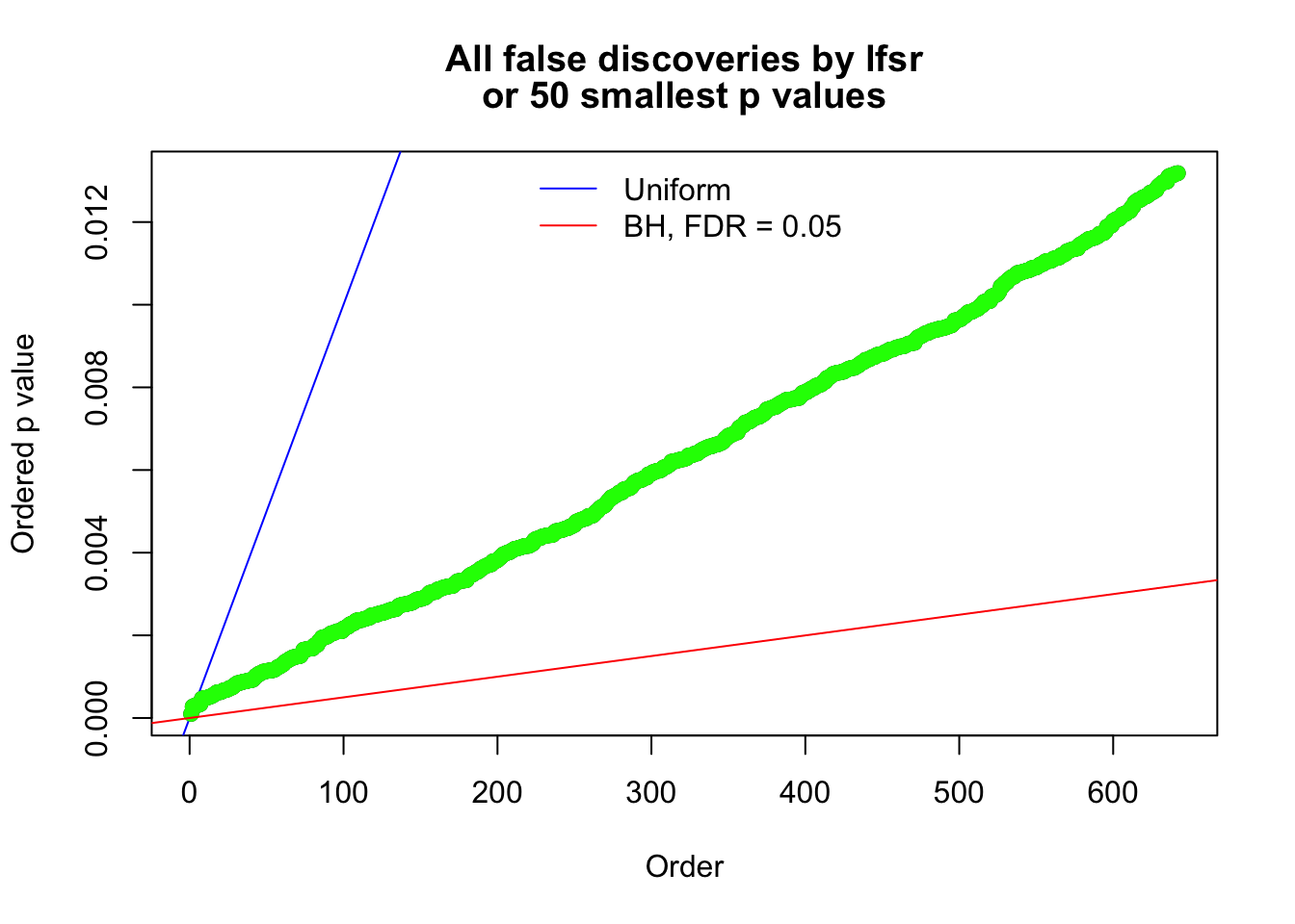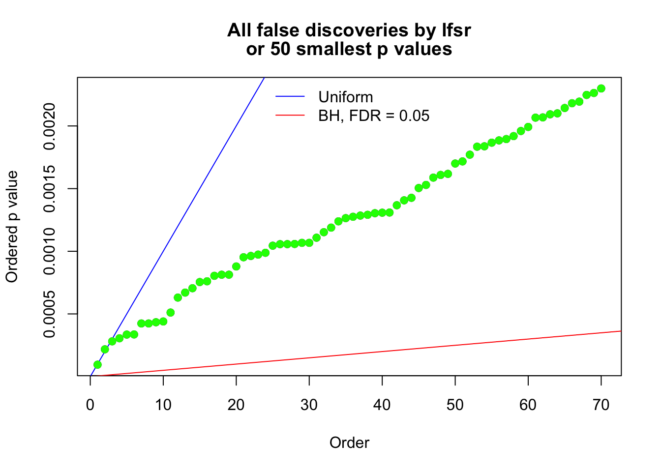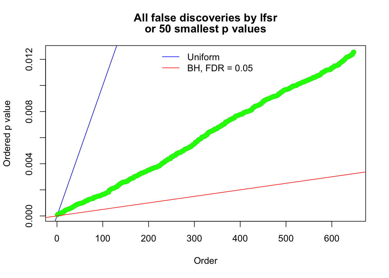 N0. 50 : Data Set 638 ; Number of False Discoveries by BH: 0 ; Number of False Discoveries by ASH's lfsr: 71 ; pihat0 = 0.05038079