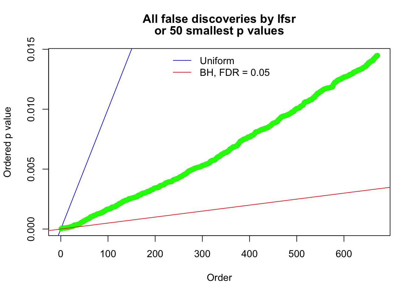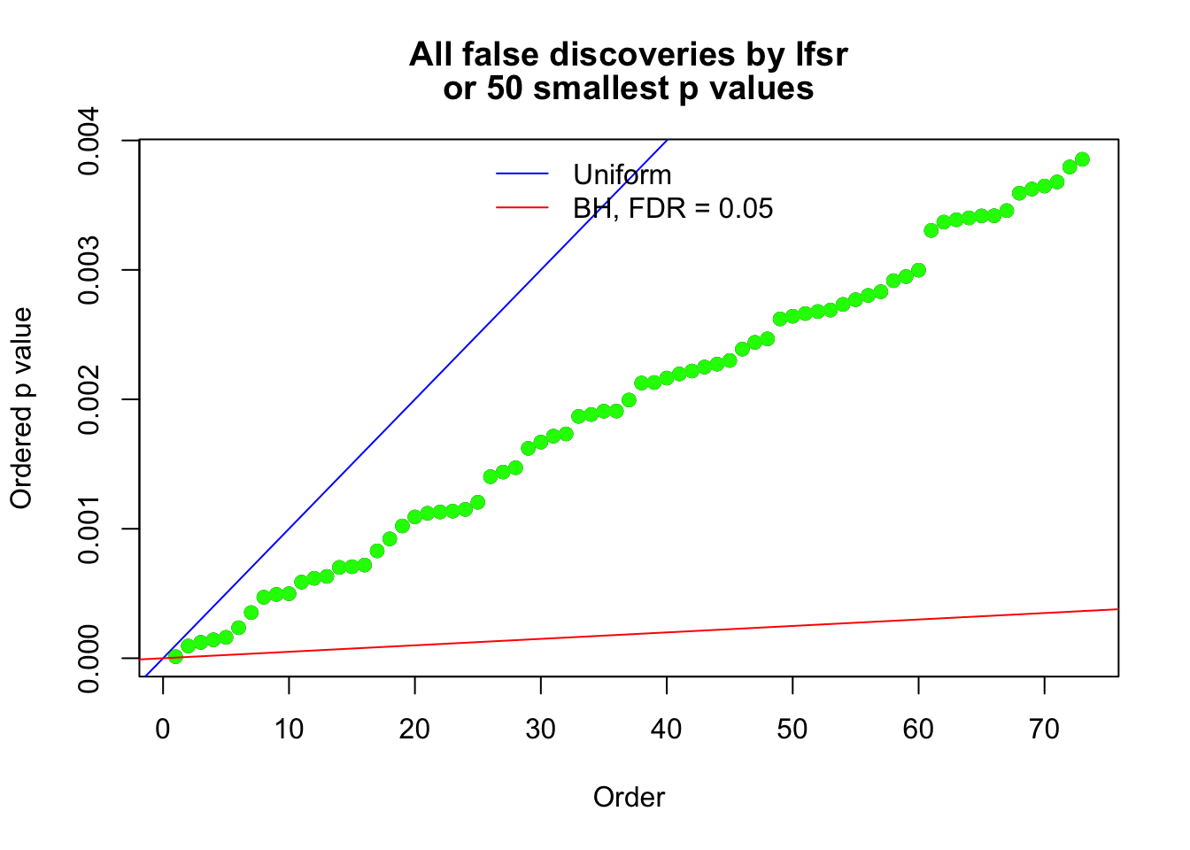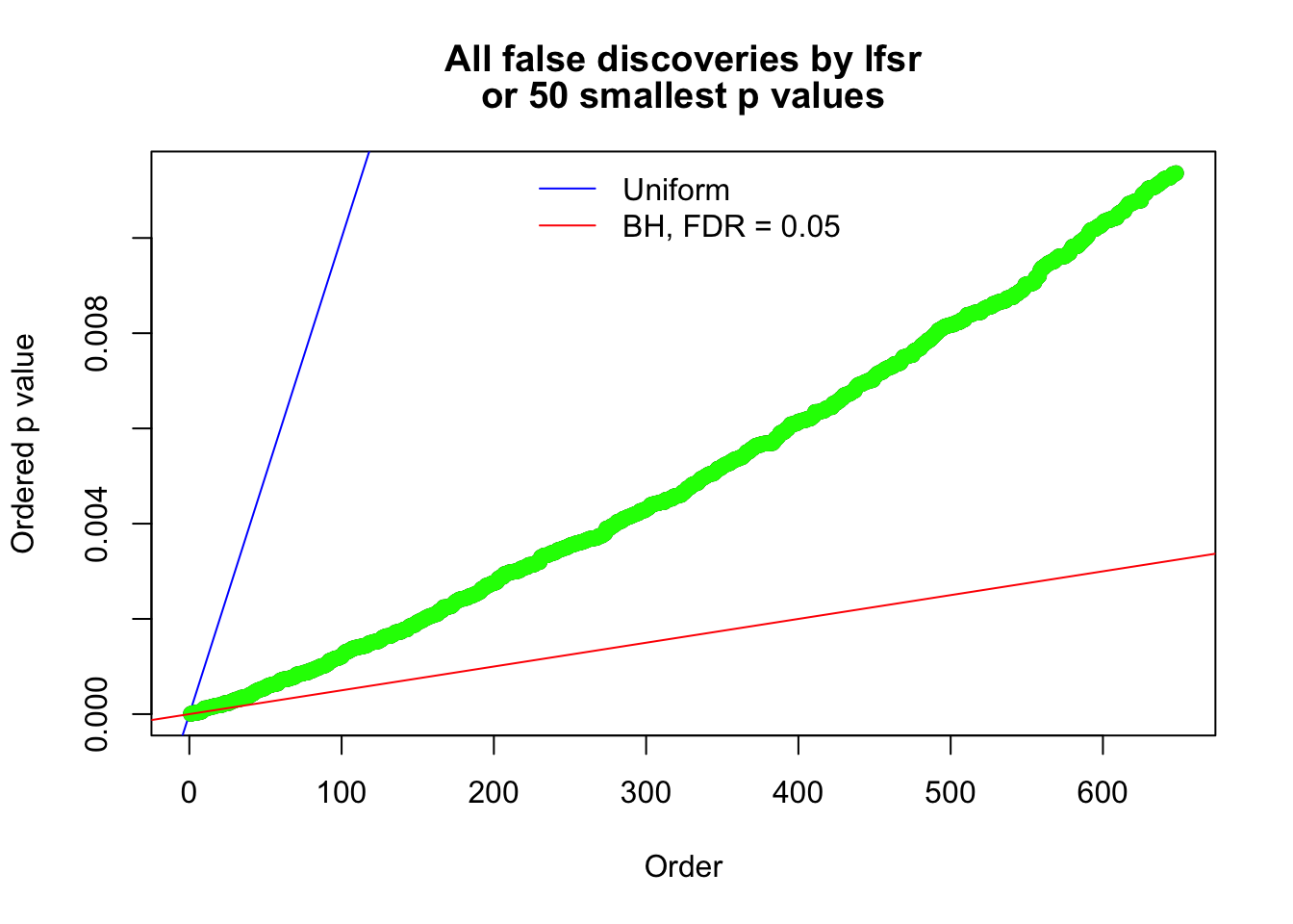 N0. 50 : Data Set 638 ; Number of False Discoveries by BH: 0 ; Number of False Discoveries by ASH's lfsr: 71 ; pihat0 = 0.05038079