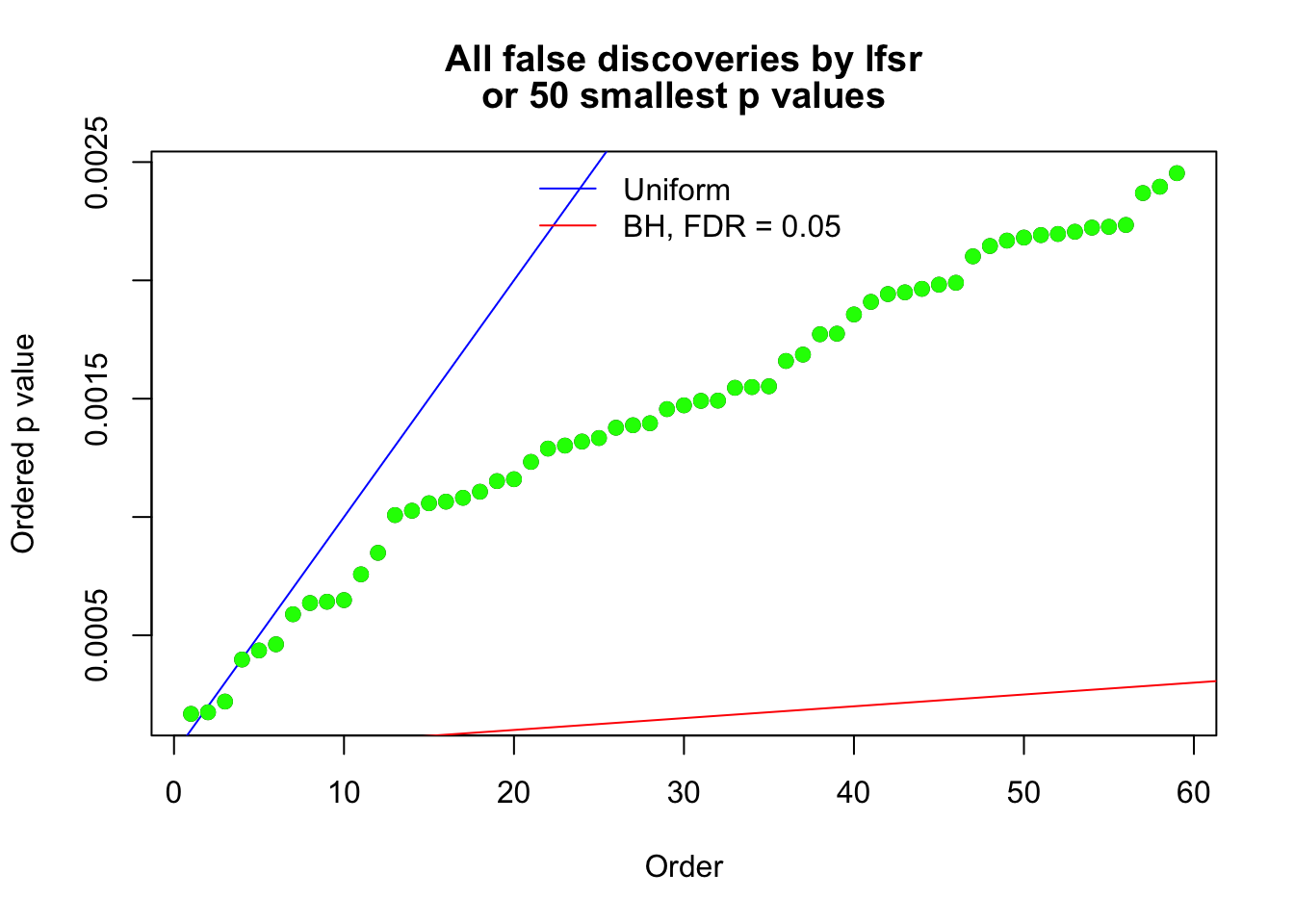 N0. 56 : Data Set 871 ; Number of False Discoveries by BH: 0 ; Number of False Discoveries by ASH's lfsr: 59 ; pihat0 = 0.07502045