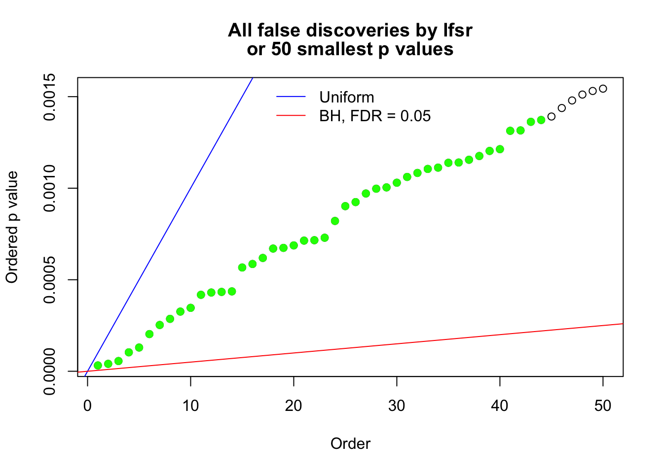 N0. 89 : Data Set 44 ; Number of False Discoveries by BH: 0 ; Number of False Discoveries by ASH's lfsr: 5 ; pihat0 = 0.07141674