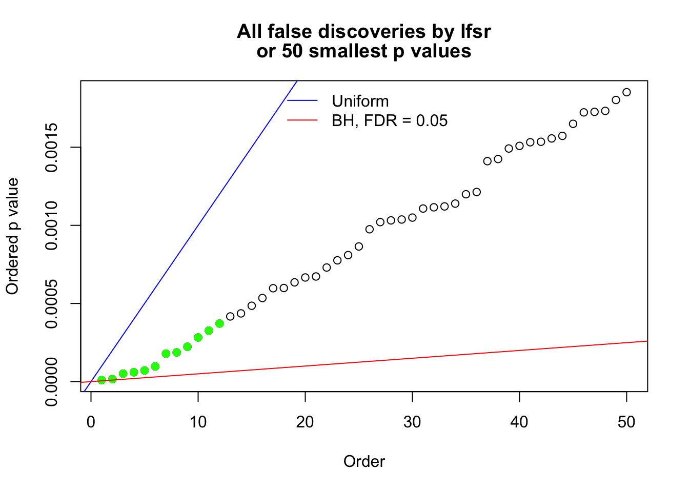 N0. 80 : Data Set 986 ; Number of False Discoveries by BH: 0 ; Number of False Discoveries by ASH's lfsr: 12 ; pihat0 = 0.2194227