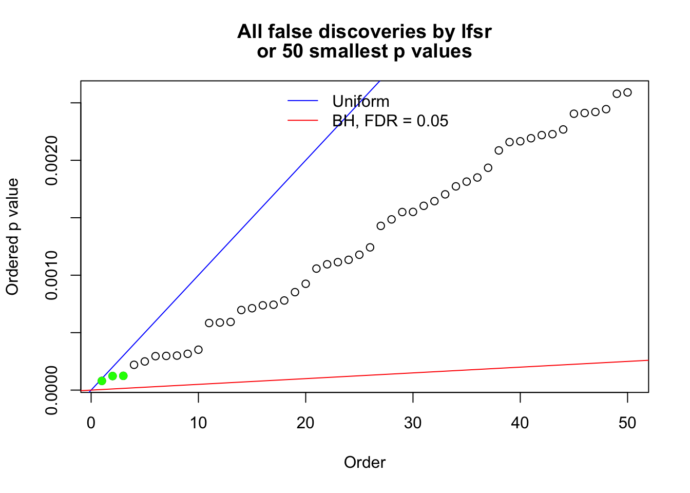 N0. 100 : Data Set 877 ; Number of False Discoveries by BH: 0 ; Number of False Discoveries by ASH's lfsr: 3 ; pihat0 = 0.1894112