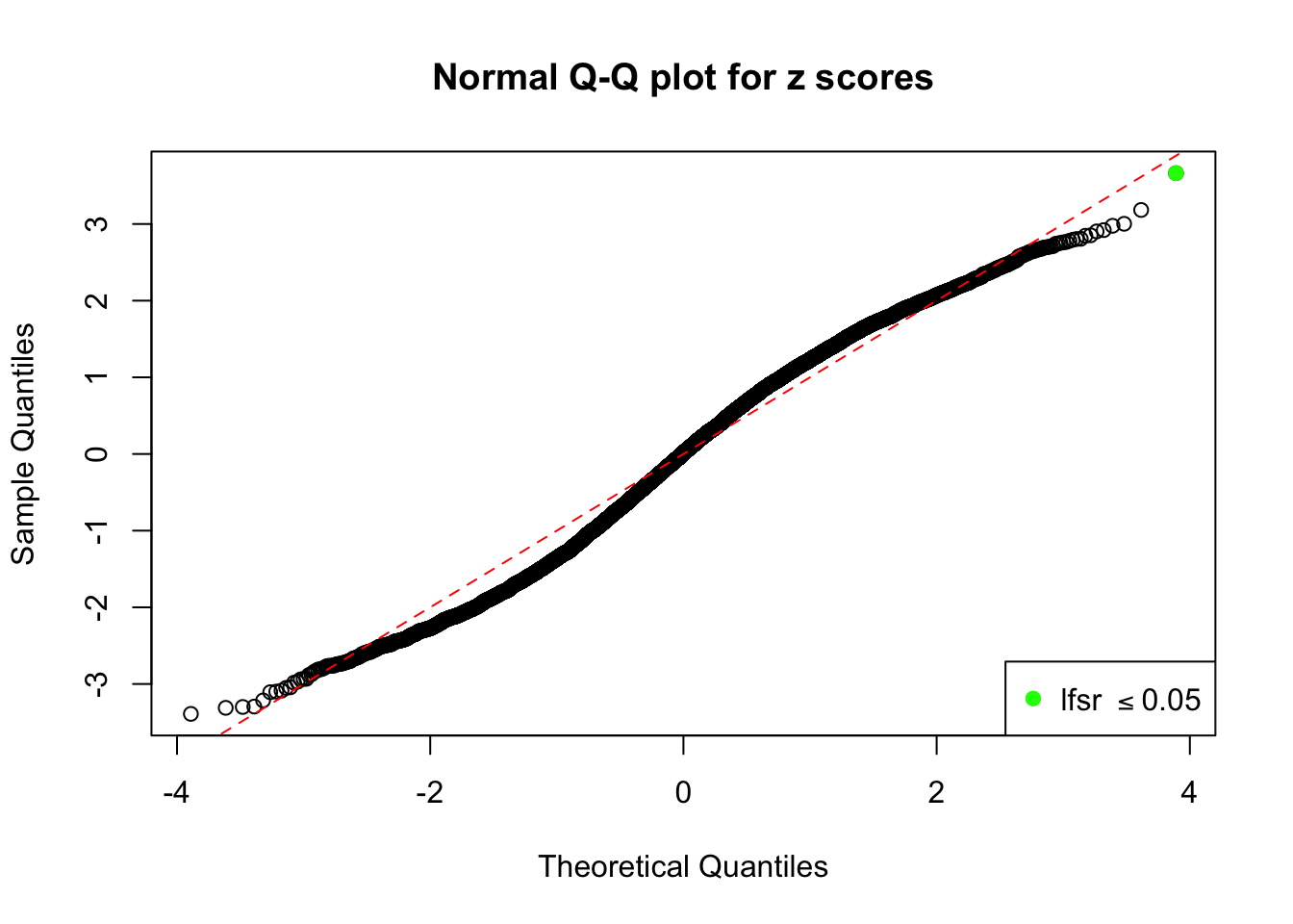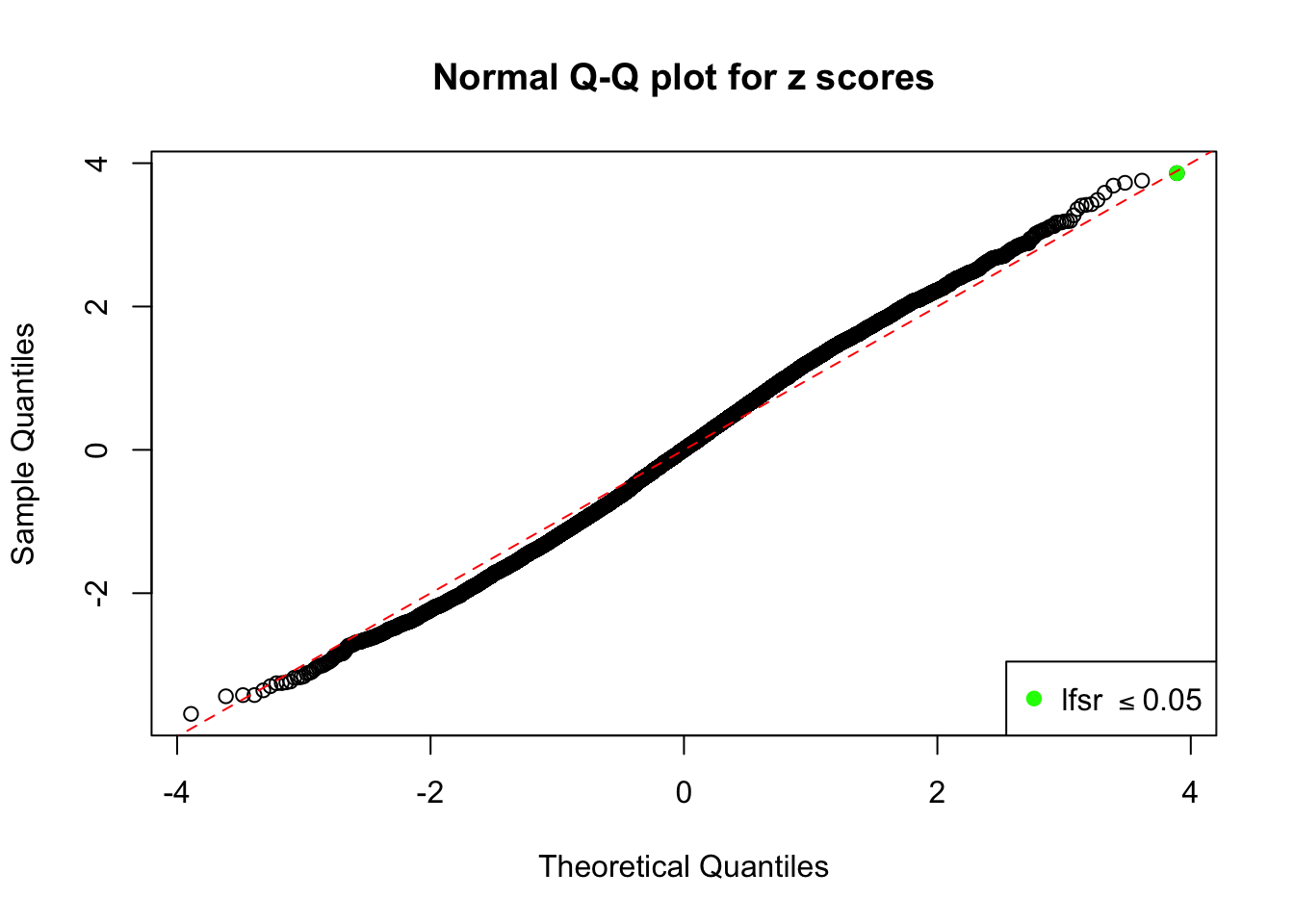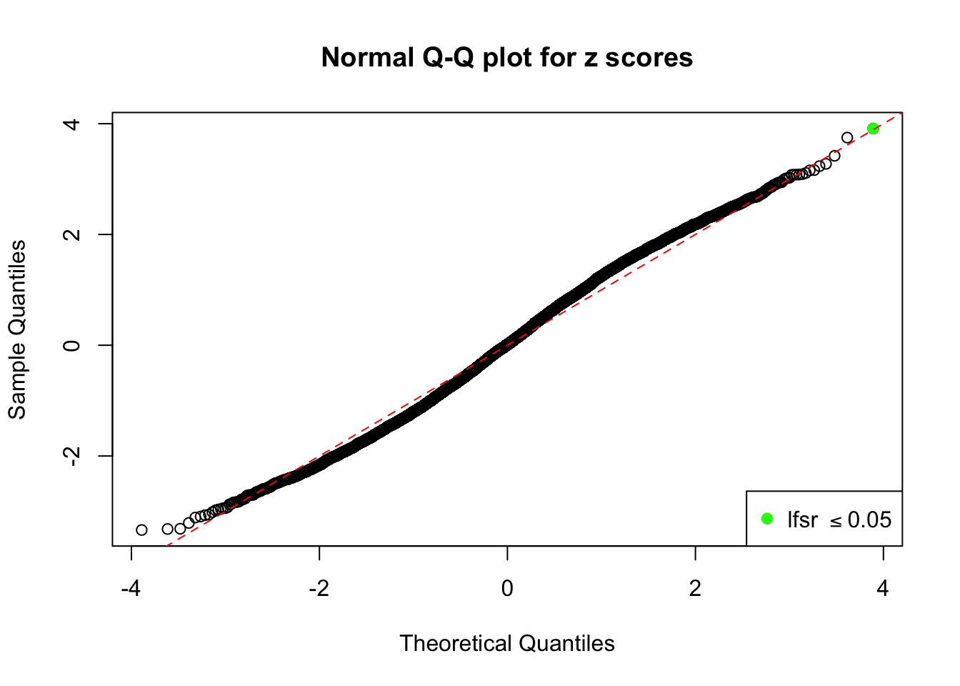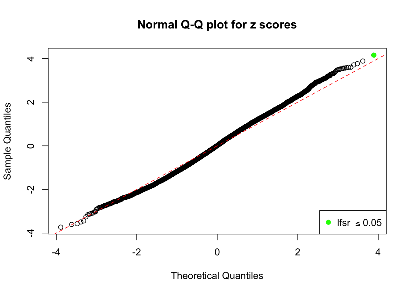 N0. 4 : Data Set 483 ; Number of False Discoveries by BH: 1 ; Number of False Discoveries by ASH's lfsr: 0 ; pihat0 = 0.9998828
