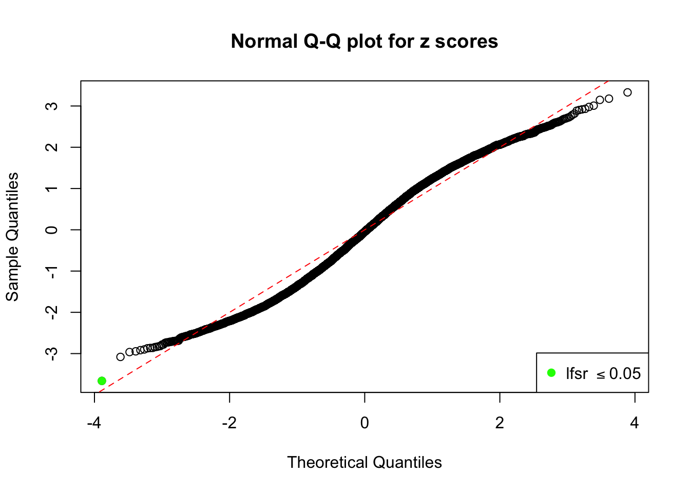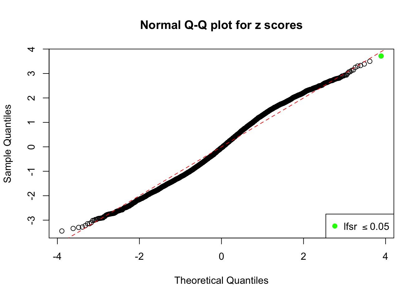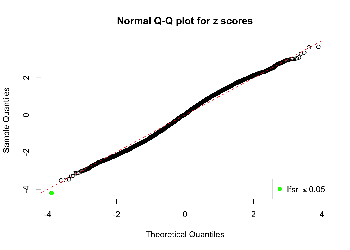 N0. 4 : Data Set 483 ; Number of False Discoveries by BH: 1 ; Number of False Discoveries by ASH's lfsr: 0 ; pihat0 = 0.9998828