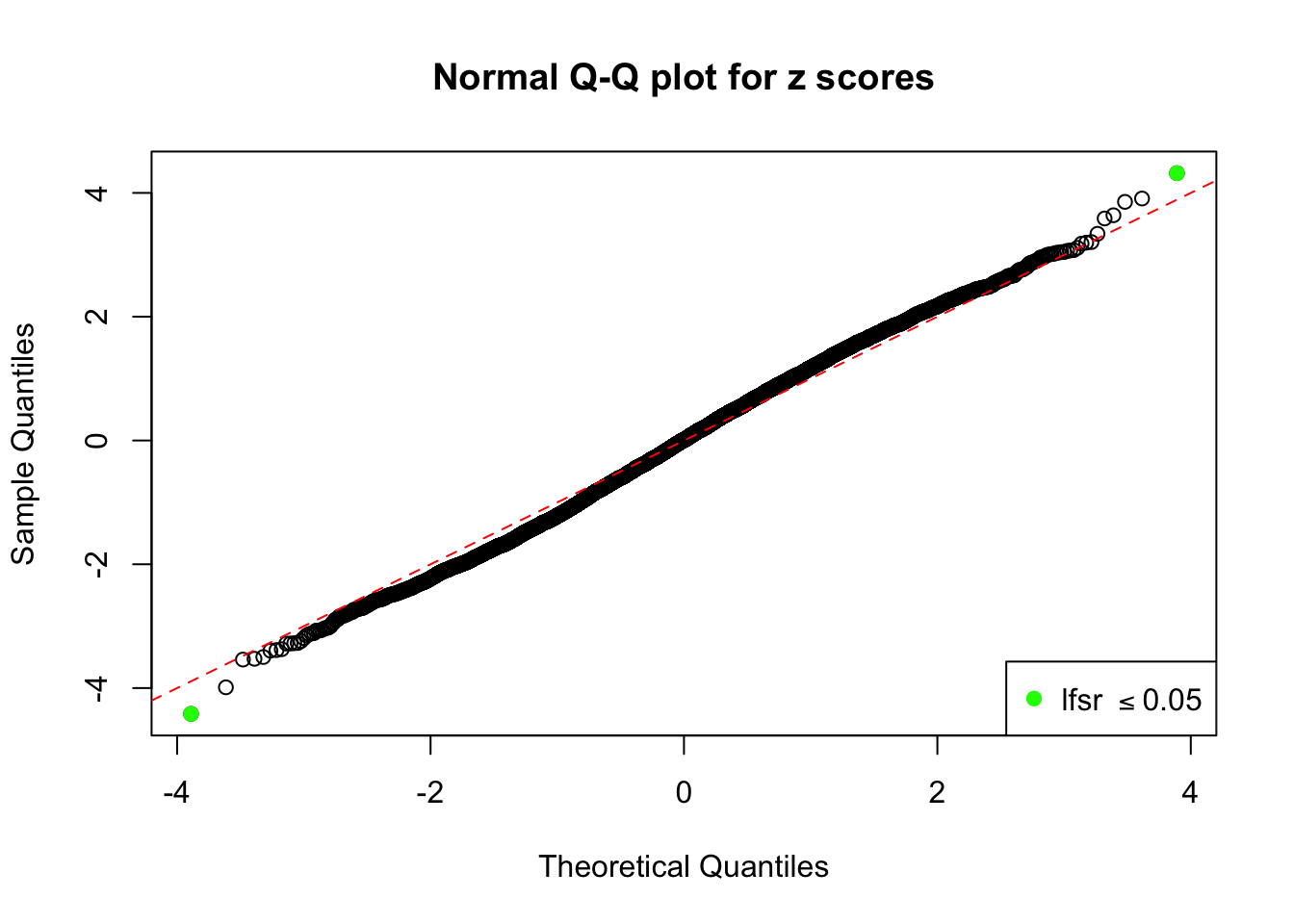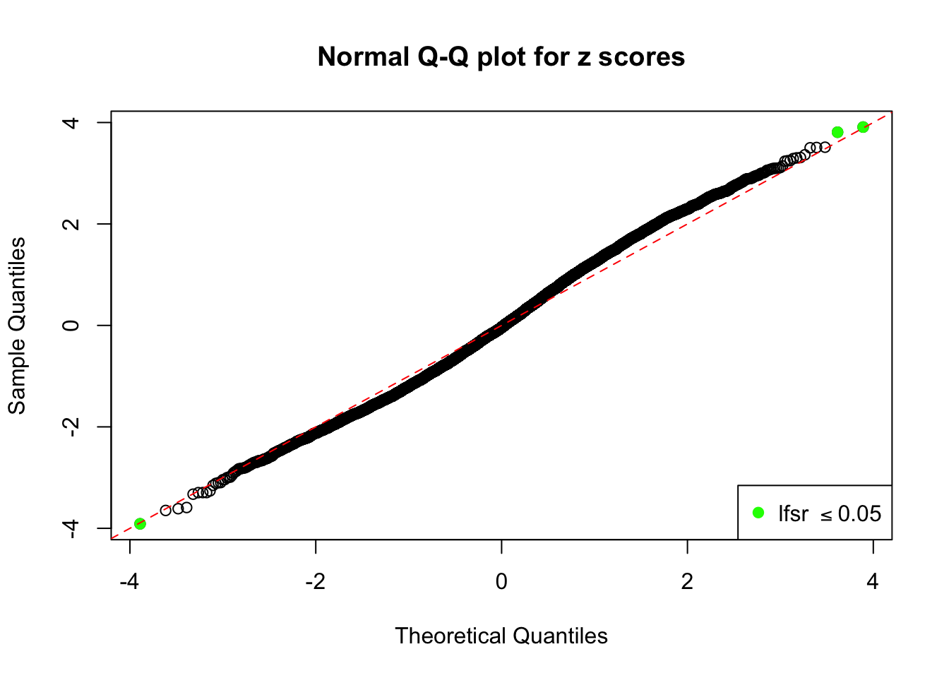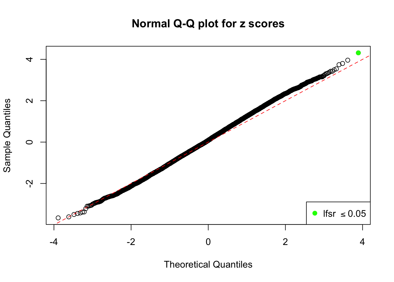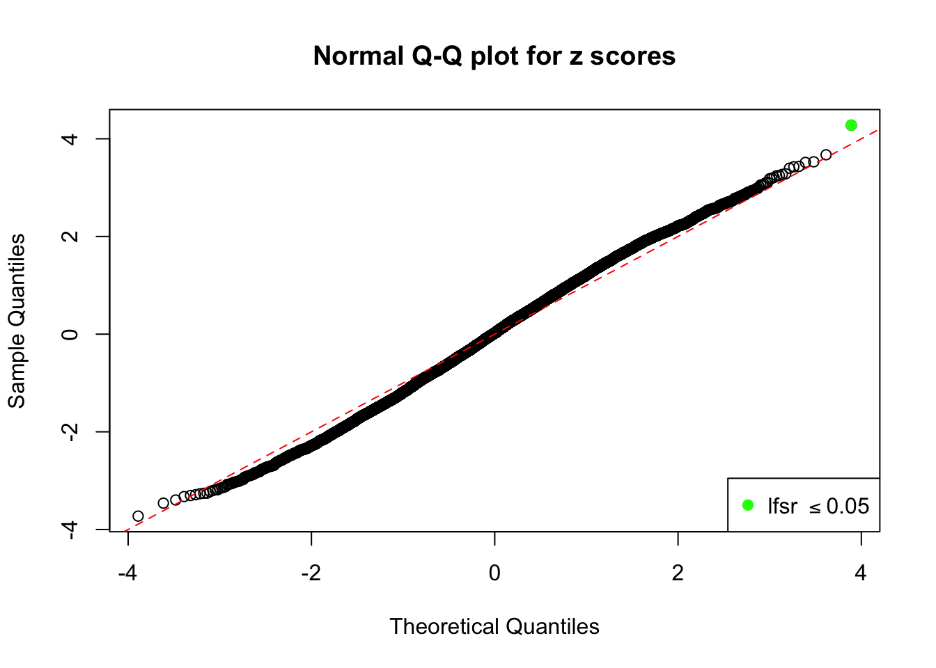 N0. 4 : Data Set 483 ; Number of False Discoveries by BH: 1 ; Number of False Discoveries by ASH's lfsr: 0 ; pihat0 = 0.9998828