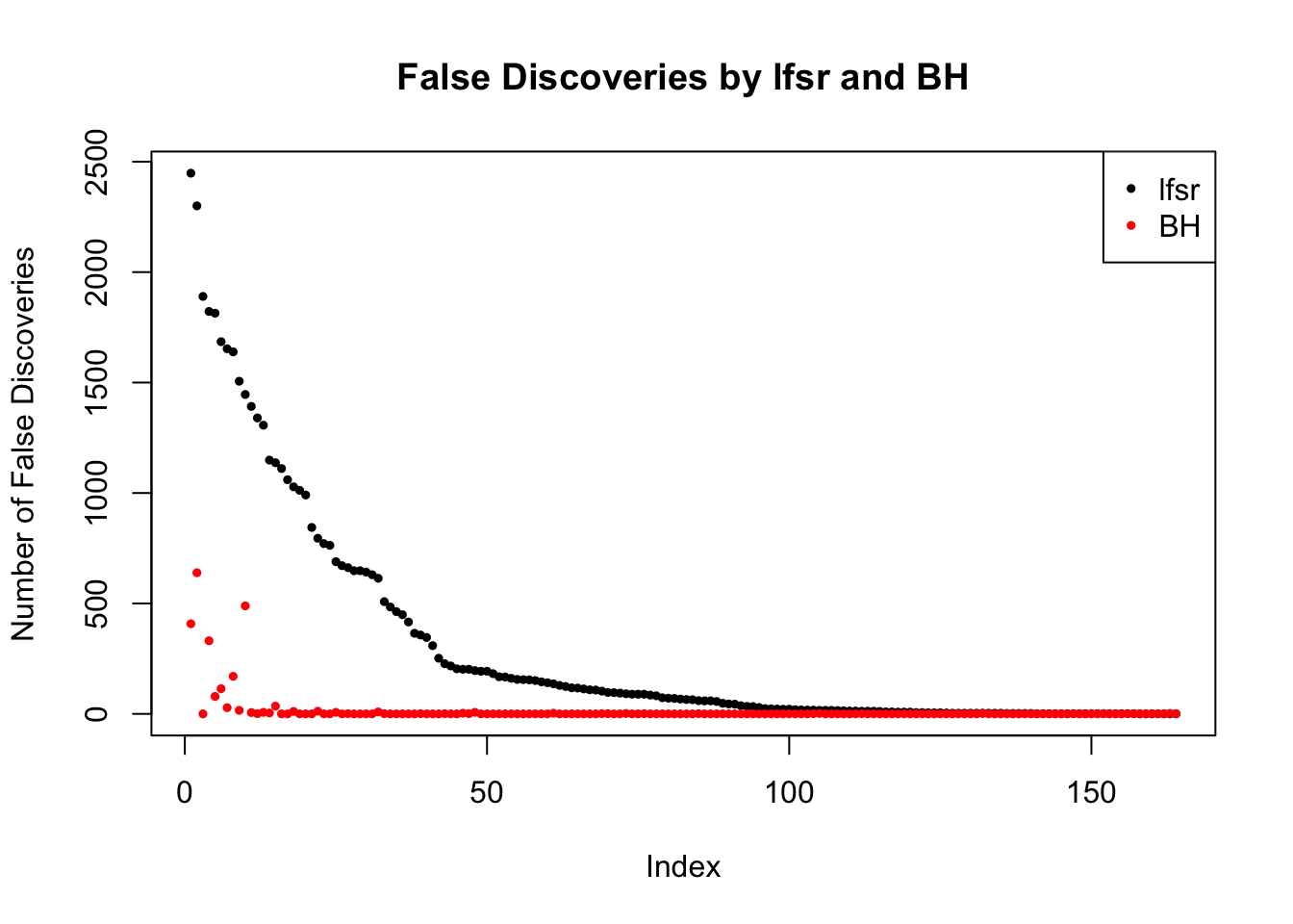 N0. 2 : Data Set 33 ; Number of False Discoveries by BH: 0 ; Number of False Discoveries by ASH's lfsr: 1111 ; pihat0 = 0.01048871