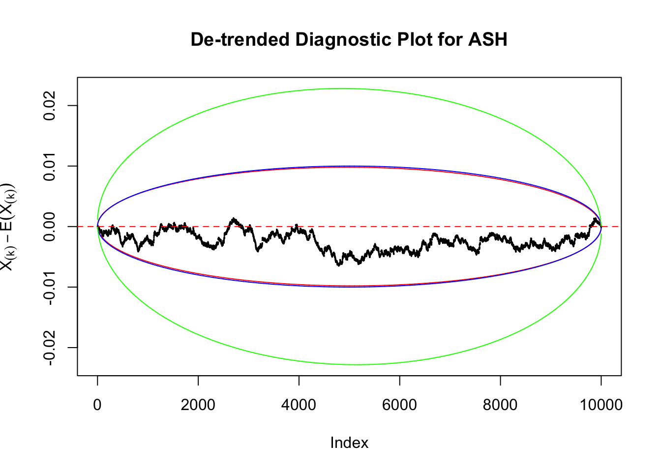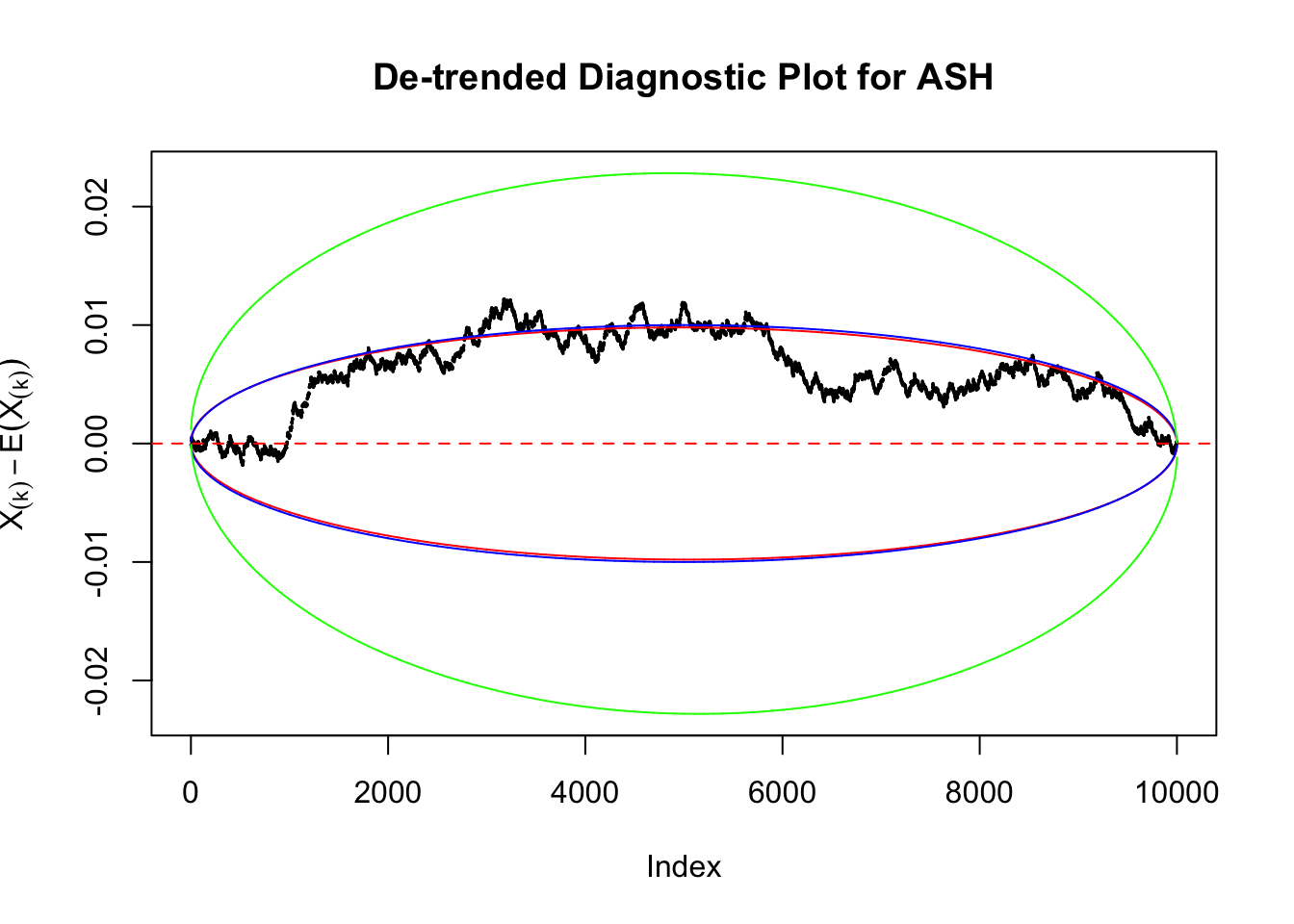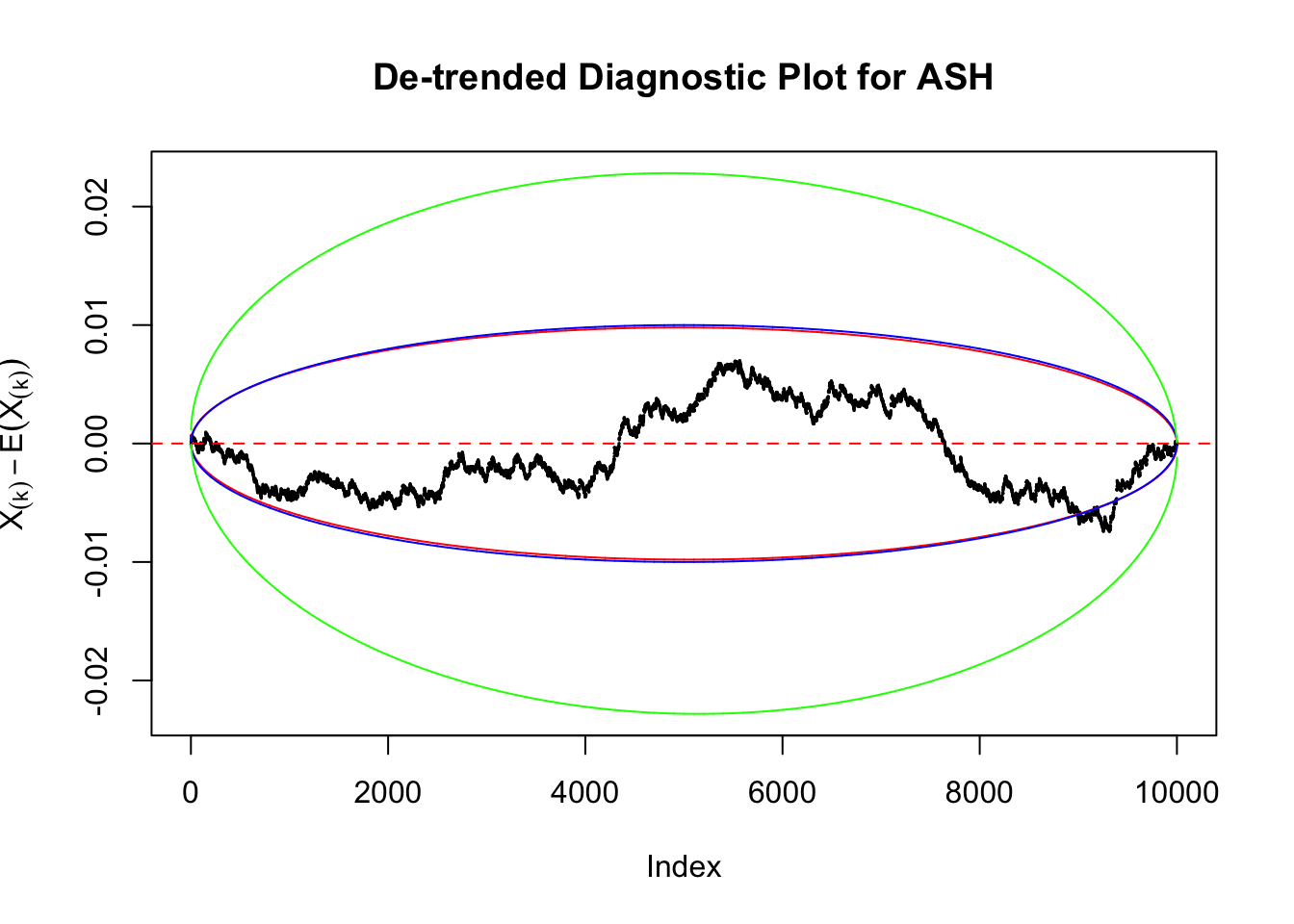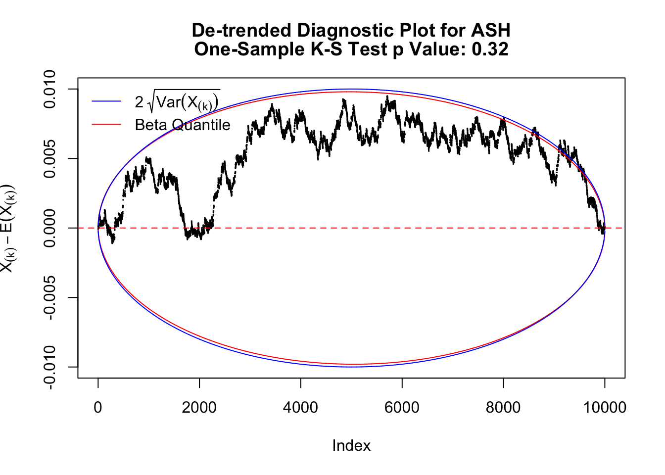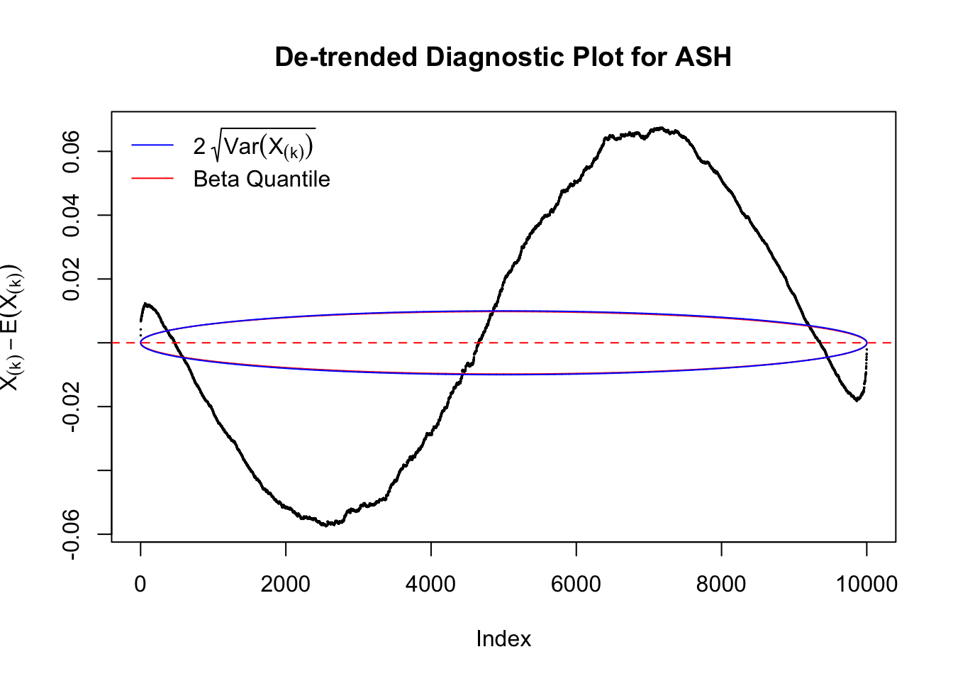 Therefore, we can plot \(X_{(k)} - E\left[X_{(k)}\right]\) along with two error bounds. One choice of the error bounds is to use \(\pm2\sqrt{Var\left(X_{(k)}\right)}\) (in blue); another is to use the \(\alpha / 2\) and \(1-\alpha/2\) quantiles of \(\text{Beta}\left(k, n+1-k\right)\) (in red). Points outside the error bounds thus indicate deviation from the uniform distribution. This plot can be called the de-trended plot.