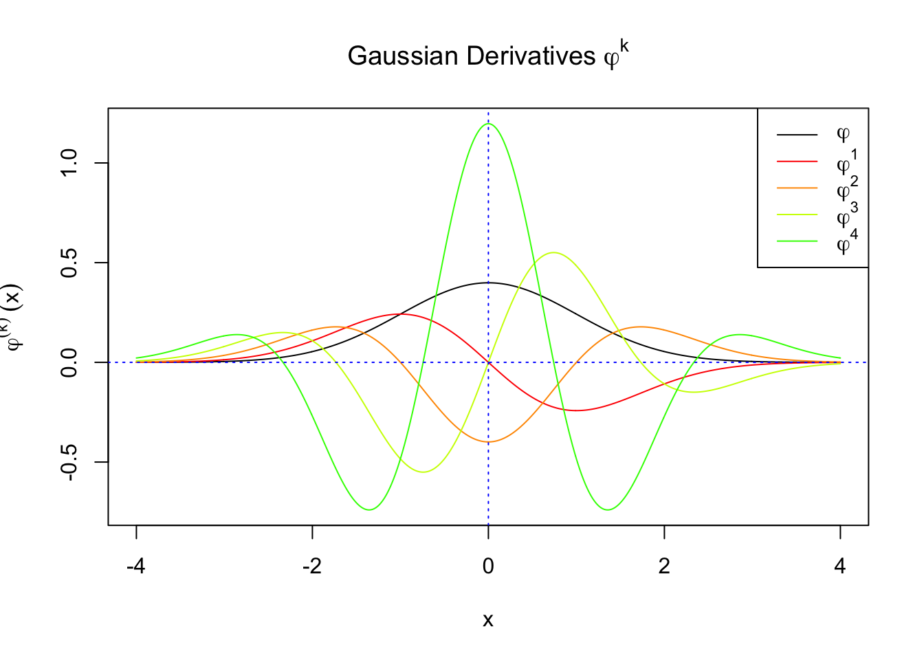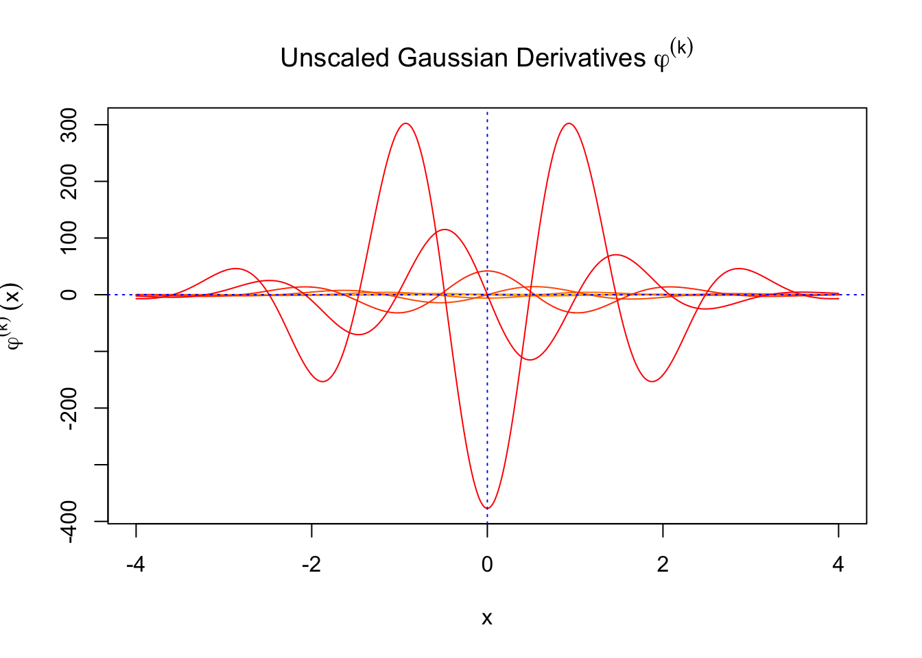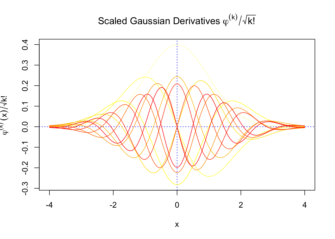 \(f_0(x)\) involves Gaussian derivatives \(\varphi^{(k)}\), and many properties of them have been thoroughly studied. For starters, they are closely related to the probabilists’ Hermite polynomials \(h_k\) in that