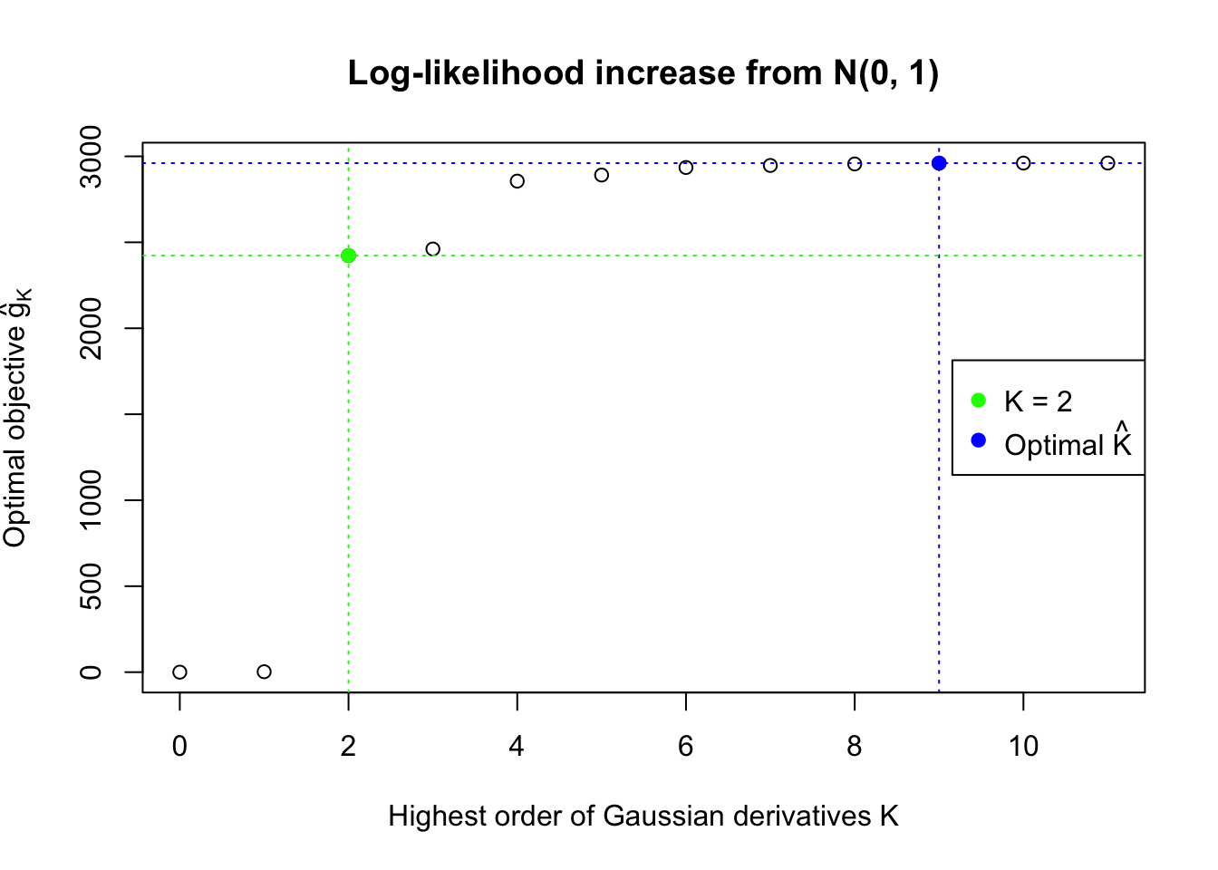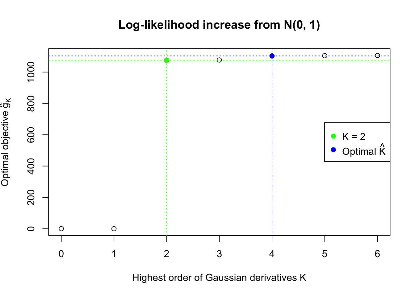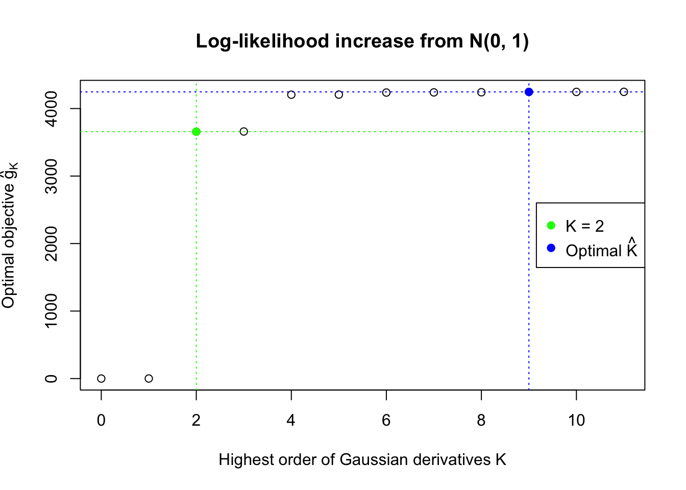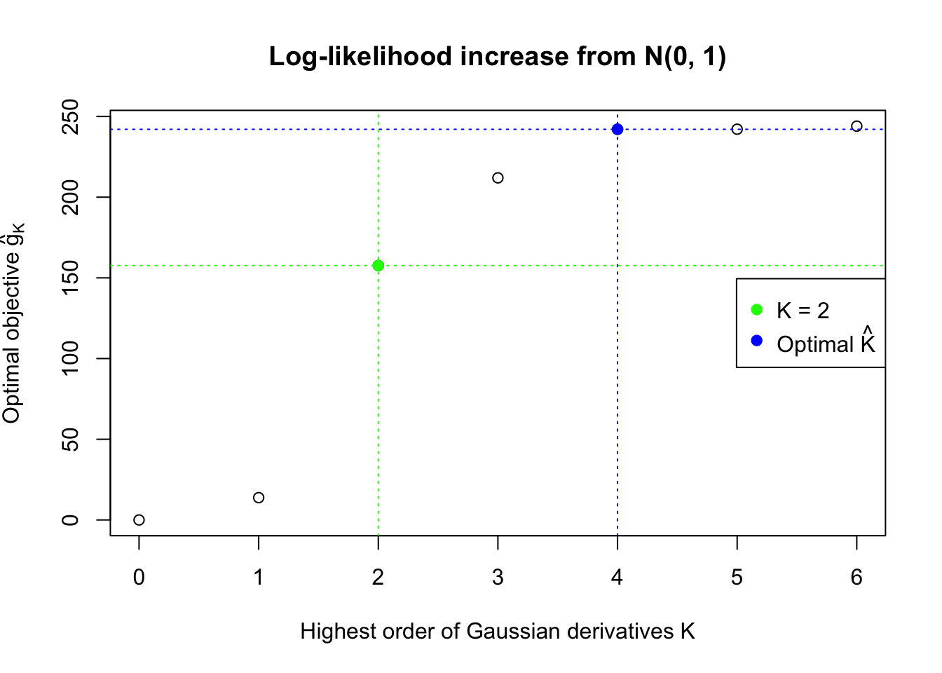 \(M\) should be greater than \(1\) because odd order Gaussian derivatives and even order ones have distinct properties, especially in lower orders. Odd order Gaussian derivatives are odd functions, more associated with the skewness of the empirical distribution, whereas even order ones are even functions, more associated with its kurtosis. Therefore, it’s not at all impossible that the difference in the log-likelihood objective between \(K\) and \(K + 1\) is small, yet that between \(K\) and \(K + 2\) is large.