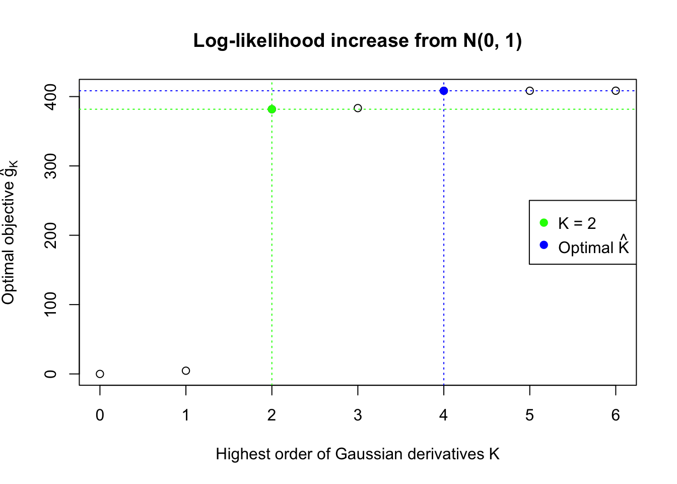 With finite \(K\) Gaussian derivatives, the fitted log-likelihood \(\log\prod\limits_{i = 1}^nf_0(z_i) = \sum\limits_{i = 1}^n\log \varphi(z_i) + \sum\limits_{i = 1}^n\log\left(1 +\sum\limits_{k = 1}^K \hat w_kh_k(z_i)\right)\). Note that \(\hat w_k \equiv 0\) is a feasible solution, so the optimal solution will always have a log-likelihood no less than \(\sum\limits_{i = 1}^n\log \varphi(z_i)\), the log-likelihood of \(N(0, 1)\). Similarly, let \(\hat w_K\) be the optimal solution with \(K\) Gaussian derivatives, then \([\hat w_K, 0]\) will be a feasible solution with \(K + 1\) Gaussian derivatives, with the same objective value, which should be no larger than the optimal objective value for \(K + 1\). This fact implies that the fitted log-likelihood should be non-decreasing with respect to \(K\).