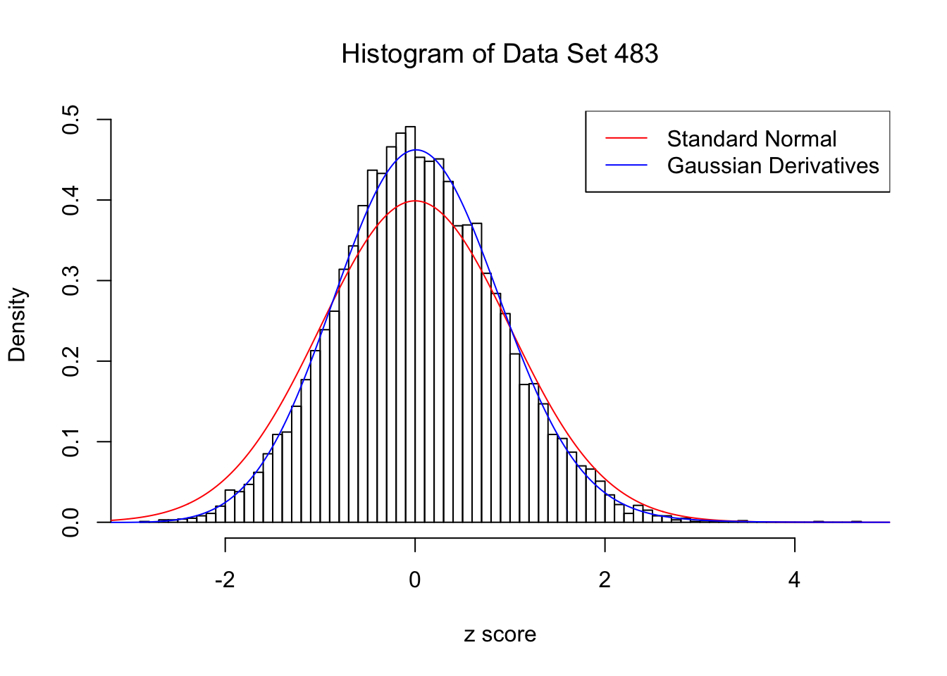 For each of these selected data sets, we plot the histogram, the density of \(N(0, 1)\) in red line, and that fitted by Gaussian derivatives in blue. We also give the information of the number of false discoveries by Benjamini-Hochberg, and \(\hat\pi_0\) estimated by ash. Note that BH’s false discoveries suggests the inflation of the most extreme observations, whereas ash’s \(\hat\pi_0\) the empirical distribution’s general deviation from \(N(0, 1)\).