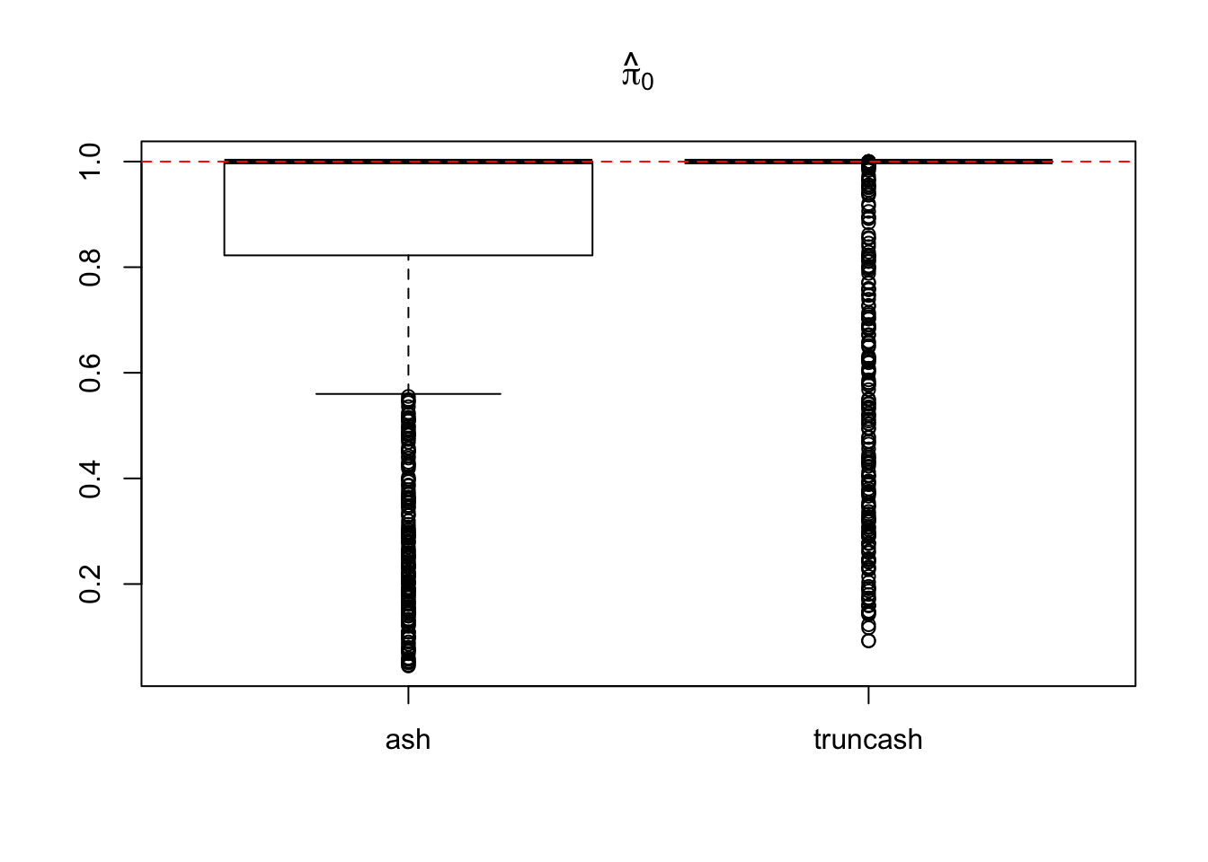 boxplot(pihat0.ash, pihat0.truncash, main = expression(hat(pi)[0]), names = c("ash", "truncash"))