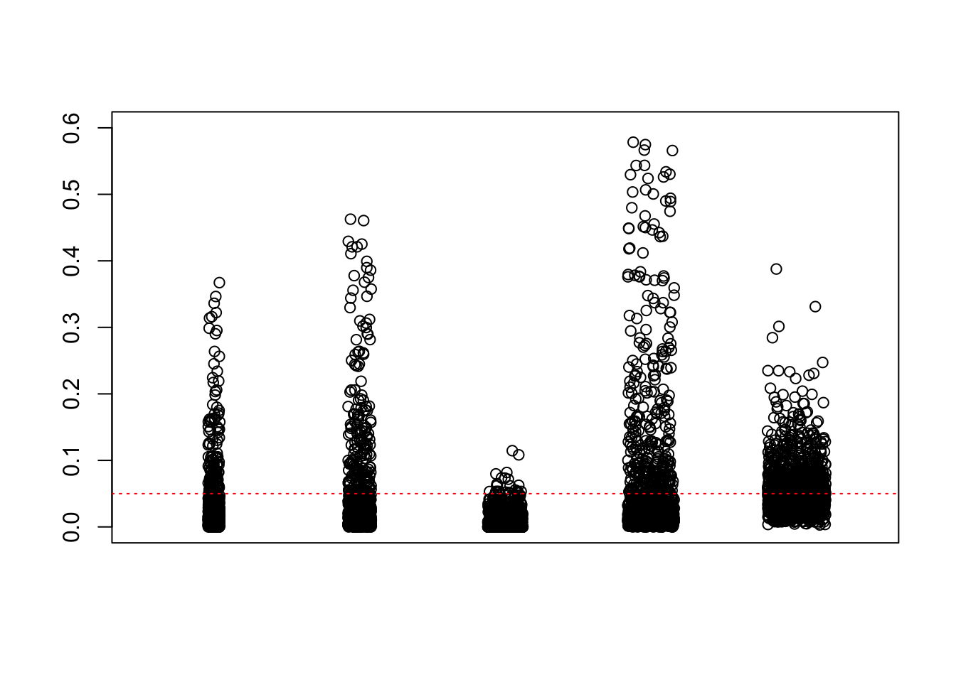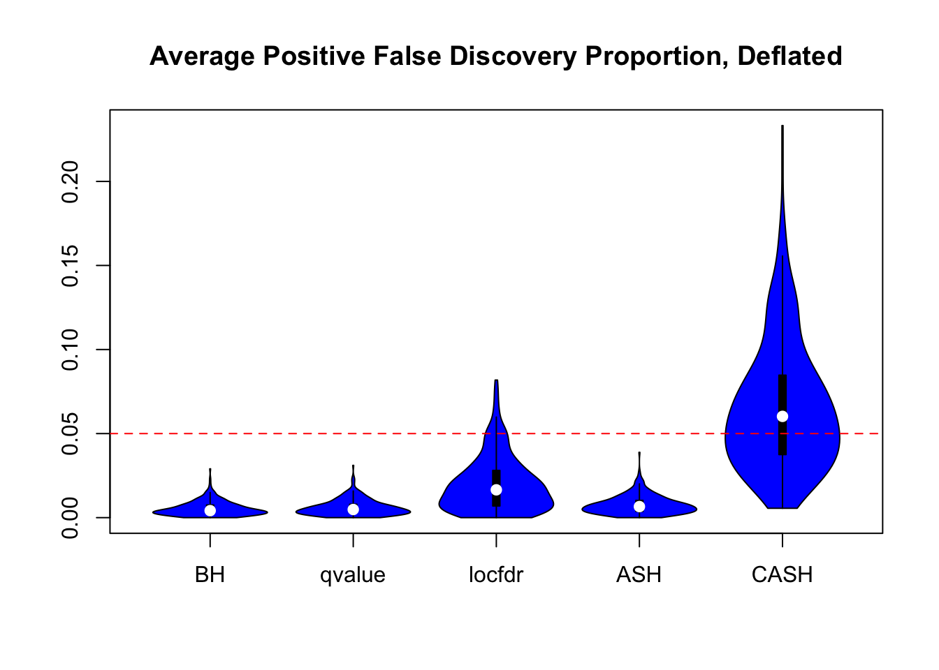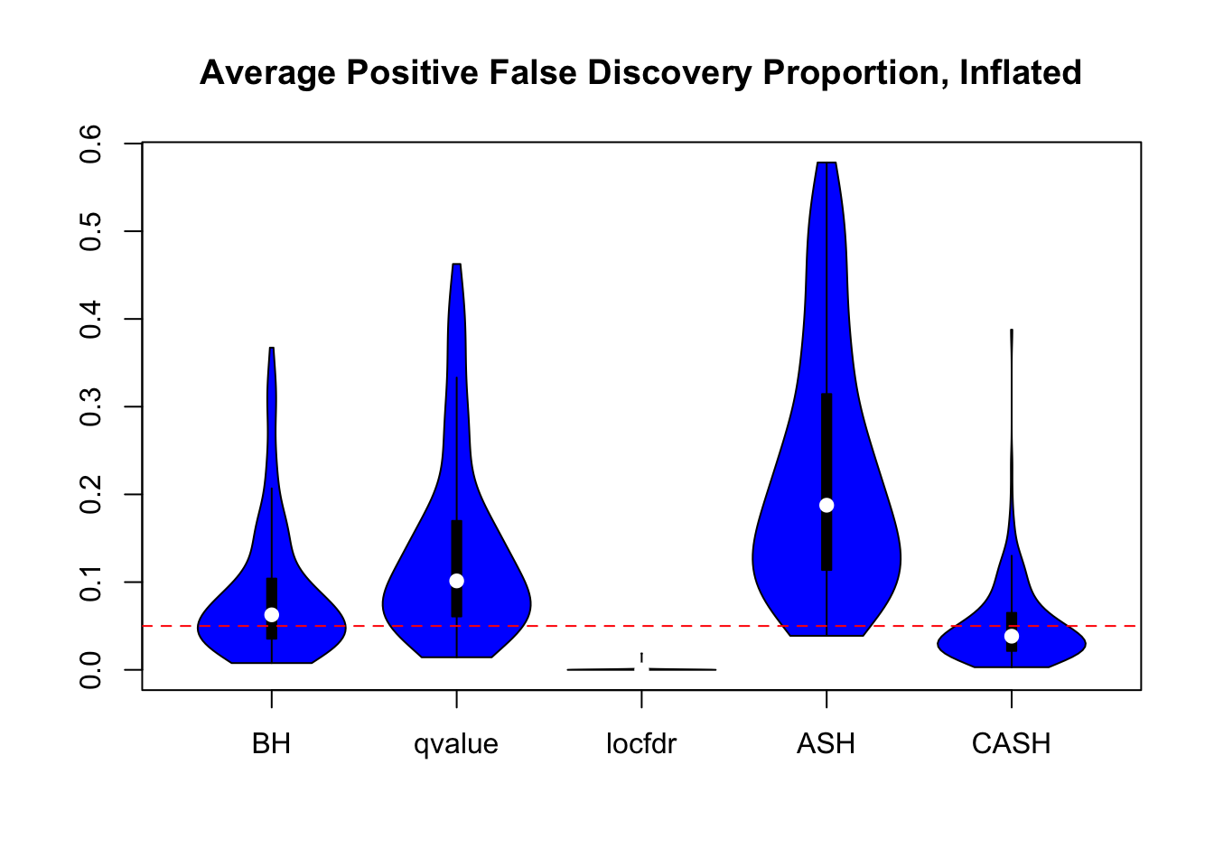 We are using the data obtained from the large-scale simulation with real data to show the variability of the positive false discovery proportions obtained by different methods at nominal \(q\) value $ = 0.05$. The true effect distribution is \(0.6\delta_0 + 0.3N(0, 1) + 0.1N(0, 2^2)\).