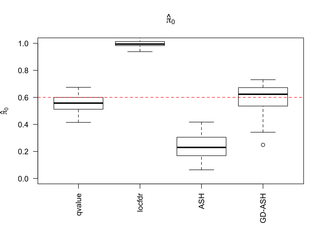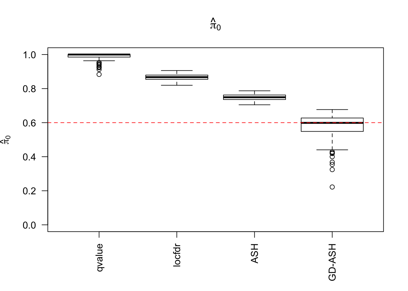 Then let \(\hat\beta_j = \beta_j + \hat s_j z_j\). We are using \(\hat\beta_j\), \(\hat s_j\), along with \(\hat z_j = \hat\beta_j / \hat s_j\), \(\hat p_j= 2\left(1 - \Phi\left(\left|\hat z_j\right|\right)\right)\), as the summary statistics fed to GD-ASH and GD-Lik, as well as into BH, qvalue, locfdr, ASH for a comparison.