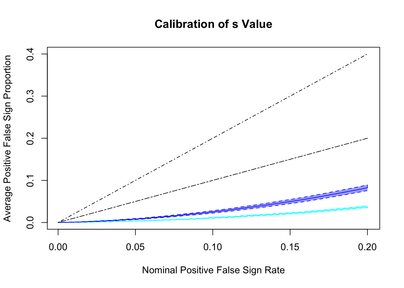 Dashed lines are \(y = x\) and \(y = 2x\). ASH and qvalue are too liberal, and locfdr is too conservative. GD-ASH and BH give very similar results and not far off. BH’s calibrates pFDR relatively well, even though it’s only guaranteed to control FDR under independence. GD-Lik calibrates pFDR almost precisely.