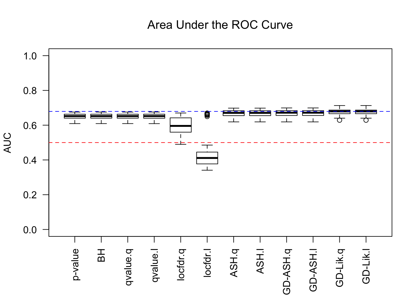 For almost all methods, .q means using q values, and .l using local FDRs. GD-Lik is the best, yet even the vanilla \(p\) values are not much worse. It indicates that all the methods based on summary statistics indeed make few changes to the order of original \(p\) values. Worth noting is that locfdr doesn’t perform well, and lfdr’s give a drastically different result than q values do, probably due to some artifacts like ties.