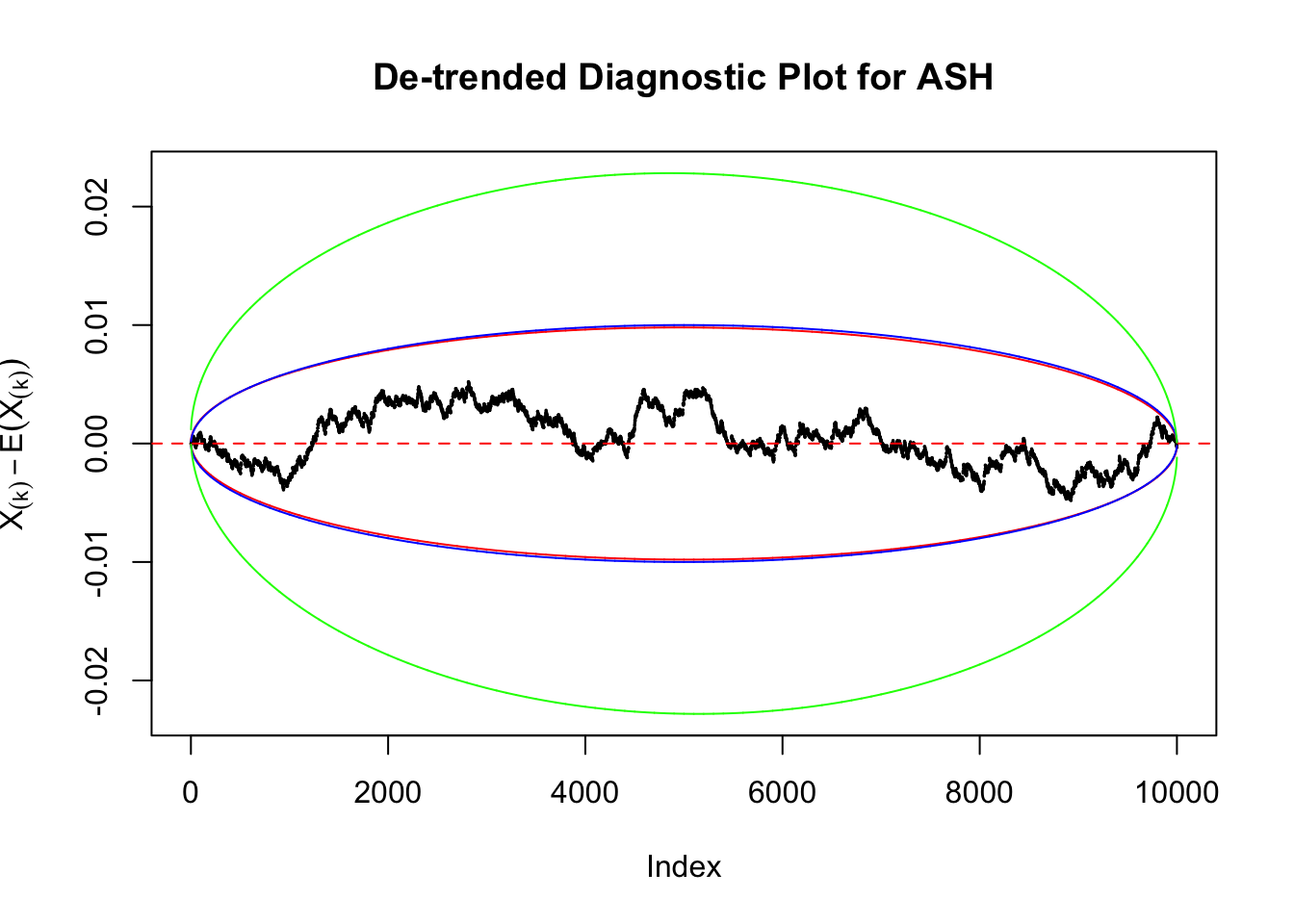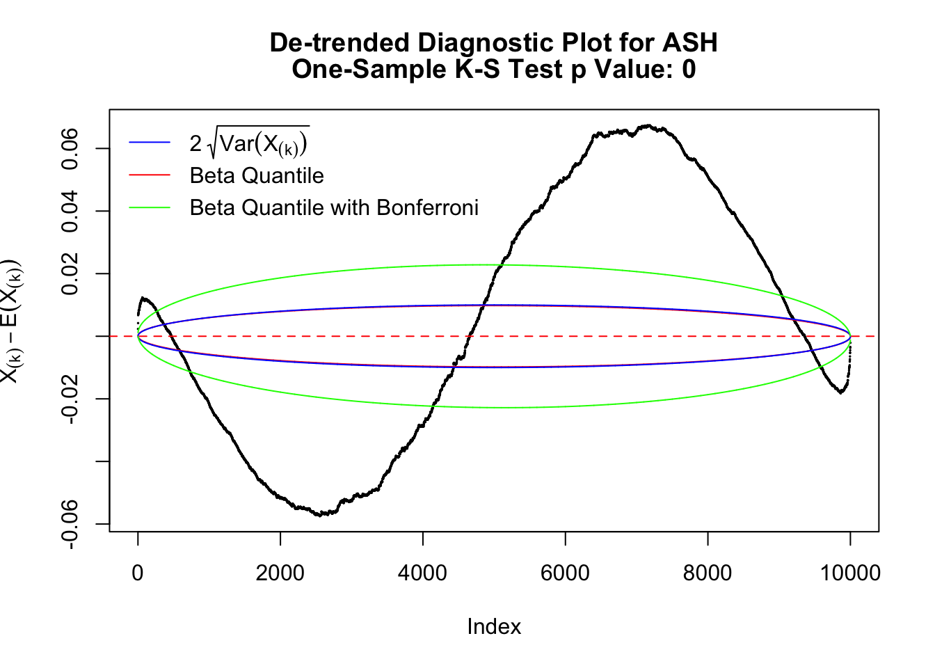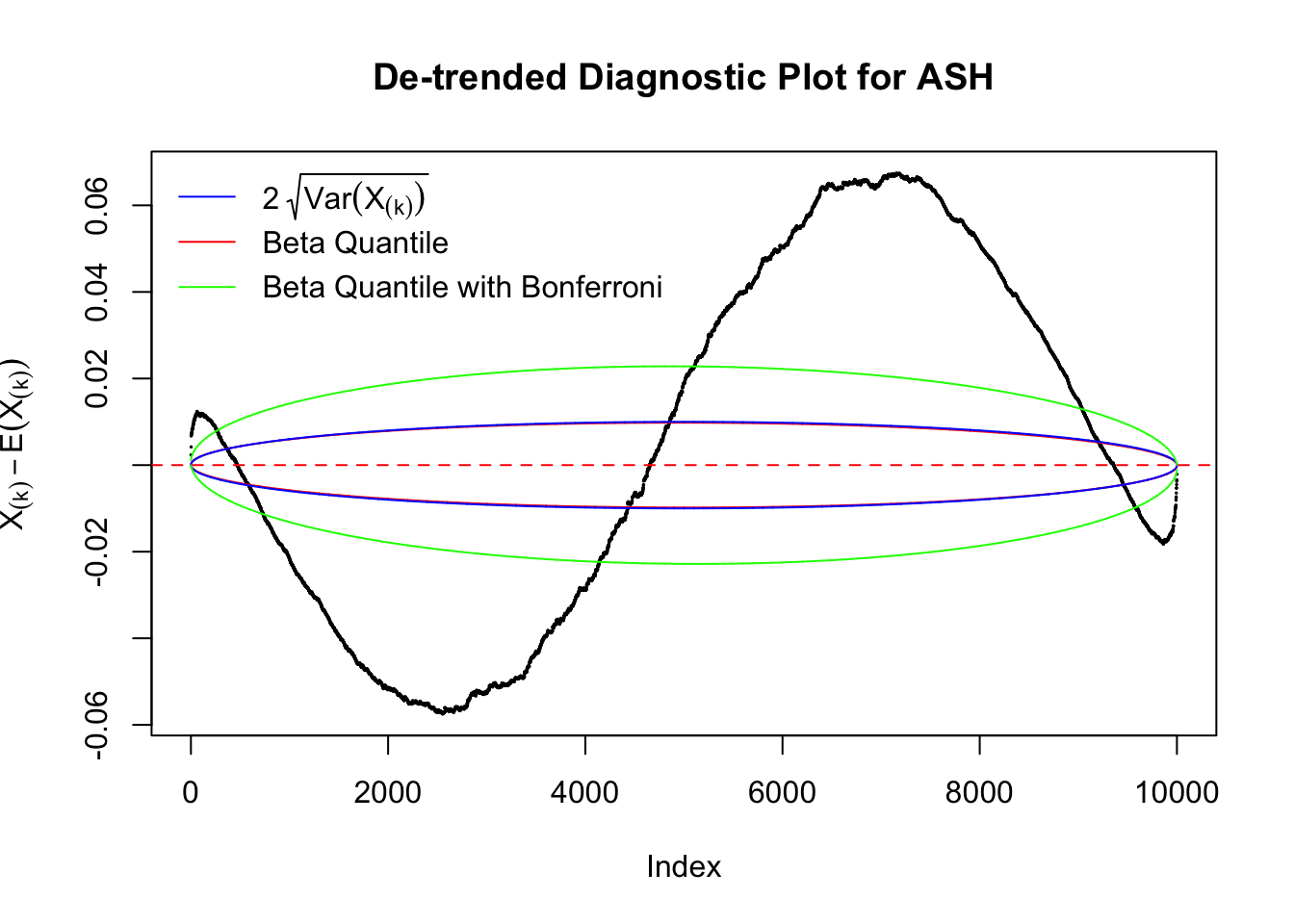 Therefore, we can plot \(X_{(k)} - E\left[X_{(k)}\right]\) along with two error bounds. One choice of the error bounds is to use \(\pm2\sqrt{Var\left(X_{(k)}\right)}\) (in blue); another is to use the \(\alpha / 2\) and \(1-\alpha/2\) quantiles of \(\text{Beta}\left(k, n+1-k\right)\) (in red). Points outside the error bounds thus indicate deviation from the uniform distribution. This plot can be called the de-trended plot.