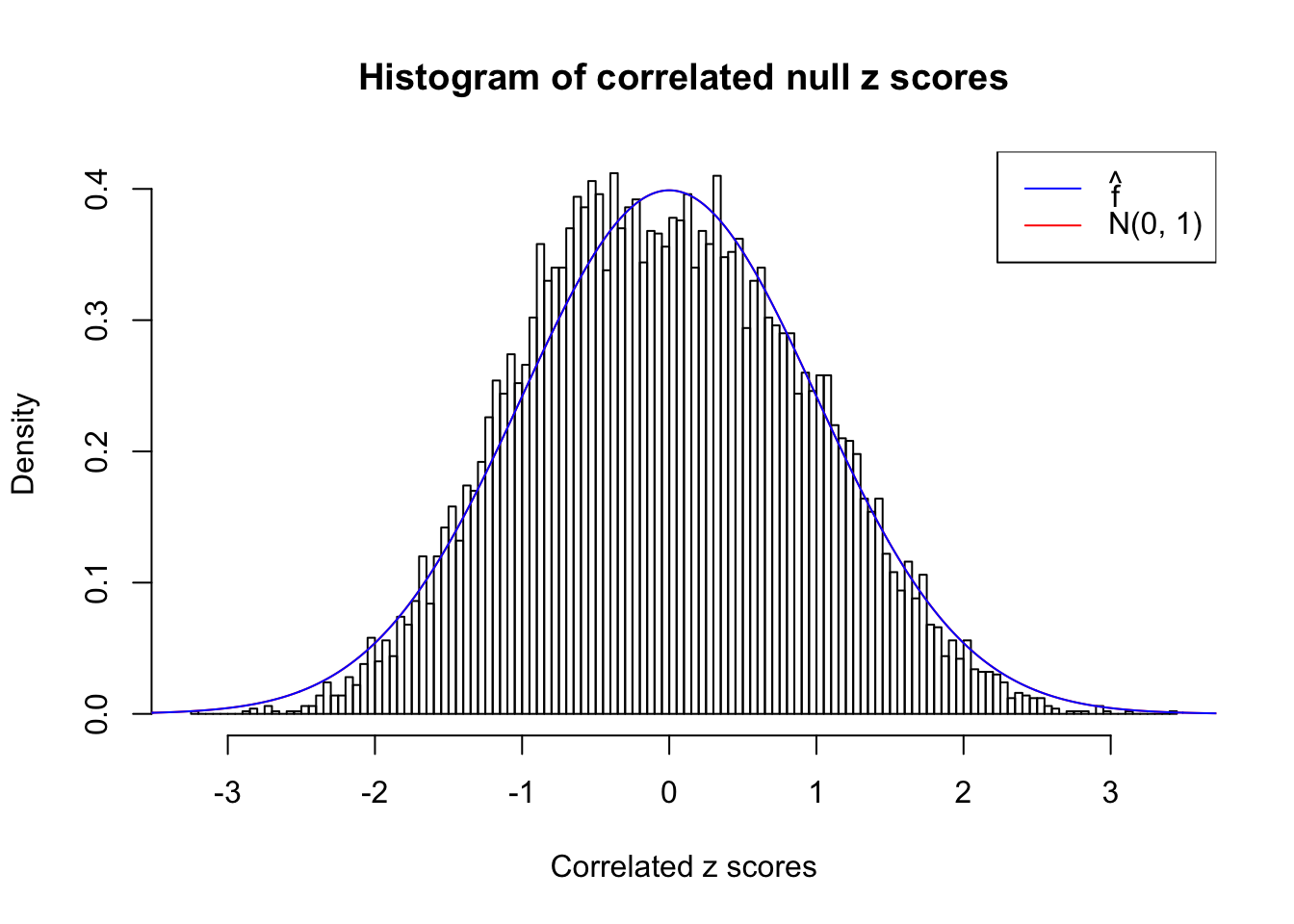 As an example, here is a data set of \(10K\) null \(z\) scores distorted by correlation. We apply ASH to this data set. Since the empirical distribution of these \(z\) scores are highly non-normal due to correlation, presumably ASH with normal prior components and normal likelihood wouldn’t fit this data set well.