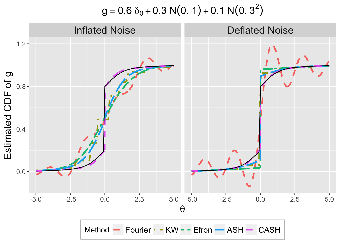 labs(x = expression(theta), y = "Estimated CDF of g", title = expression(g == 0.6~delta[0] + 0.3~N(0, 1) + 0.1~N(0, 3^2))) +