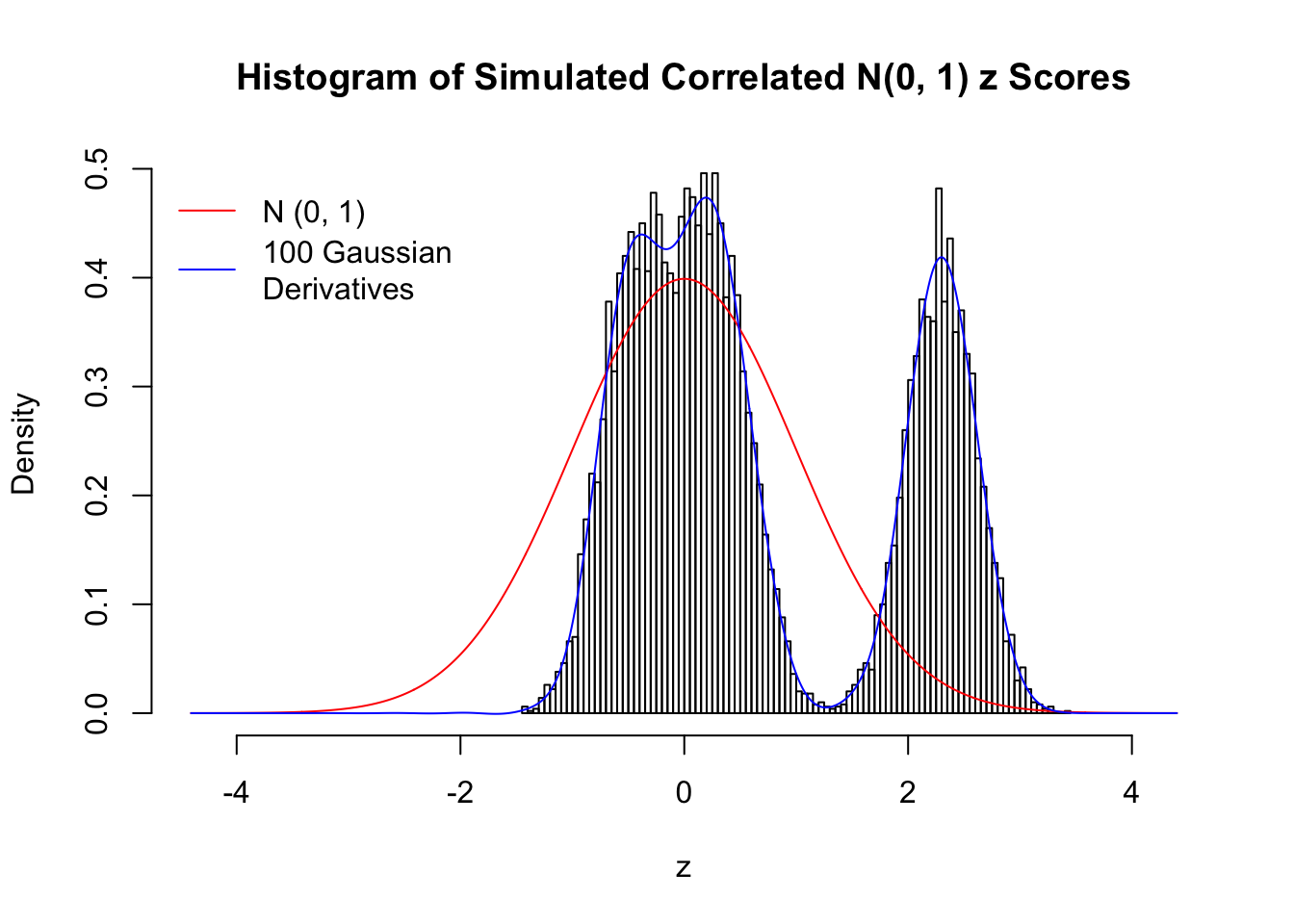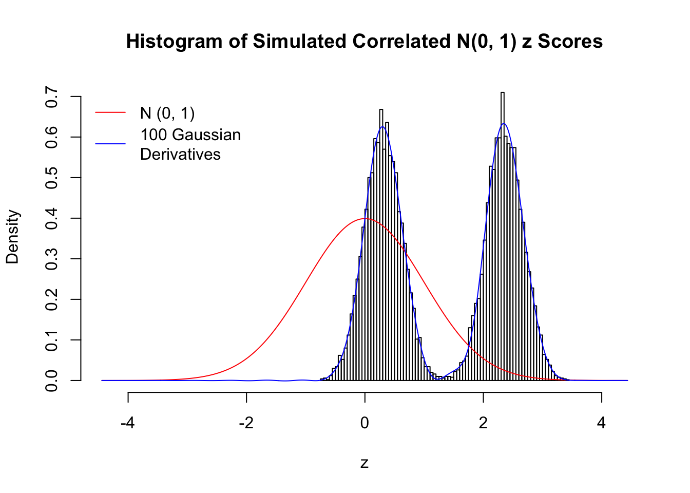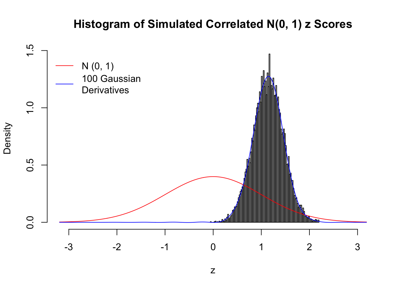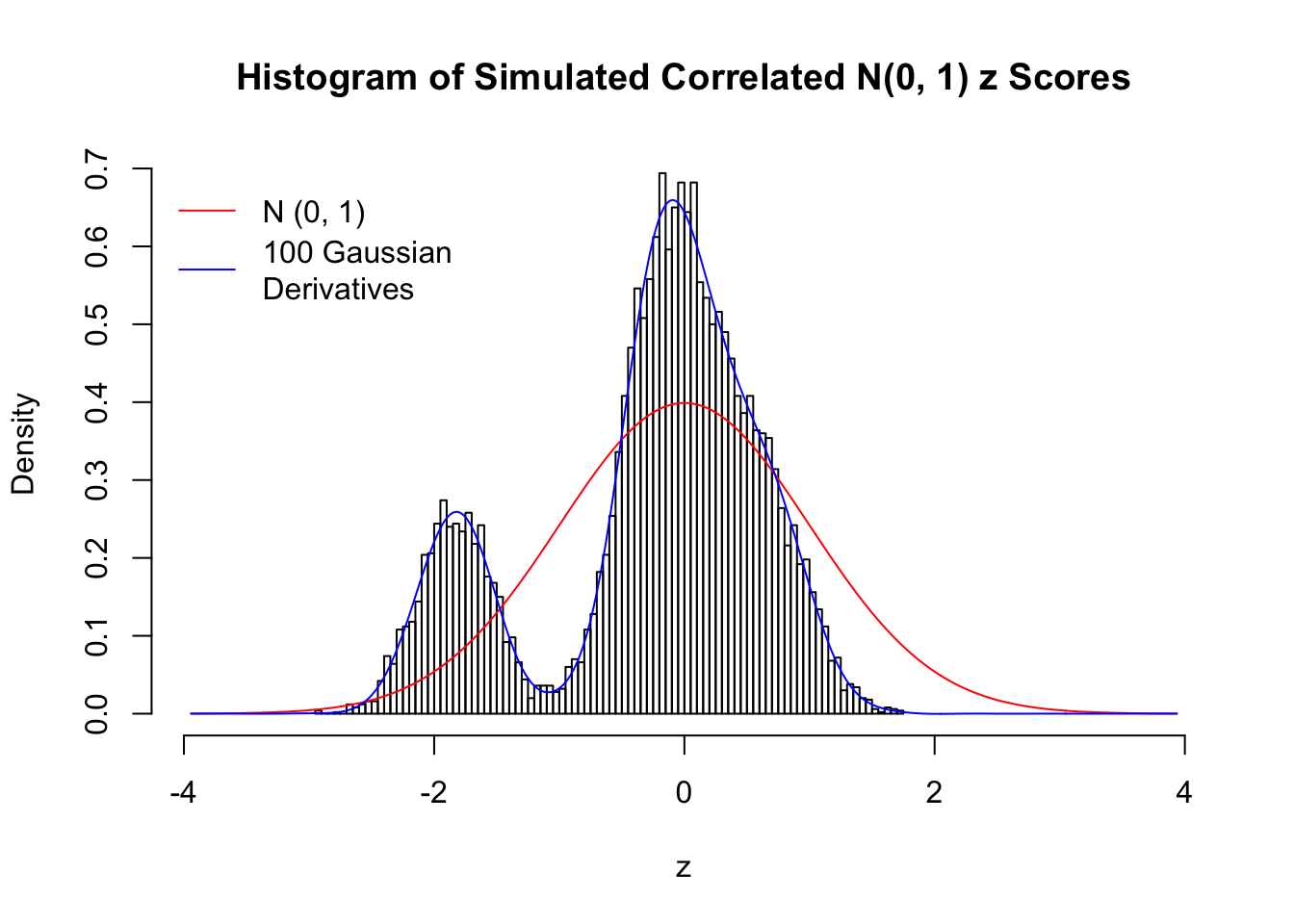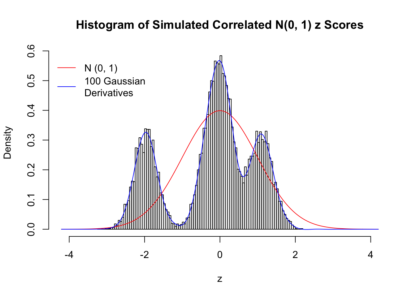 Despite his theory on the connection between Gaussian derivatives and empirical distributions of correlated null \(z\) scores, Dr. Schwartzman in his own research used Gaussian mixtures instead of Gaussian derivatives to fit the empirical distribution. A motivating example of his is a large number of marginally \(N\left(0, 1\right)\) \(z\) scores that are closely correlated with each other within one group, but independent between groups. We now show that data simulated in this way can also be fitted by Gaussian derivatives by the method of moments. To be specific, let \(n\) standard normal random samples be in \(K\) groups, in each group \(k\), given \(x_k\), \(y_{ki}\) iid \(N\left(0, 1\right)\),