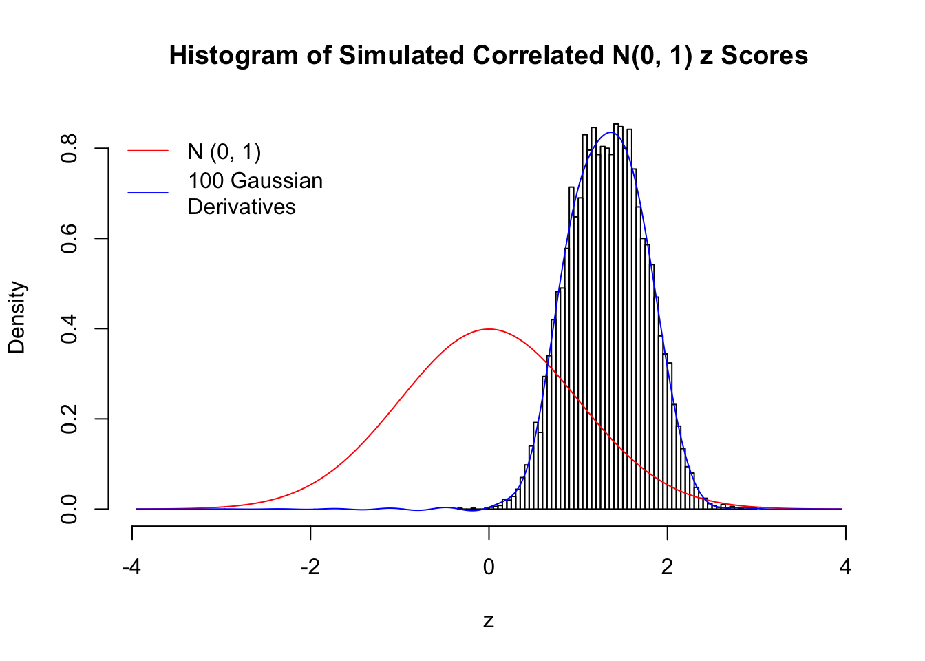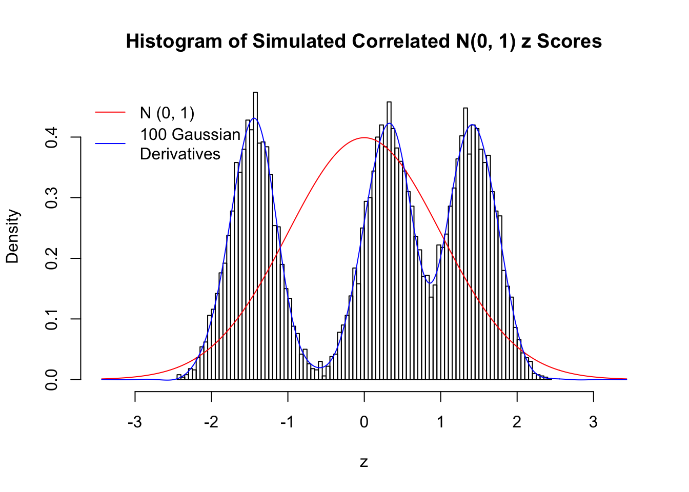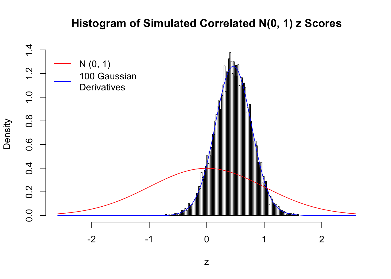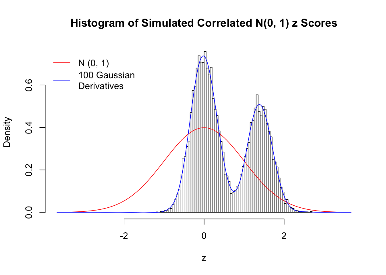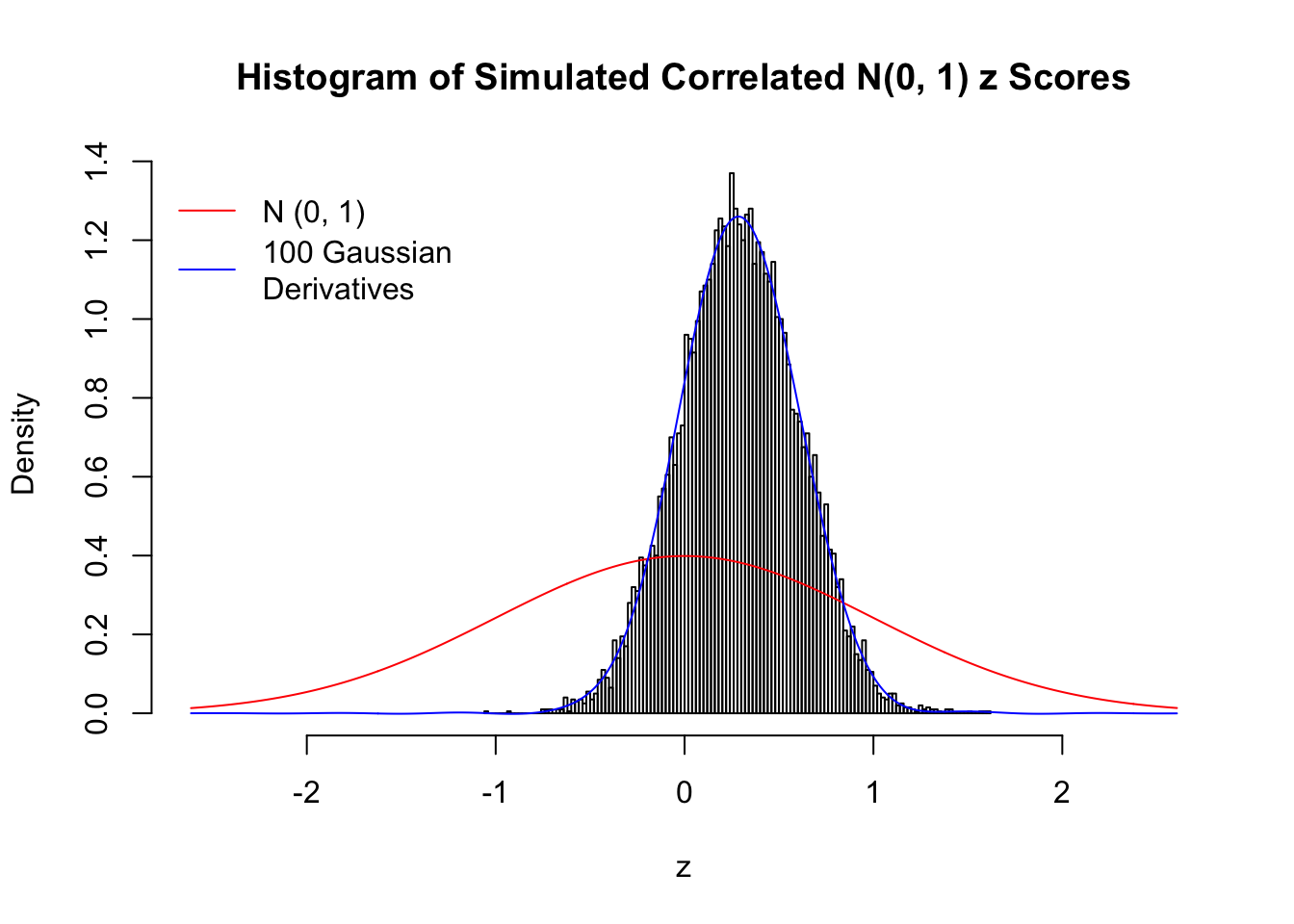 Despite his theory on the connection between Gaussian derivatives and empirical distributions of correlated null \(z\) scores, Dr. Schwartzman in his own research used Gaussian mixtures instead of Gaussian derivatives to fit the empirical distribution. A motivating example of his is a large number of marginally \(N\left(0, 1\right)\) \(z\) scores that are closely correlated with each other within one group, but independent between groups. We now show that data simulated in this way can also be fitted by Gaussian derivatives by the method of moments. To be specific, let \(n\) standard normal random samples be in \(K\) groups, in each group \(k\), given \(x_k\), \(y_{ki}\) iid \(N\left(0, 1\right)\),