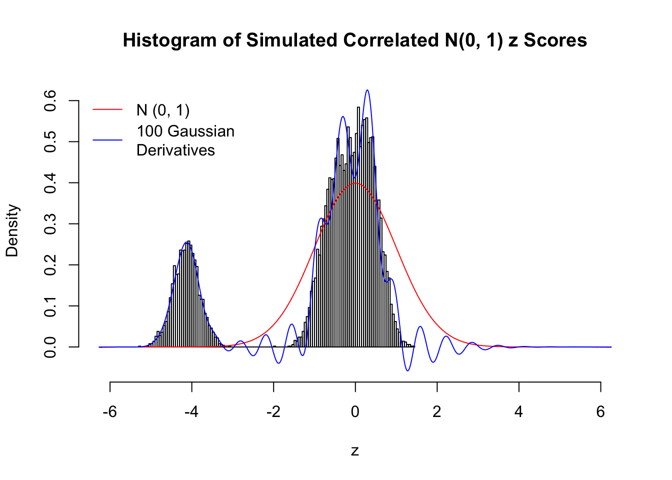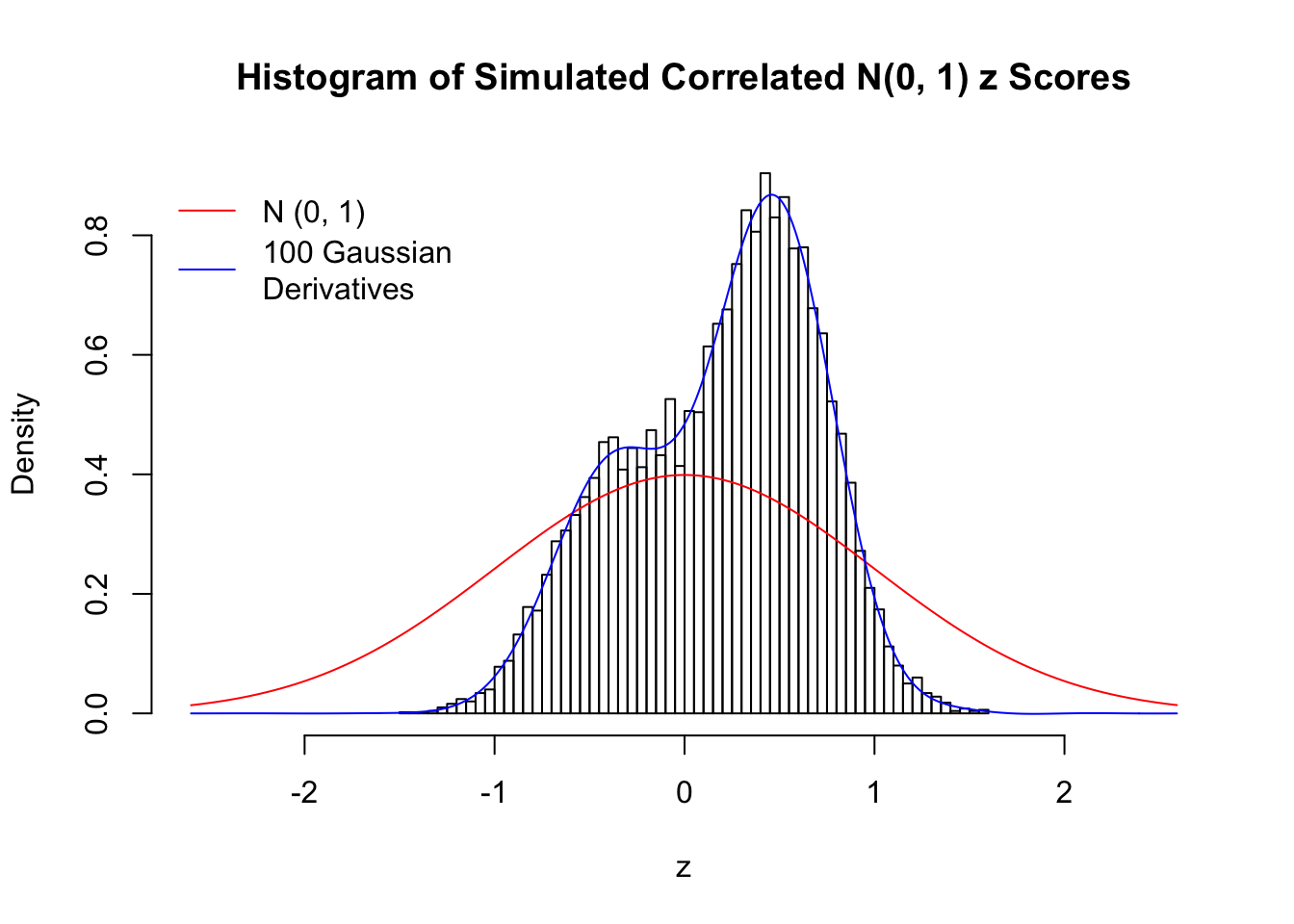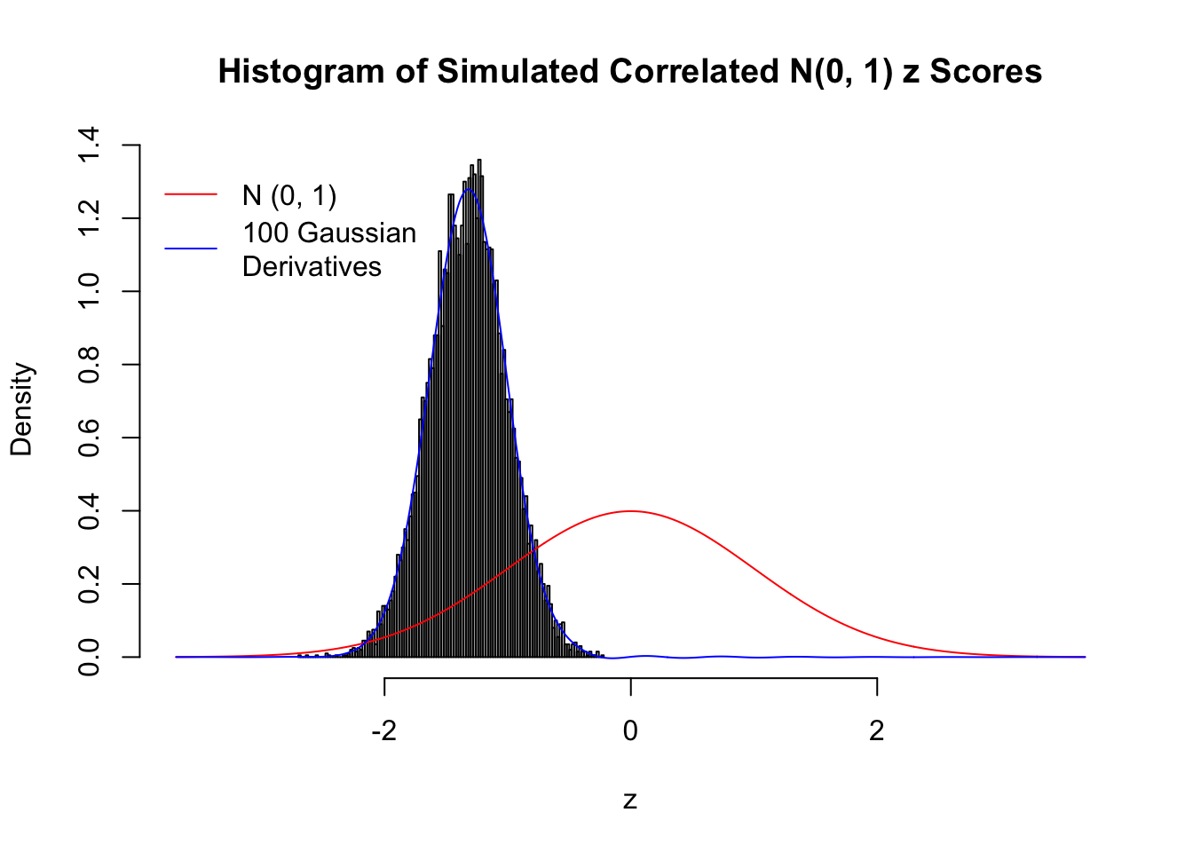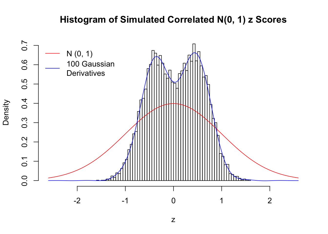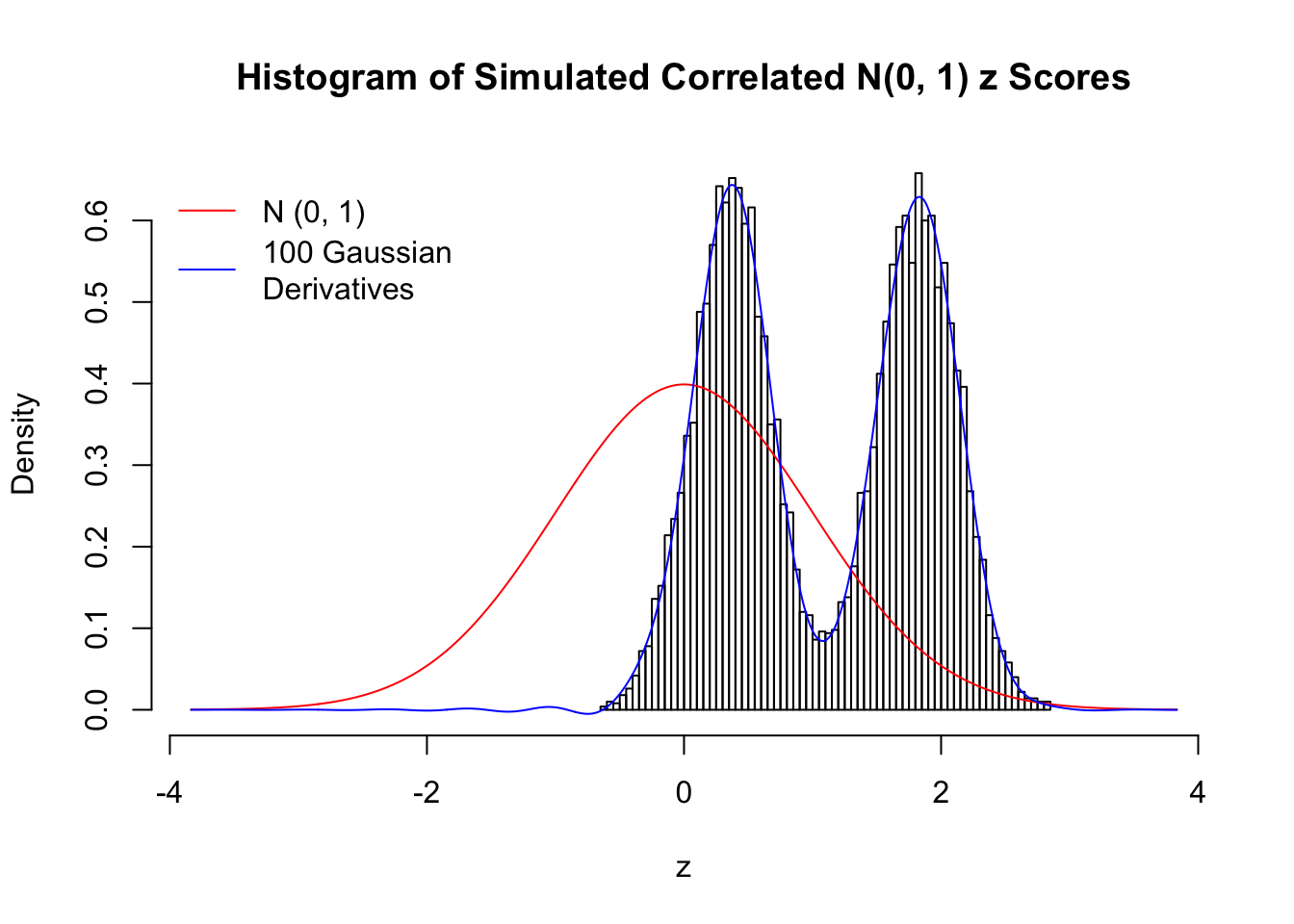 Despite his theory on the connection between Gaussian derivatives and empirical distributions of correlated null \(z\) scores, Dr. Schwartzman in his own research used Gaussian mixtures instead of Gaussian derivatives to fit the empirical distribution. A motivating example of his is a large number of marginally \(N\left(0, 1\right)\) \(z\) scores that are closely correlated with each other within one group, but independent between groups. We now show that data simulated in this way can also be fitted by Gaussian derivatives by the method of moments. To be specific, let \(n\) standard normal random samples be in \(K\) groups, in each group \(k\), given \(x_k\), \(y_{ki}\) iid \(N\left(0, 1\right)\),