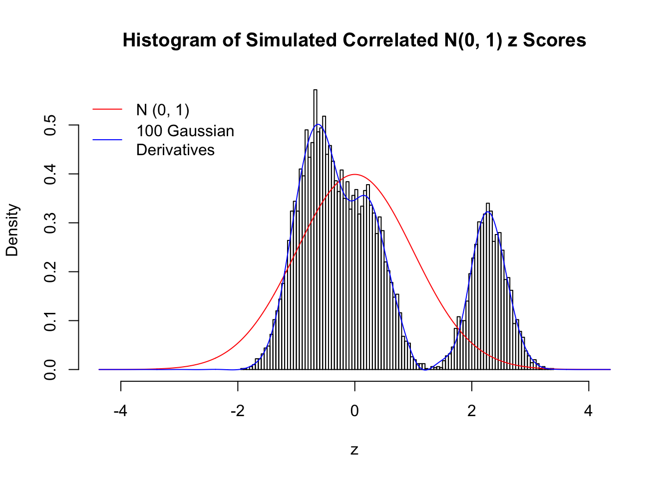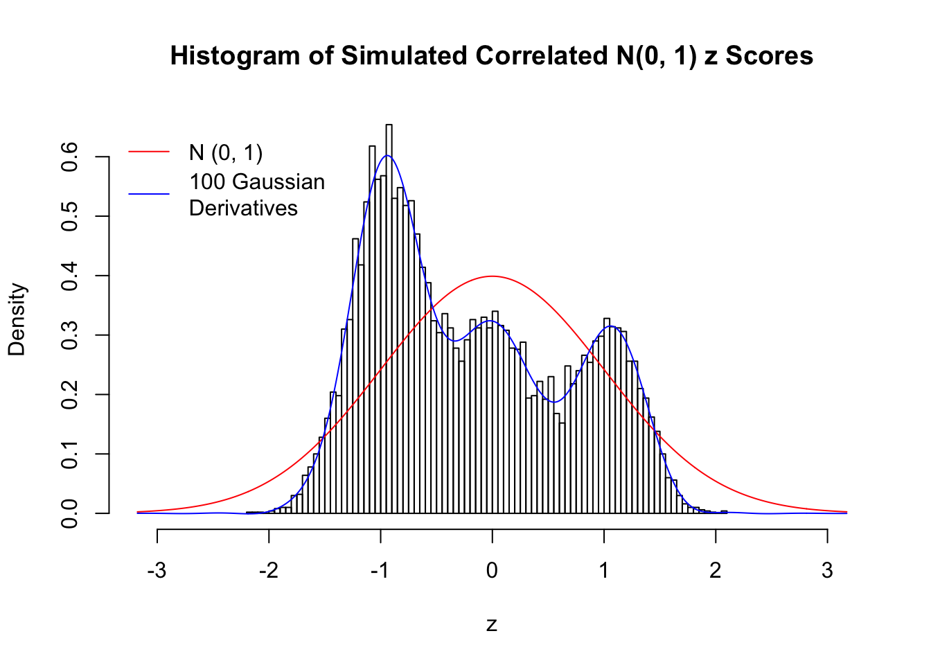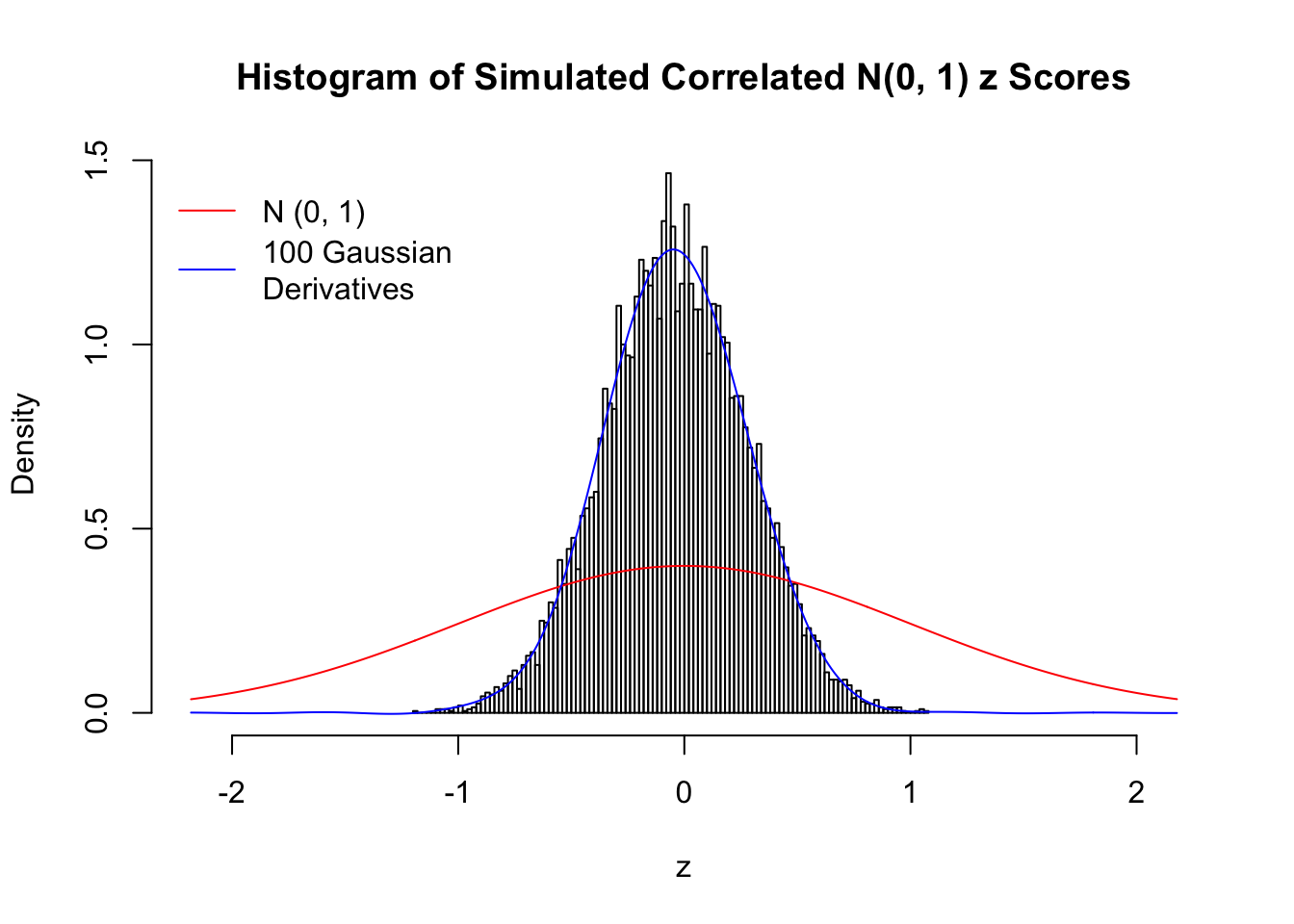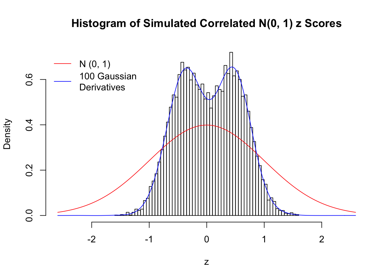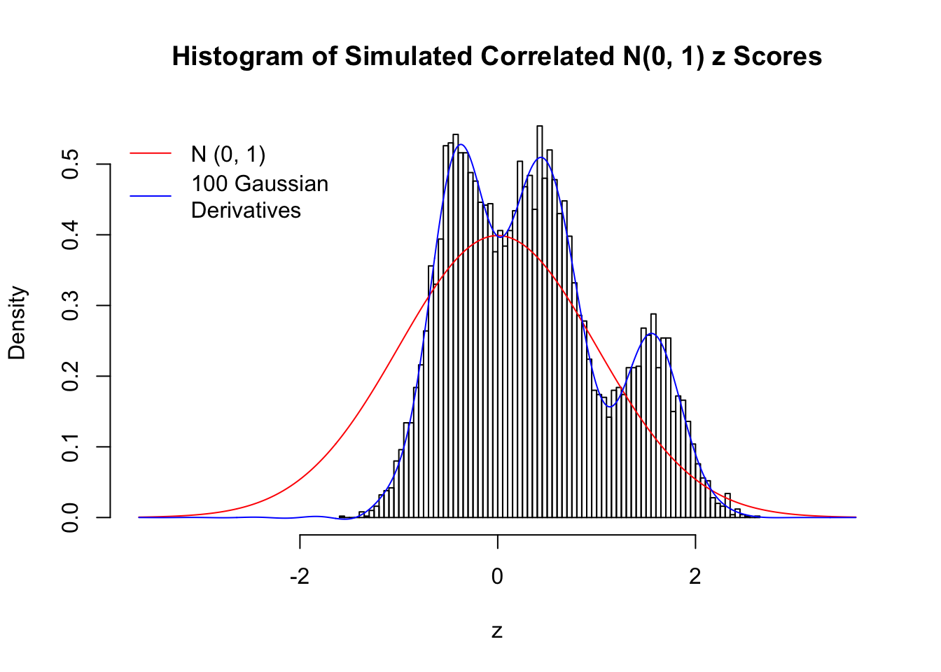Despite his theory on the connection between Gaussian derivatives and empirical distributions of correlated null \(z\) scores, Dr. Schwartzman in his own research used Gaussian mixtures instead of Gaussian derivatives to fit the empirical distribution. A motivating example of his is a large number of marginally \(N\left(0, 1\right)\) \(z\) scores that are closely correlated with each other within one group, but independent between groups. We now show that data simulated in this way can also be fitted by Gaussian derivatives by the method of moments. To be specific, let \(n\) standard normal random samples be in \(K\) groups, in each group \(k\), given \(x_k\), \(y_{ki}\) iid \(N\left(0, 1\right)\),