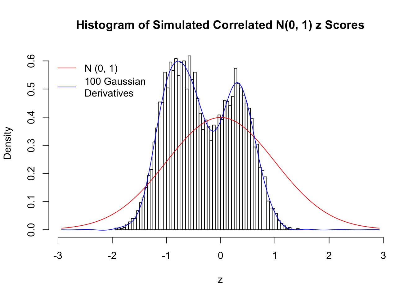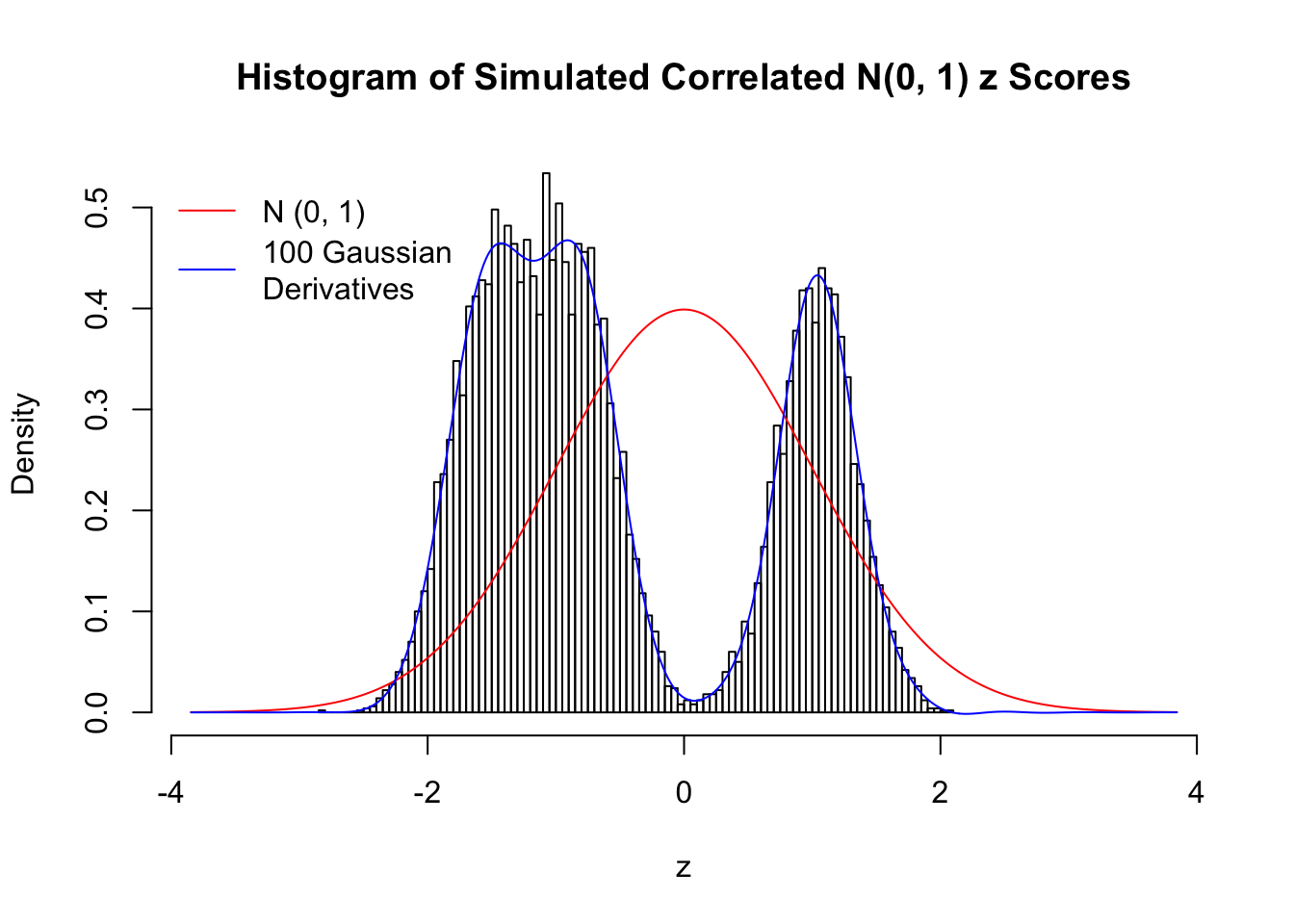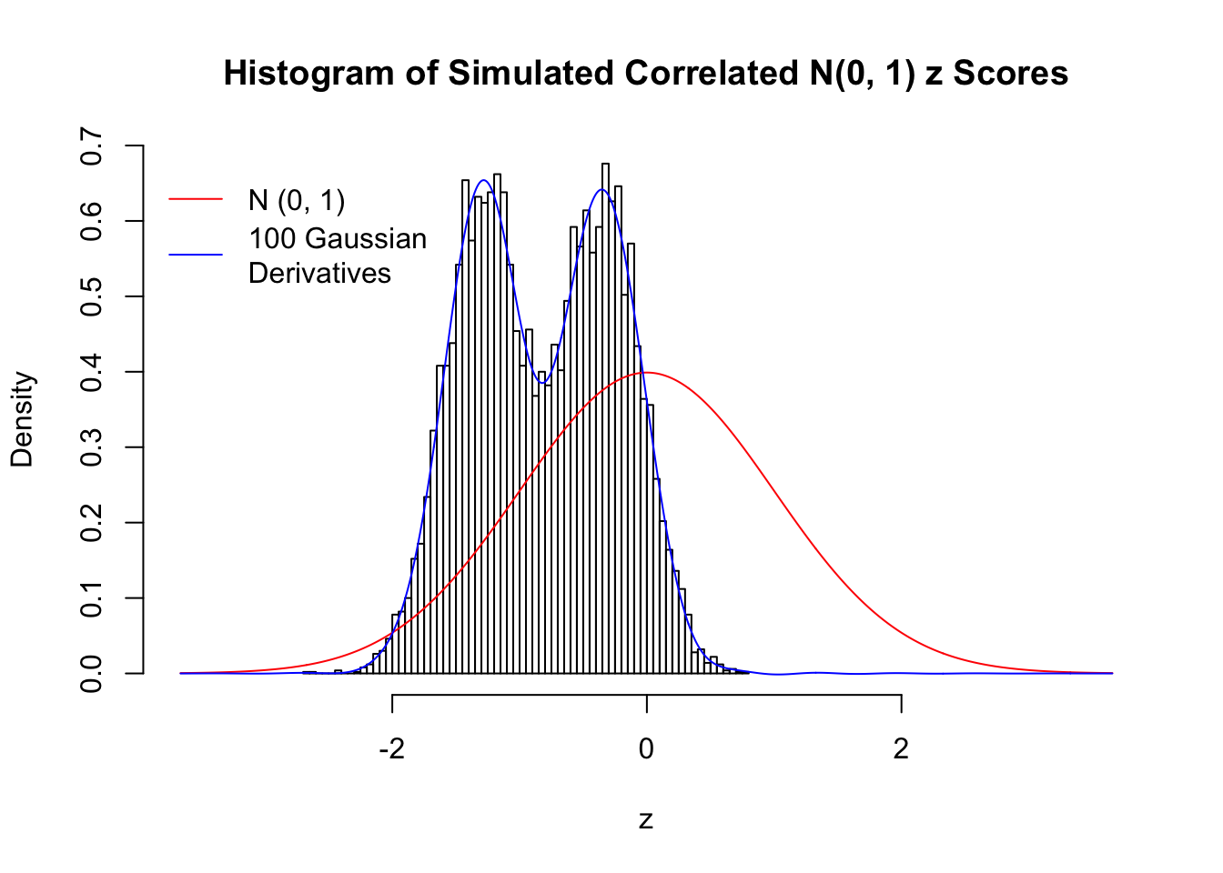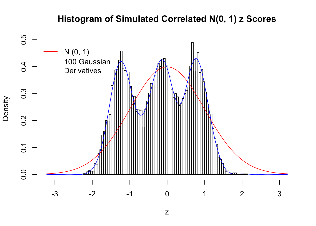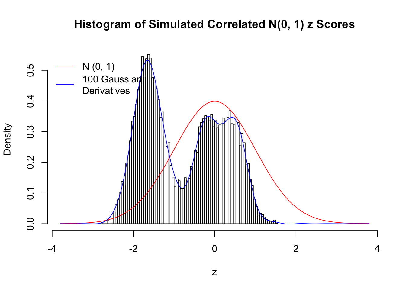 Despite his theory on the connection between Gaussian derivatives and empirical distributions of correlated null \(z\) scores, Dr. Schwartzman in his own research used Gaussian mixtures instead of Gaussian derivatives to fit the empirical distribution. A motivating example of his is a large number of marginally \(N\left(0, 1\right)\) \(z\) scores that are closely correlated with each other within one group, but independent between groups. We now show that data simulated in this way can also be fitted by Gaussian derivatives by the method of moments. To be specific, let \(n\) standard normal random samples be in \(K\) groups, in each group \(k\), given \(x_k\), \(y_{ki}\) iid \(N\left(0, 1\right)\),