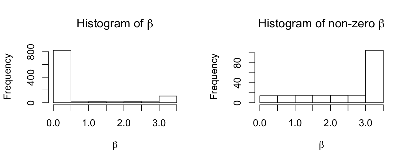 In the following simulations, we always have \(n = 3000\), \(p = 1000\), \(X_{n \times p}\) has independent columns simulated from \(N(0, 1)\) and then normalized to have \(\|X_j\|_2^2 \equiv 1\). For a certain \(\beta\), \(Y_n \sim N(X_{n\times p}\beta_p, I_n)\). Out of \(p = 1000\) \(\beta_j\)’s, here are three scenarios.