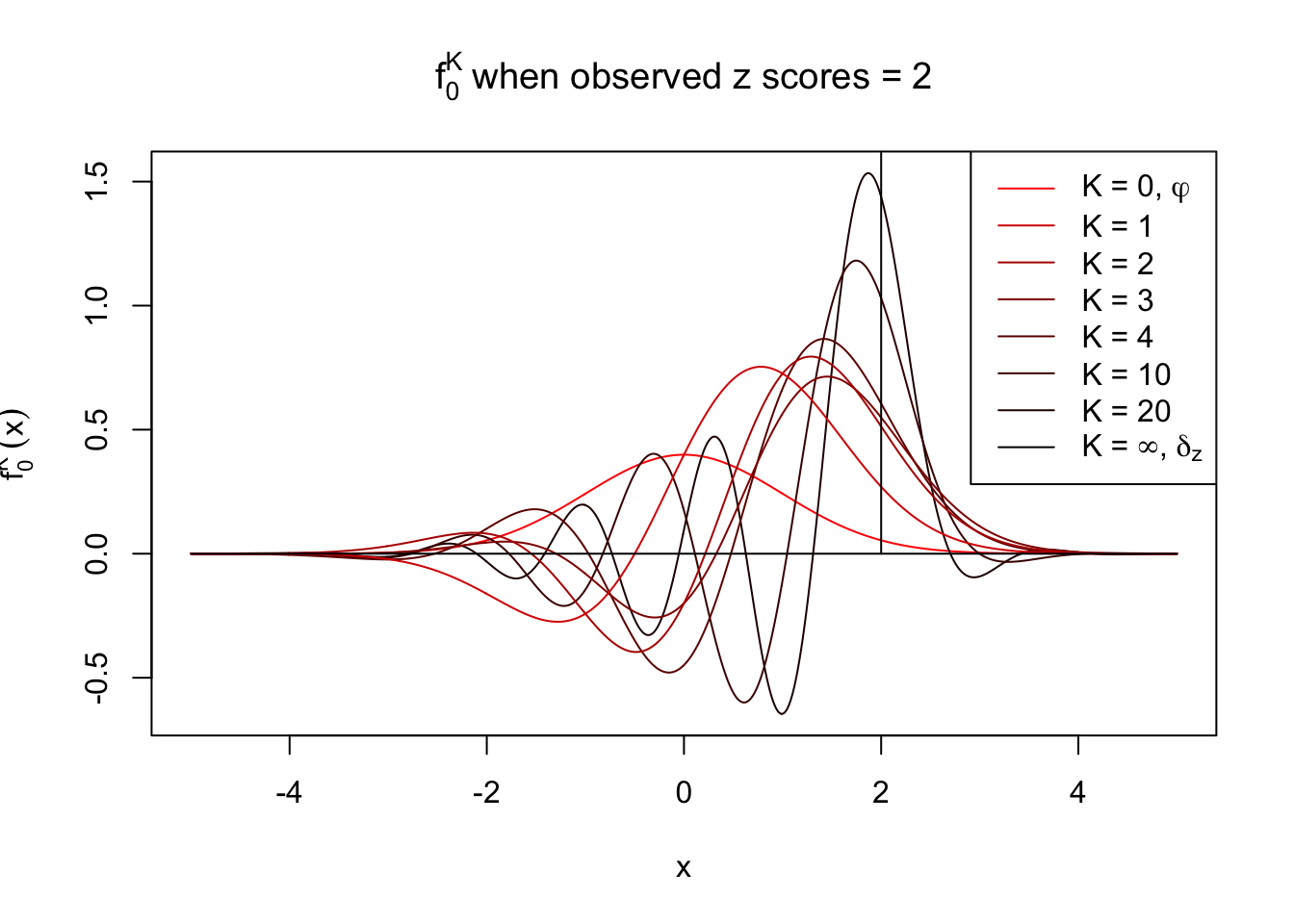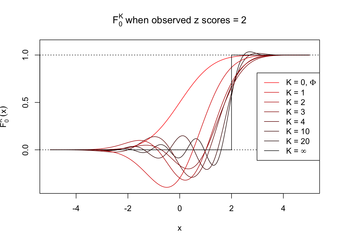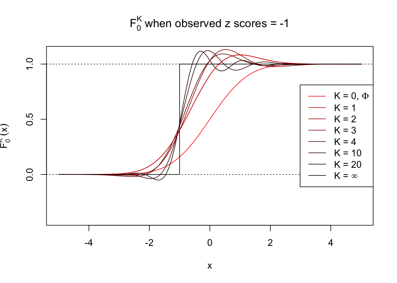 Theoretically, \(f_0^K\) is an approximation to empirical density of perfectly correlated \(z\) scores; hence, as \(K\to\infty\), \(f_0^K\to\delta_z\). Similarly, \(F_0^K\) is an approximation to empirical cdf of perfectly correlated \(z\) scores; hence, as \(K\to\infty\), \(f_0^K\) should converge to the \(0\)-\(1\) step function, and the location of the step is the observed \(z\).
